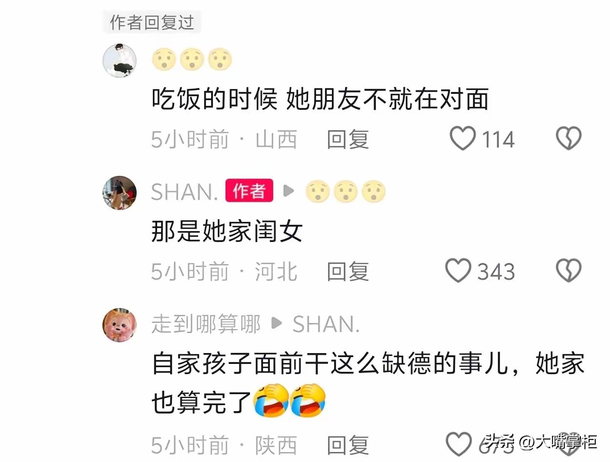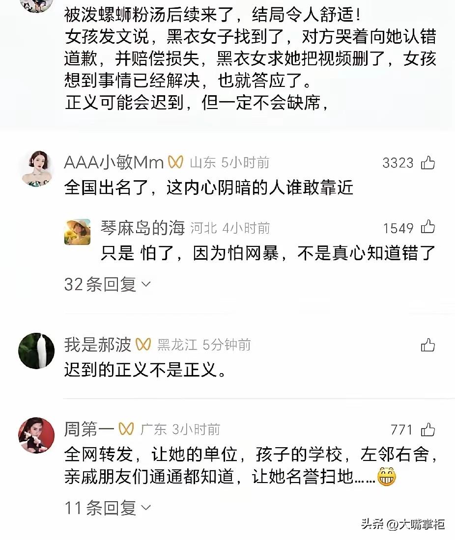 螺蛳粉店泼汤事件告一段落了,以黑衣女子道歉赔偿收尾,但事件远没有结束。 据知情人介绍,事发时坐在黑子女子对面的不是朋友,而是她闺女。 闺女亲眼看到妈妈使坏却没有制止,或者制止了没拦住,然后被全网抓了个现行,这让闺女怎么面对同学老师,同学老师又会怎么看她?有这样一个心理阴暗的母亲,谁还会和闺女做朋友? 归根到底,是大人德行有亏害了孩子,这个闺女乃至这个家庭,在很长一段时间都会被周围人指指点点,这对孩子的影响不会小。 但黑子女子做这个动作前,难道没有想到可能产生的后果?