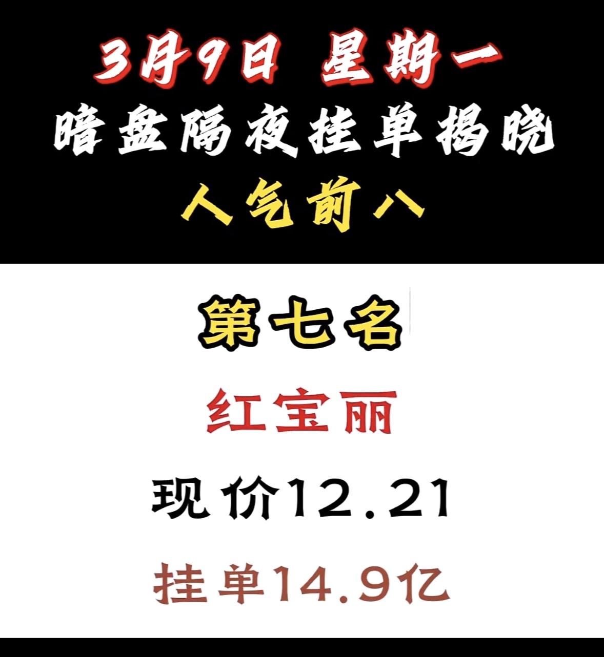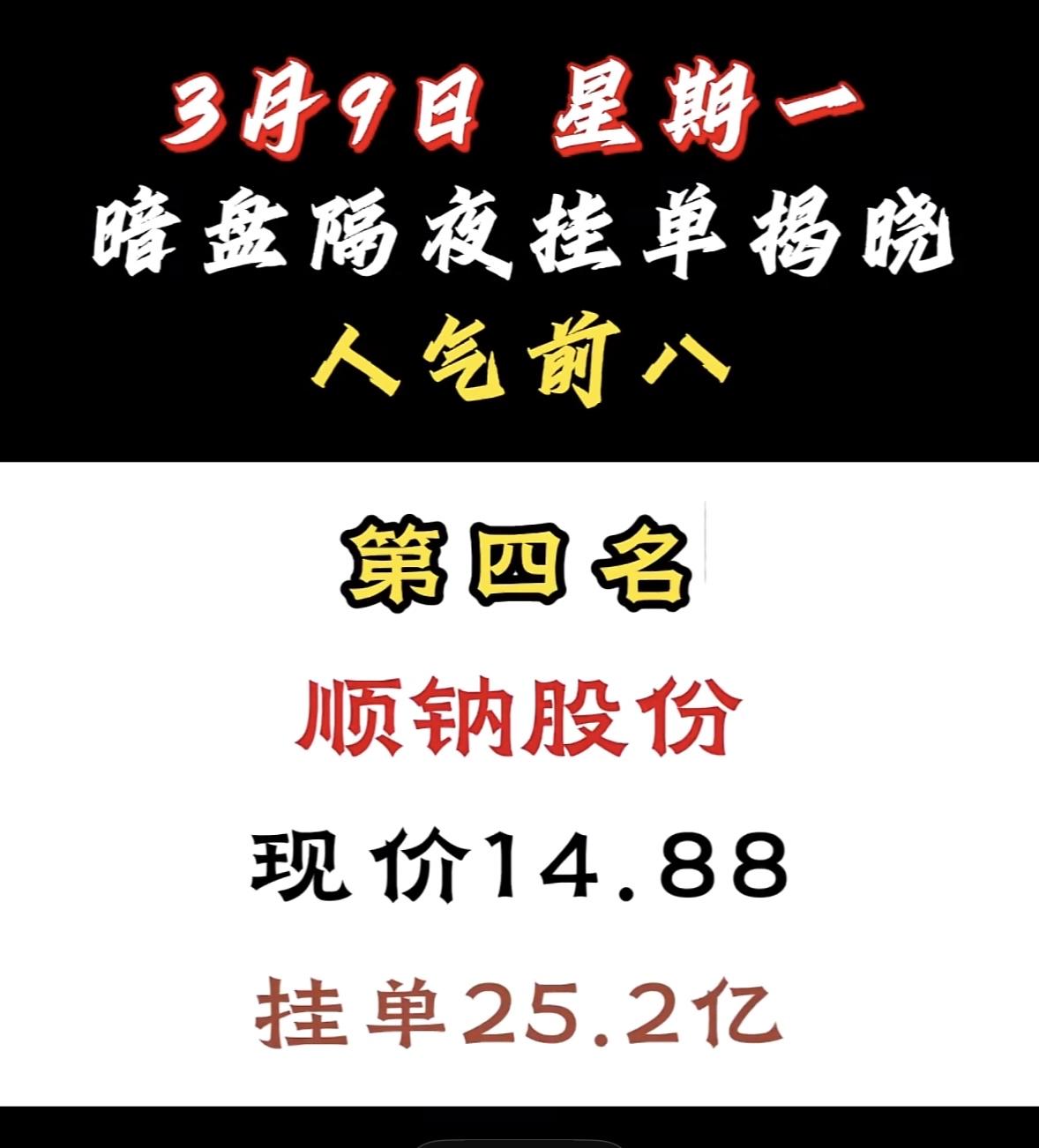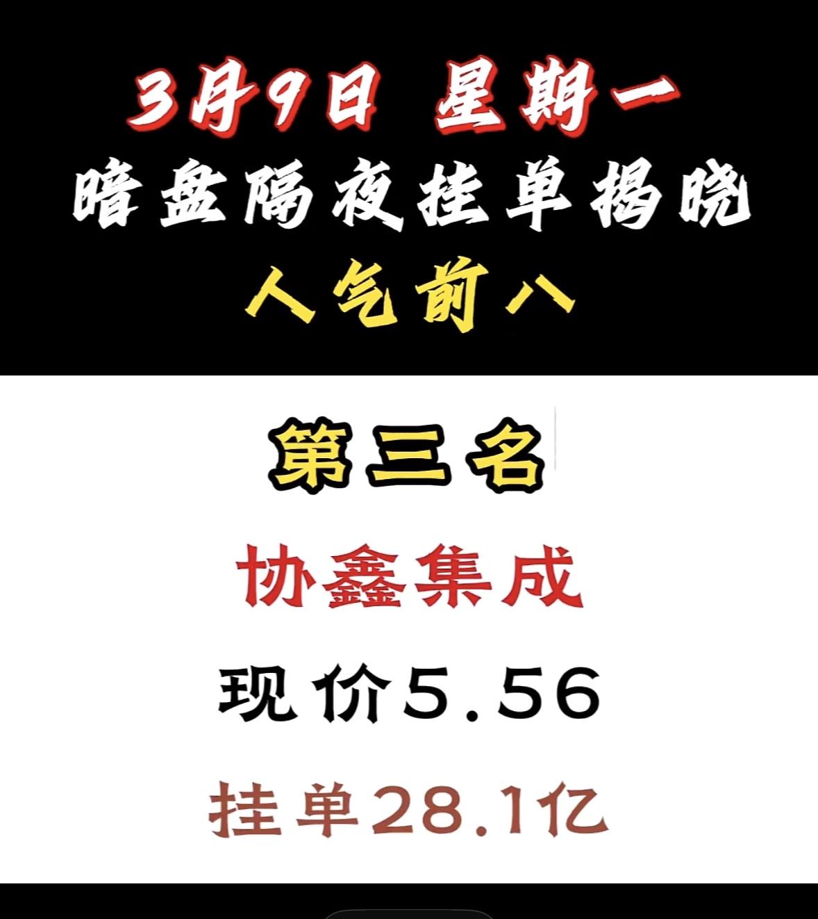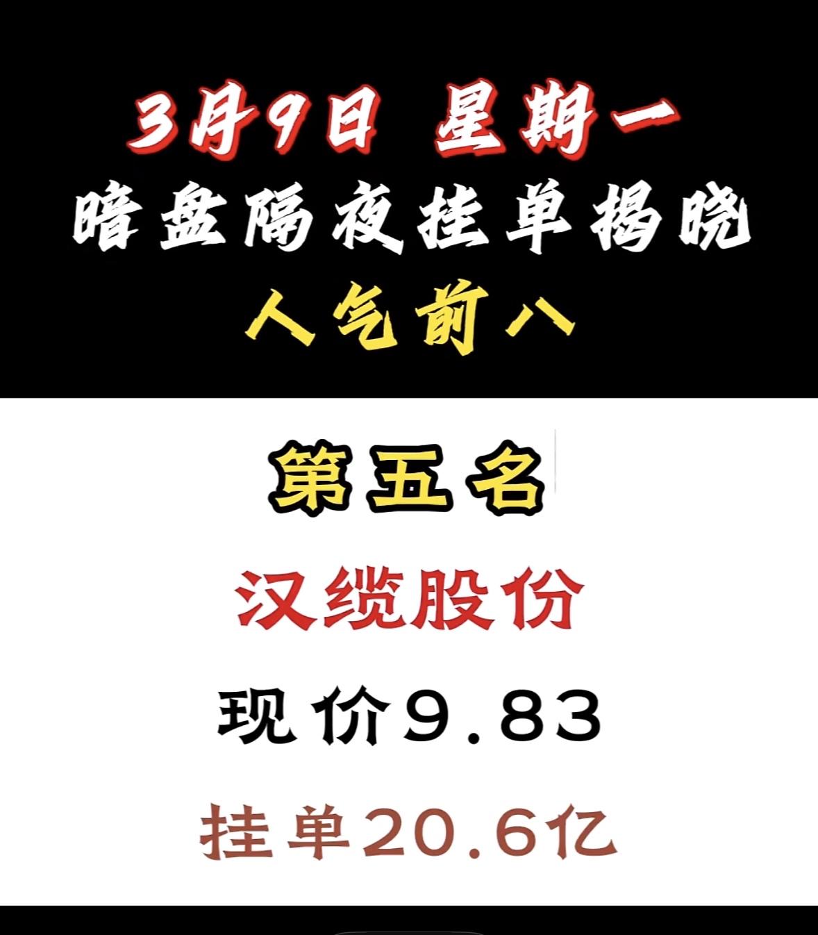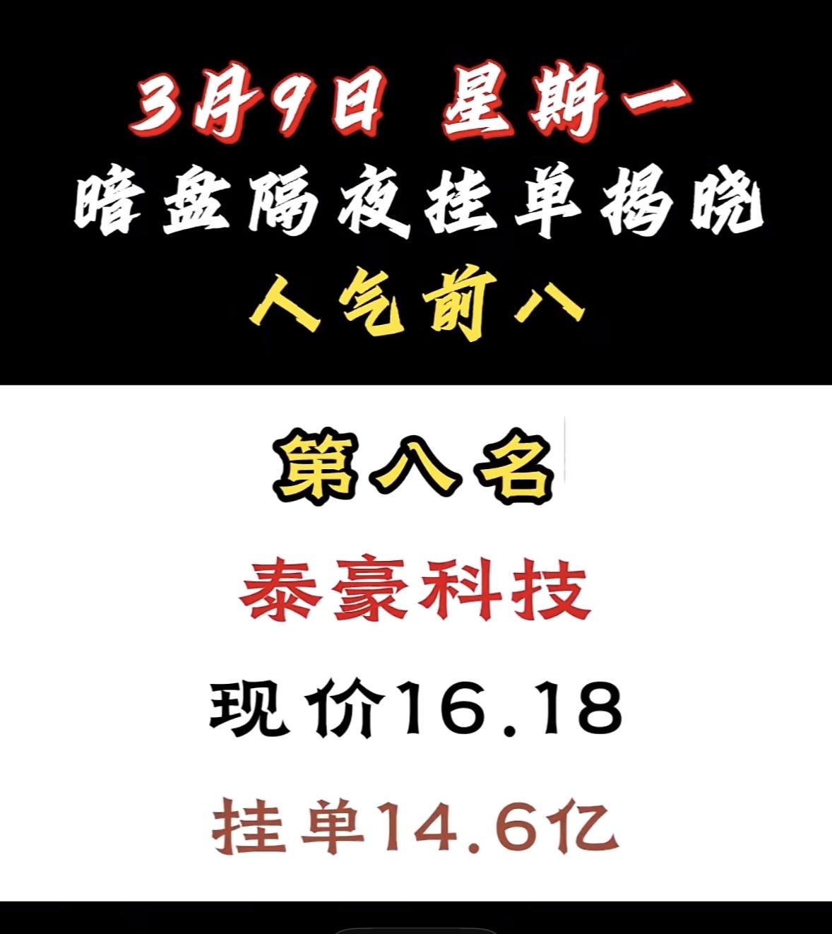 3月9日暗盘隔夜挂单前8名股票揭晓。 这可是股民关注的焦点。泰豪科技现价16.18,挂单达14.6亿,成功跻身人气前八。 再看看其他热门股,顺钠股份挂单56.34亿登顶,现价14.88元,市场预期超高;汉缆股份挂单48.66亿排第二,现价9.83元,电力设备板块里短线爆发力值得期待;协鑫集成现价5.56元,挂单43.78亿,低价潜力大。这些股票被资金疯抢,短线交易就看资金动向,不知道这里面有没有你关注的呢?