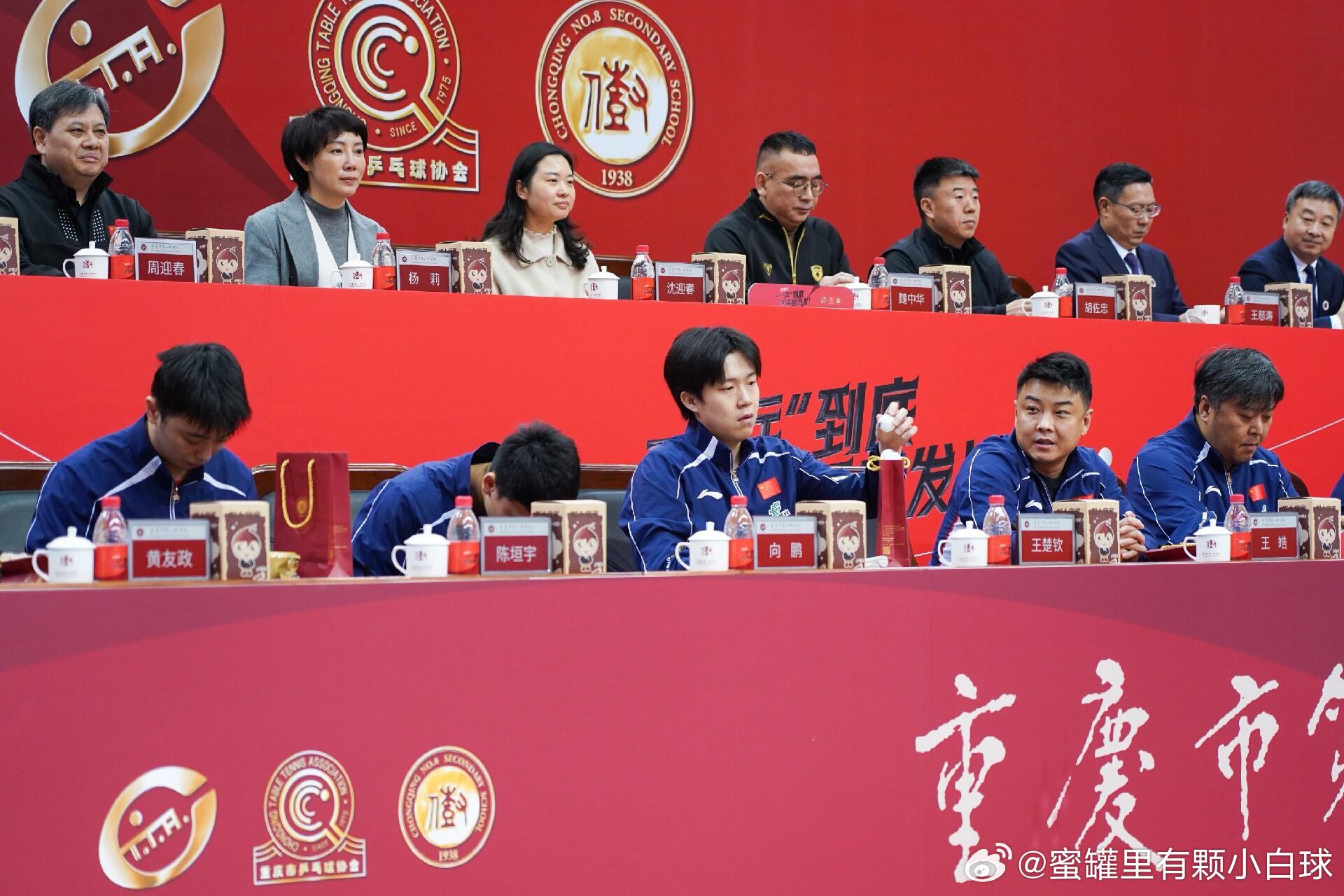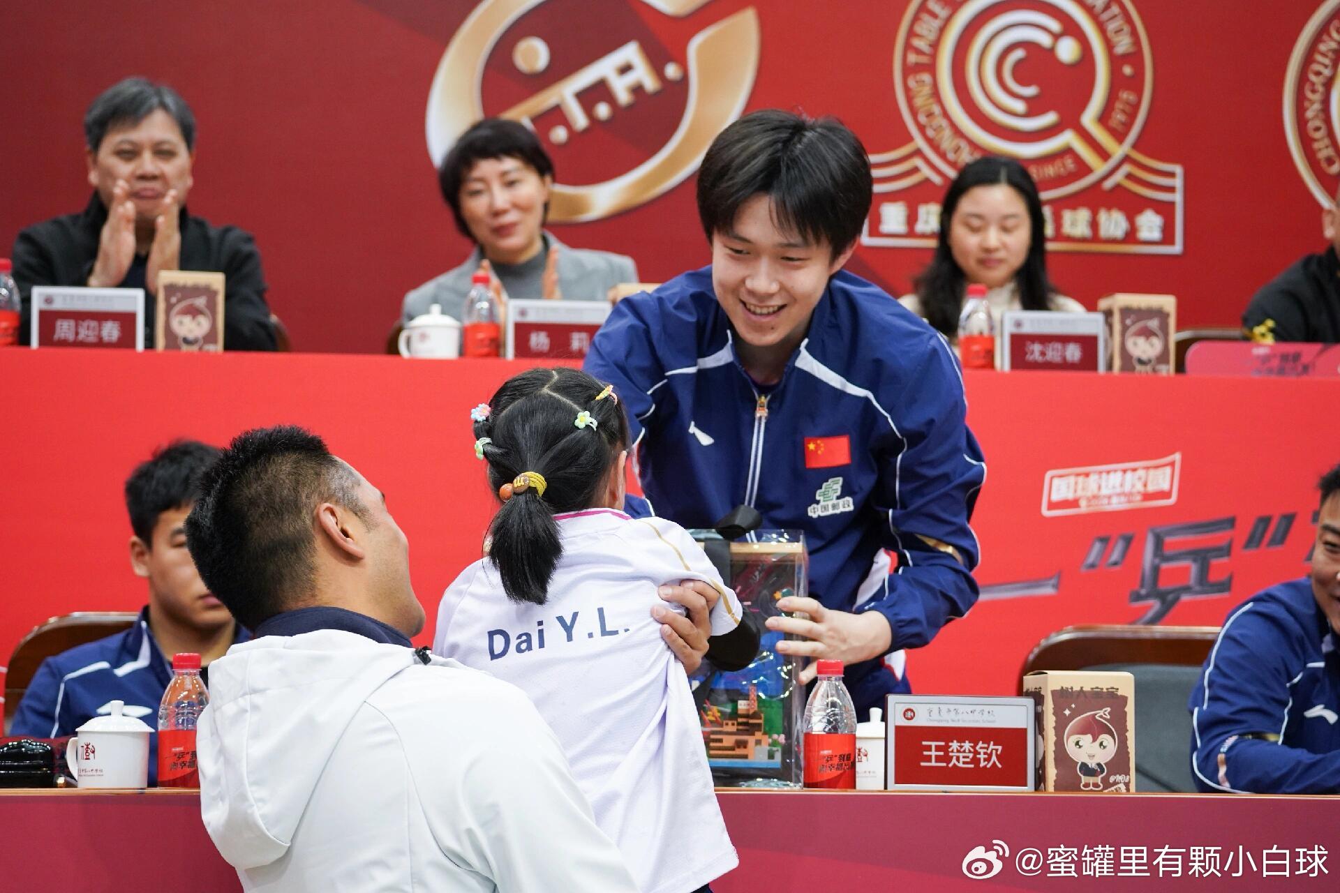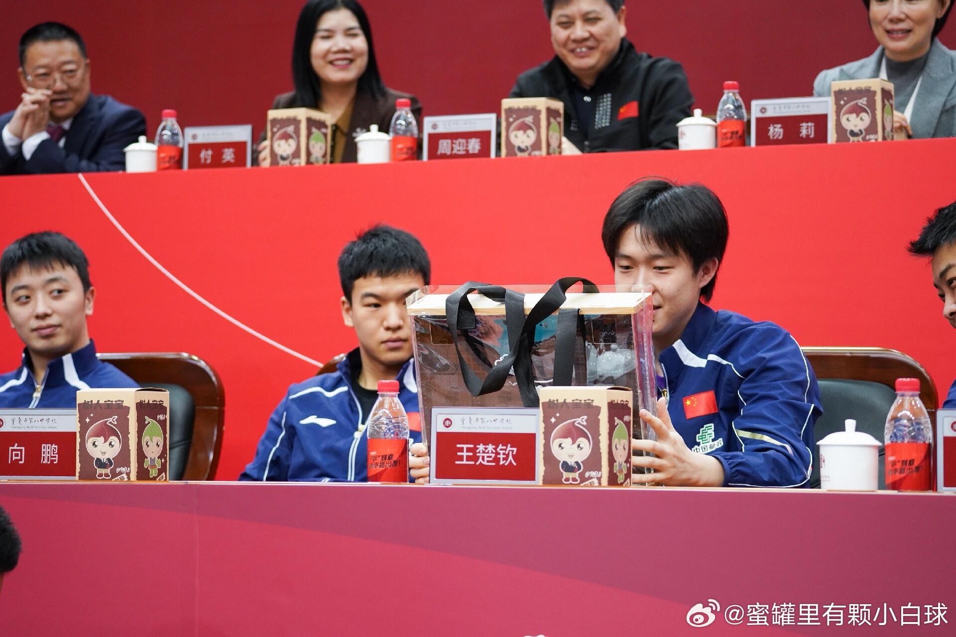 王楚钦收到9岁粉丝的礼物,赶紧起身双手接礼物,并握手感谢,就连后边的领导都