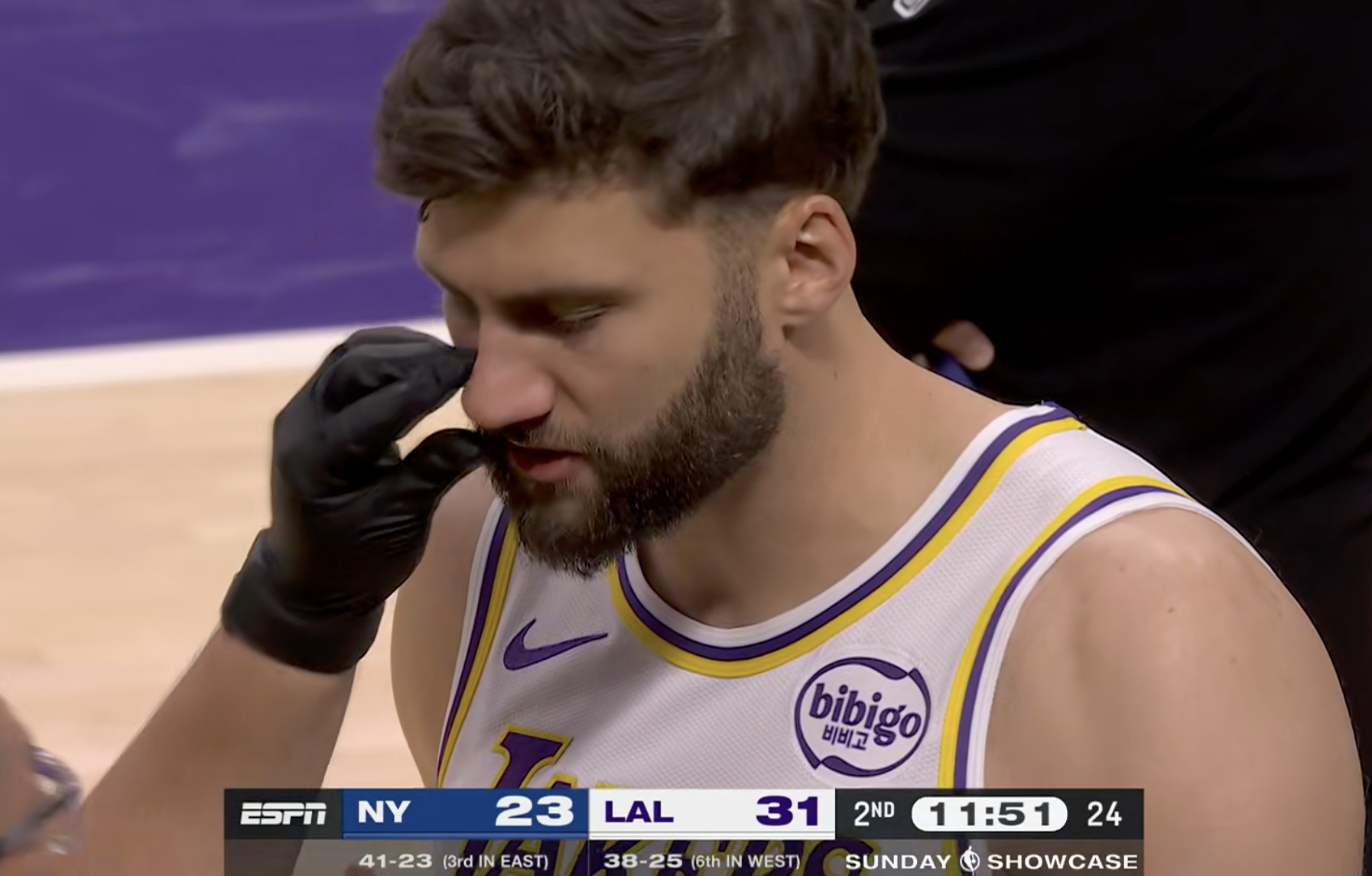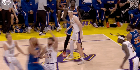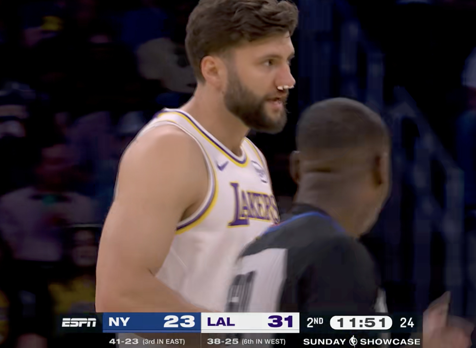 克勒贝尔鼻子被打出血,这球裁判给了他犯规,唐斯2罚全中!尼克斯vs湖人