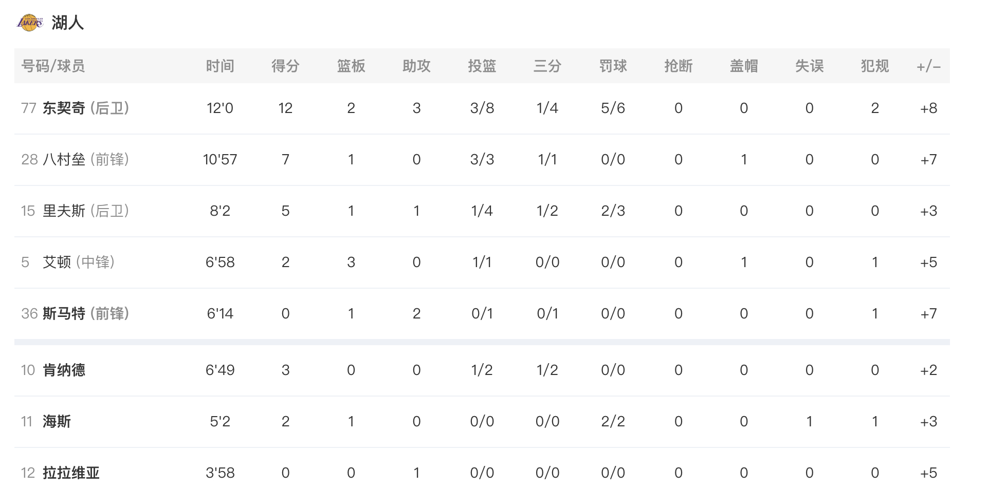 东契奇12分2篮板3助攻,里夫斯5分1篮板1助攻,艾顿2分3篮板,八村7分1篮板,肯纳德3分,海斯2分1篮板,斯玛特1篮板2助攻。
