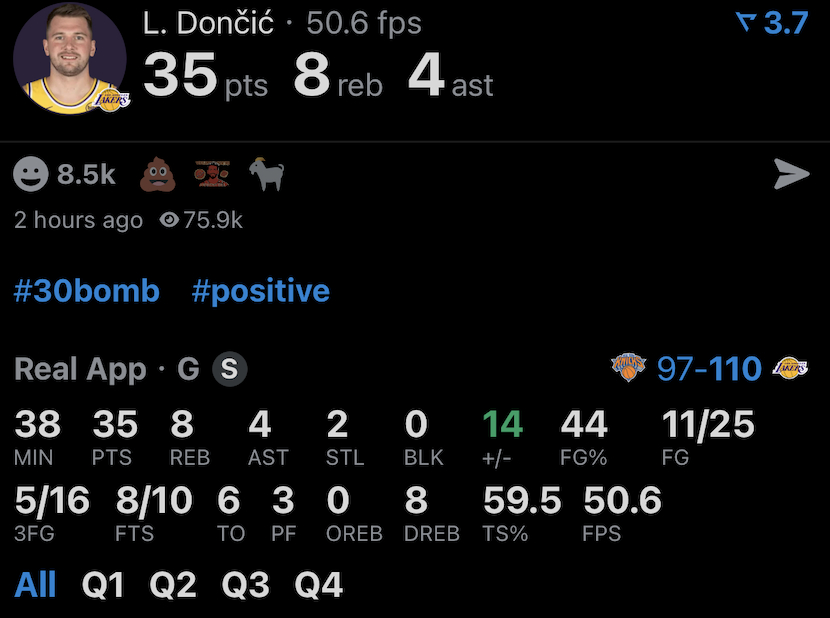 今天的东契奇:25投11中 三分球16中5 罚球10中835分8篮板4助攻2抢断6失误尼克斯vs湖人