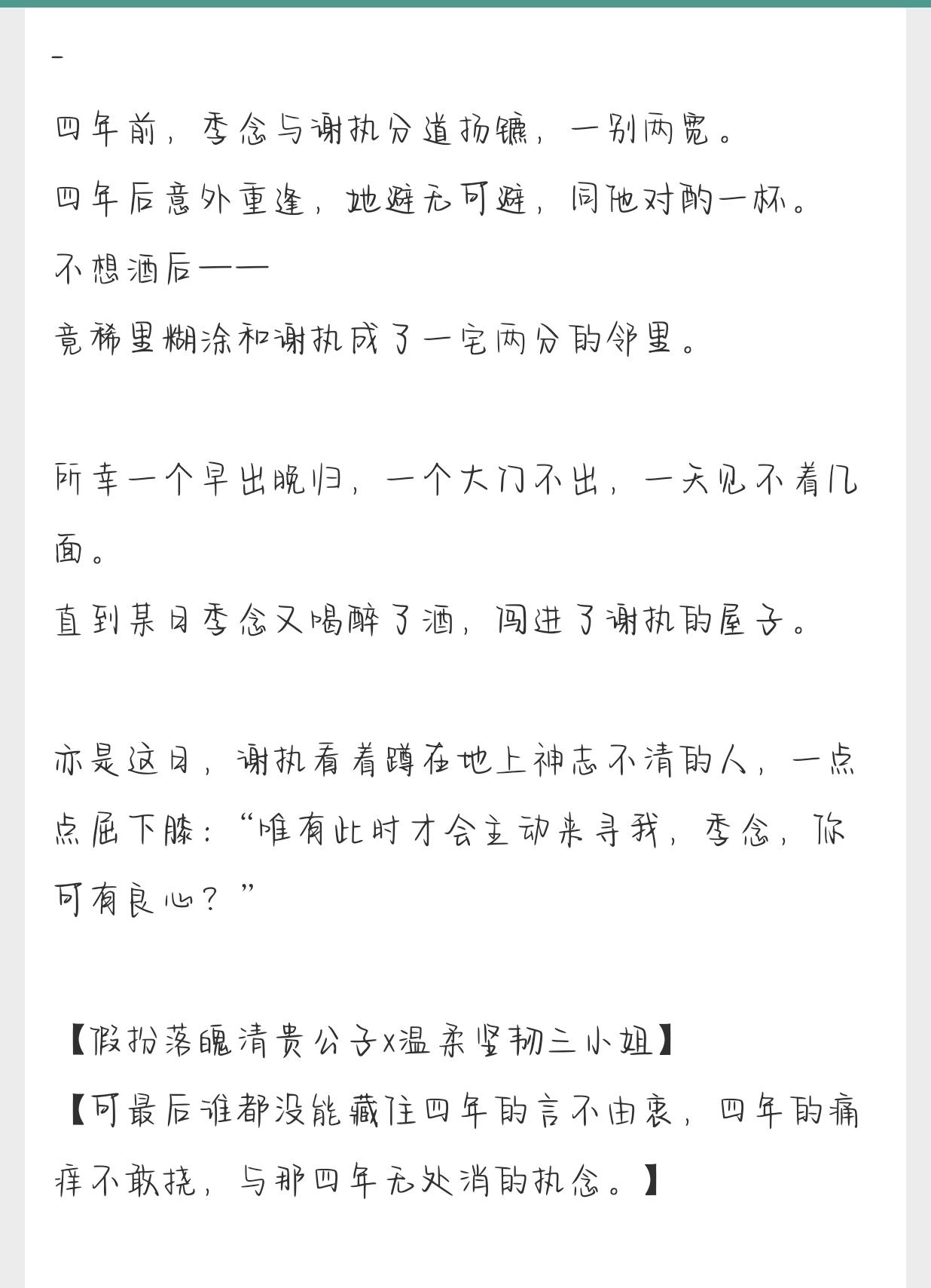 古代版破镜重圆。炒鸡好看小说 四年前,分道扬镳,一别两宽;四年后,久别重逢,避无可避。再次重逢,一句“好久不见”,合该是男婚女嫁,各不相安,却难阻情深似海,执念太深。古言