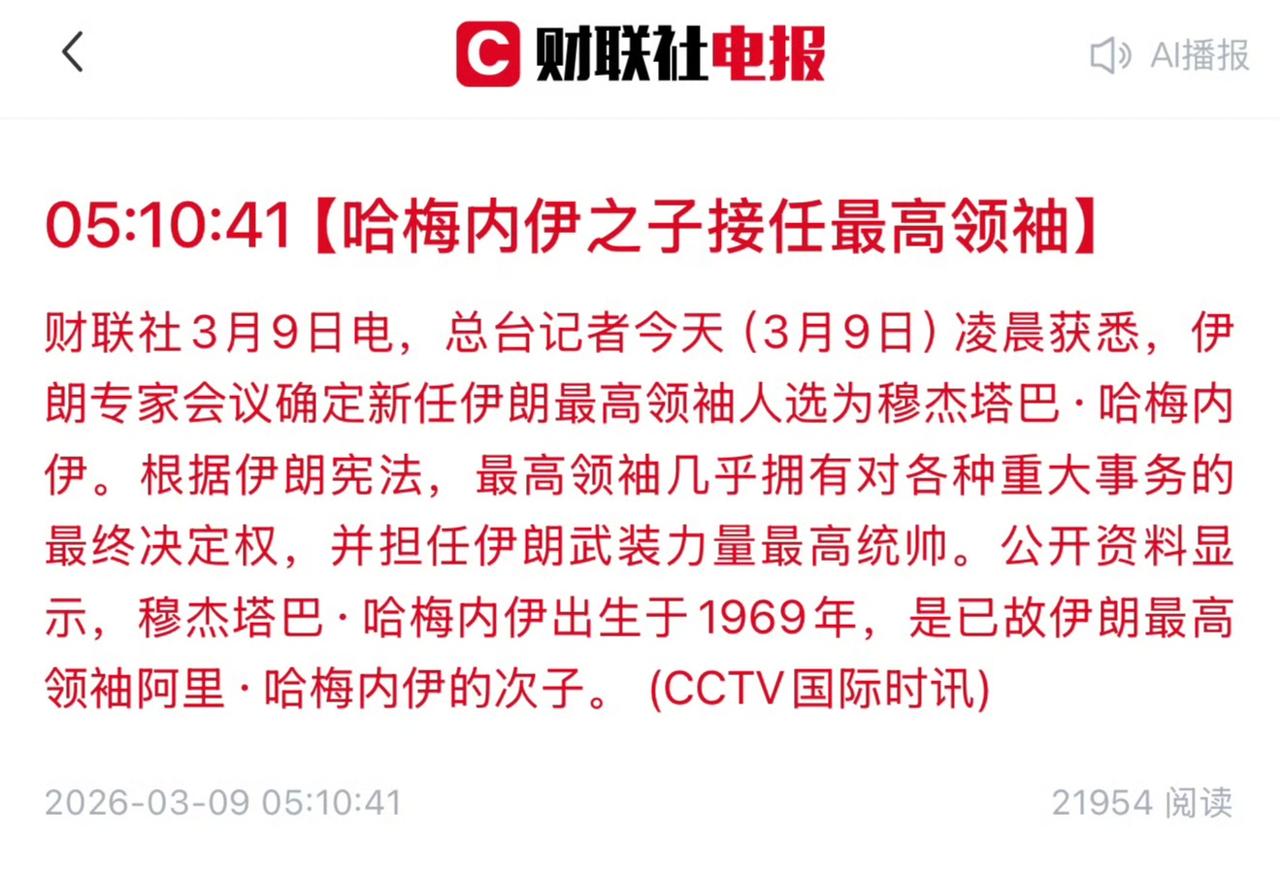 小哈梅内伊接任伊朗最高领袖,奉命于危难之间,有可能意味着牺牲!穆杰塔巴·哈梅内伊(阿里·哈梅内伊次子,1969年生),3月8 日已被伊朗专家会议一致选举为伊朗第三任最高领袖。 其父2月28日在美以联合空袭中身亡; 伊朗正处于战争边缘、最高安全警戒,面临持续空袭、斩首威胁、全面制裁与地区对抗升级。 哈梅内伊突然遇袭,伊朗进入最高权力真空期;专家会议在空袭威胁下紧急开会、快速完成选举,一致同意推举穆杰塔巴。 他长期在幕后负责安全、军事与情报,被其父长期培养;此次是伊朗伊斯兰共和国首次最高领袖父子传承,内外压力极大。 其父刚遭空袭身亡,穆杰塔巴作为新最高领袖、武装力量最高统帅,必然是美以下一步斩首行动的首要目标。 哈梅内伊本人就是“牺牲式接班” 1989年霍梅尼去世,哈梅内伊在两伊战争后、内外交困中接任,长期处于暗杀阴影中。 伊朗革命卫队已发表声明,宣誓绝对服从新领袖。议长卡利巴夫称选举“精准且明确”,强调其忠诚、懂敌情、有行政能力。临时掌权的拉里贾尼确认在外部威胁下完成合法程序。 穆杰塔巴是在战争状态、权力真空、家族接班、 外部斩首威胁四重高危下火线接任,“牺牲”风险是现实且极高的;他的首要任务是稳住政权、 统一内部、应对美以军事压力,未来走向高度不确定。