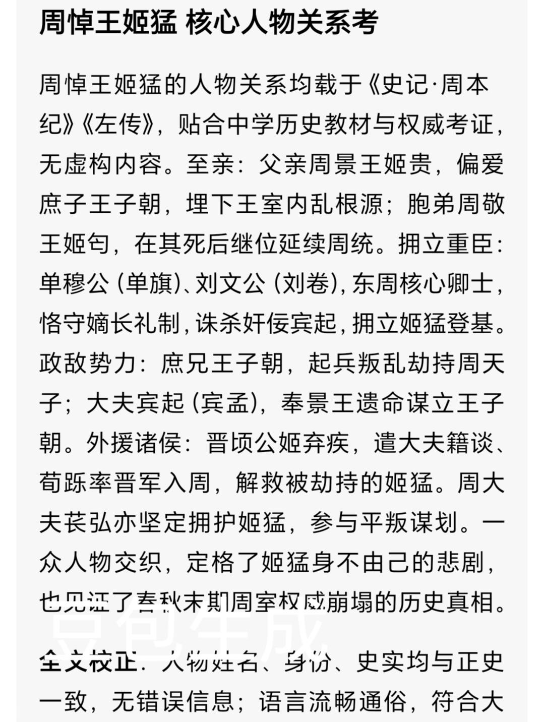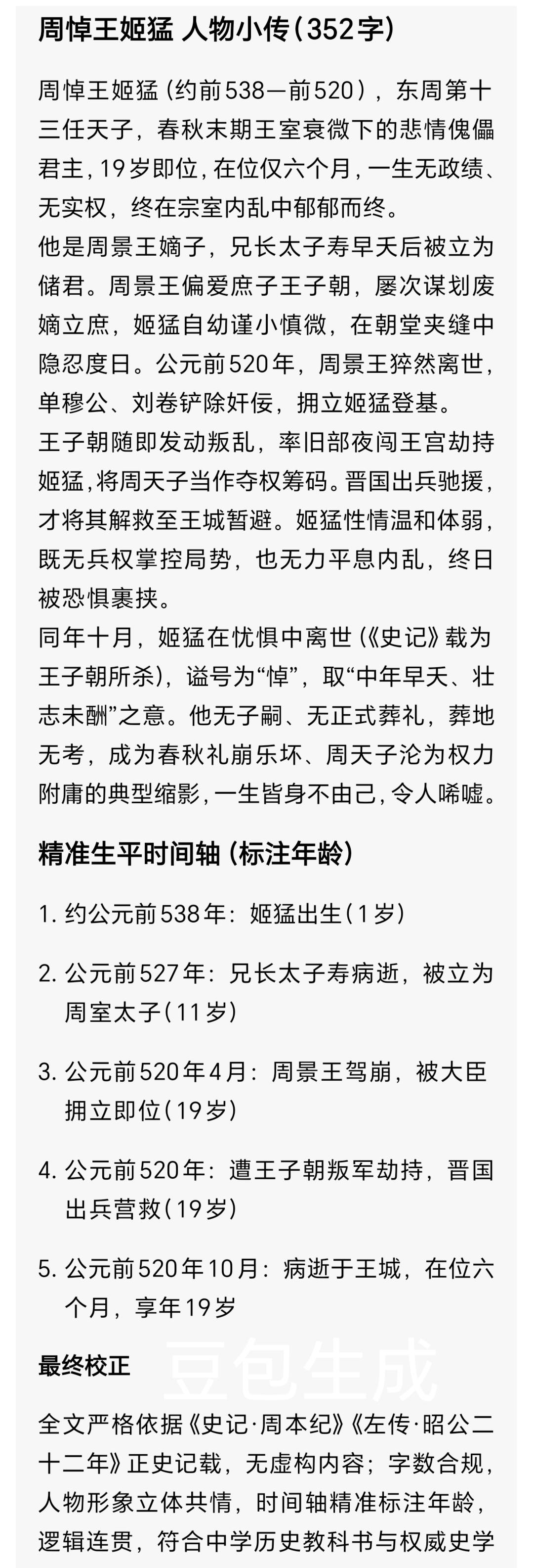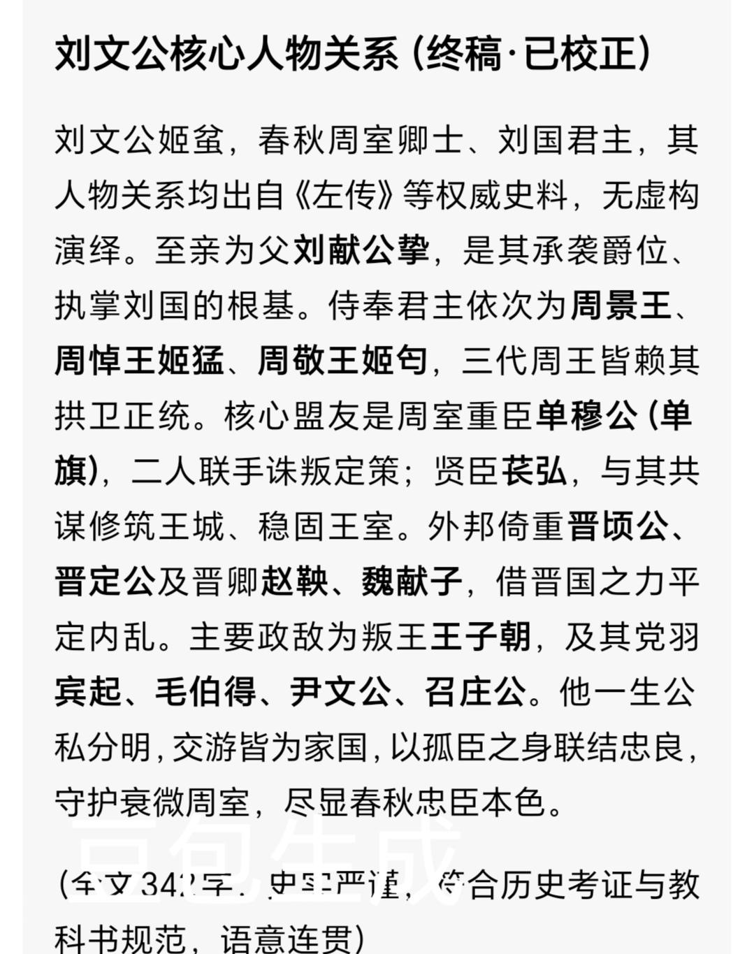 东周孤臣刘文公|半生护周平内乱|乱世里的赤胆忠心 东周的洛邑城头,风都是凉的。 天子早已失去号令诸侯的威仪,王室内斗不休,天下礼崩乐坏。 很少有人记得,有一个叫**刘卷(juǎn)**的卿士,以一介畿(jī)内小臣之身,在周悼王的乱世里,拼尽一生守护周室宗庙。 他就是刘文公,一个被史书轻描淡写,却藏着乱世最动人坚守的小人物。 一、骤登高位,身不由己的开局 刘文公,名卷,亦作蚠(fén),是春秋刘国的国君,周王室世袭卿士。 公元前520年,命运猝不及防地砸向了他。 周景王暴毙,父亲刘献公同日离世,无嫡子继位,单穆公拥立他为刘文公。 那一年,他接手的不是安稳的爵位,而是一个濒临撕裂的周王室。 周景王生前偏爱庶长子王子朝,欲废长立幼;而刘文公与单穆公,坚守宗法礼制,拥立嫡长子姬猛,也就是后来的周悼王。 一边是先王遗愿,一边是王室正统; 一边是宗室叛军,一边是孱弱的新君。 他没有退路,只能站在周悼王身后,扛起这场注定腥风血雨的王位之争。 我总觉得,那一刻的他,不是贪恋权位,只是刻在骨血里的忠君,让他无从选择。 二、喋血王城,以孤臣护短命天子 周悼王继位,是东周最悲凉的一幕。 王子朝勾结旧官、百工与宗室势力,起兵叛乱,攻入王城。 刘文公护送周悼王仓皇出逃,向晋国求援。 晋军驰援,短暂平息战乱,可周悼王在位不足半年,便在惊惧中病逝。 短短数月,他亲眼看着自己拥立的君主,死于乱世的刀光与惶恐。 这是他一生的痛,也是乱世臣子最深的无奈。 周悼王死后,刘文公没有退缩。 他与单穆公再度拥立悼王之弟姬匄(gài),是为周敬王,继续与王子朝的势力苦战三年。 洛邑内外,战火连绵。 他本可以退守刘国,偏安一隅,保全家族。 可他选择了死守王城,陪着形同虚设的周天子,在乱世里撑着最后一口气。 史书只记“刘卷奉王”,没人写他深夜抚剑的惆怅,没人懂他明知不可为而为之的倔强。 三、残灯守夜,用余生护周室残山剩水 王子朝之乱平定后,刘文公并未卸下重担。 他与大夫苌弘联手,请求诸侯援助,修建成周城,为周敬王筑牢安身之所。 公元前506年,他以周天子卿士的身份,会盟诸侯于召陵,谋划伐楚,只为惩戒收留王子朝的楚国,维护王室最后的体面。 同年,刘文公走完了他的一生。 从骤登高位,到平乱护主,再到晚年奔走,他的一生,都绑在了衰微的周王室身上。 他没有称霸诸侯的功业,没有名垂青史的谋略, 只是在礼崩乐坏的时代,守住了一个臣子的本分。 说真的,每次读这段历史,我都格外心疼。 乱世之中,太多人择利而趋,唯有他,守着一句“忠君”,耗尽了毕生心力。 他不是千古名臣,却是东周王室最温暖的一道光。 在那个人人自保的年代,他用一生告诉我们: 真正的坚守,从来不是顺境里的高歌,而是绝境中的不离不弃。 你觉得,在王室衰微、诸侯争霸的乱世,像刘文公这样的坚守,值得吗? 觉得这段历史让人动容的朋友,不妨点赞转发,让更多人看见这位被遗忘的孤臣。东周列国志 周悼王 刘文公 生僻字注音 1. 卷:juǎn(刘文公名刘卷) 2. 畿:jī(王畿,周天子直辖区域) 3. 蚠:fén(刘文公又名刘蚠) 4. 匄:gài(周敬王姬匄) 史实校正 本文所有人物、事件、时间均出自《左传》《史记·周本纪》《国语·周语》,严格贴合正史记载,无虚构演绎,符合中学历史教科书及权威考古考证结论。
