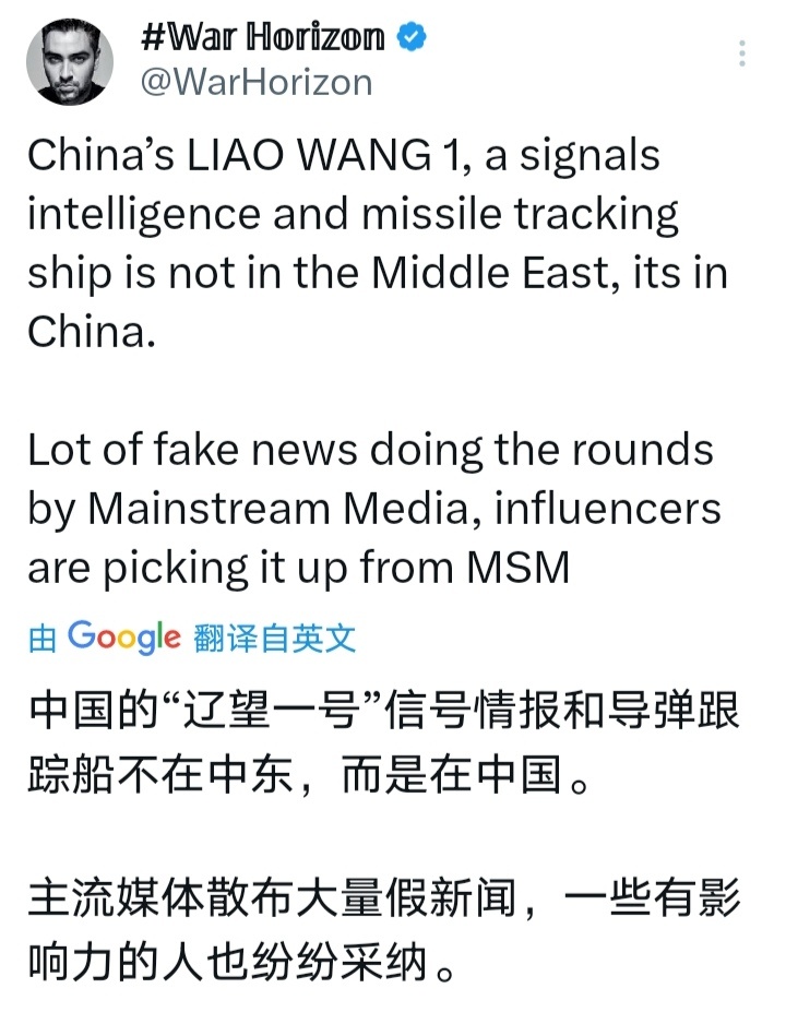 以美袭击伊朗针对X上泛滥的假消息,有外国网友指出,中国的"瞭望一号"信号情报和导弹跟踪船不在中东,而是在中国。主流媒体散布大量假新闻,一些有影响力的人也纷纷采纳。