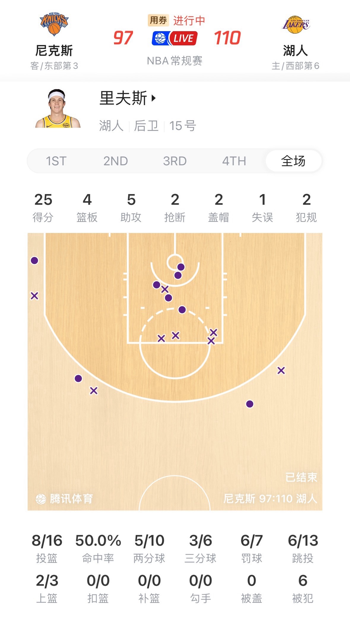 湖人双核今日发挥:里夫斯25分4板5助攻,投篮16中8,三分6中3,7罚6中。东