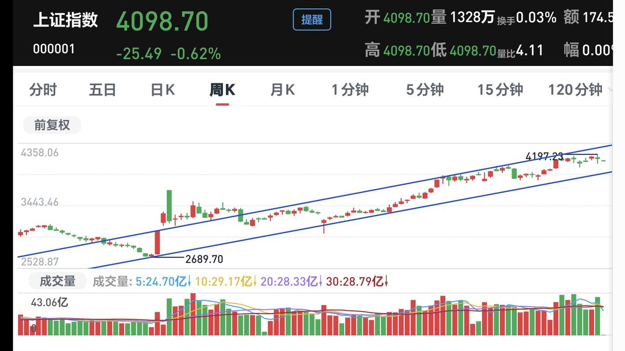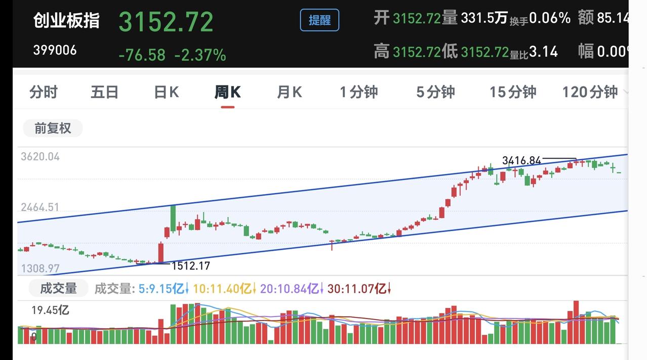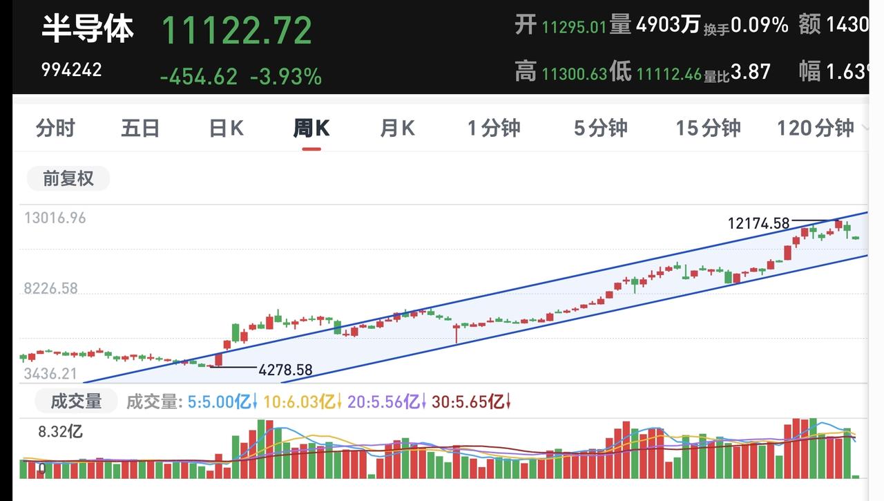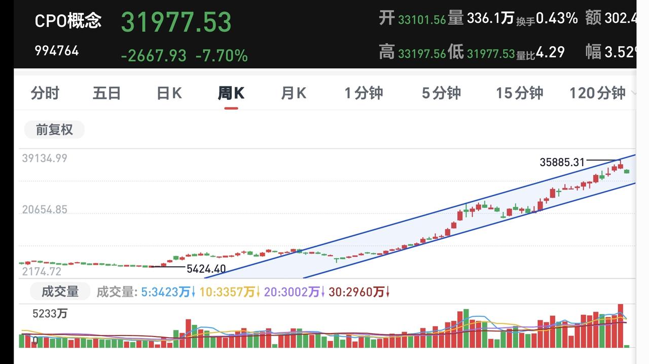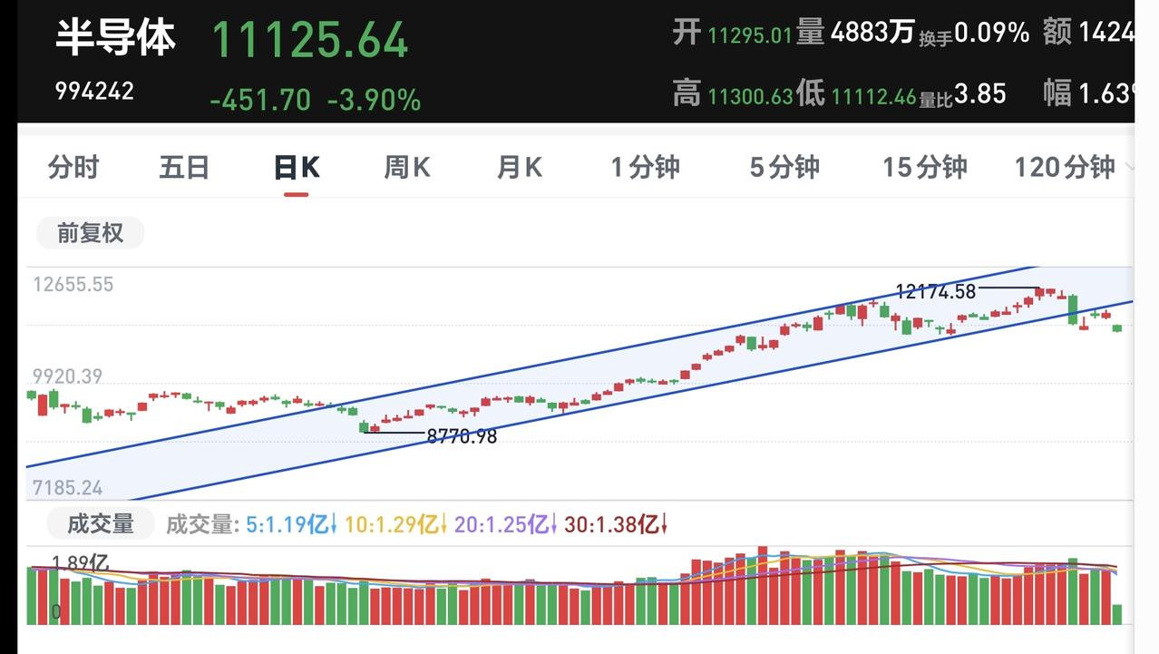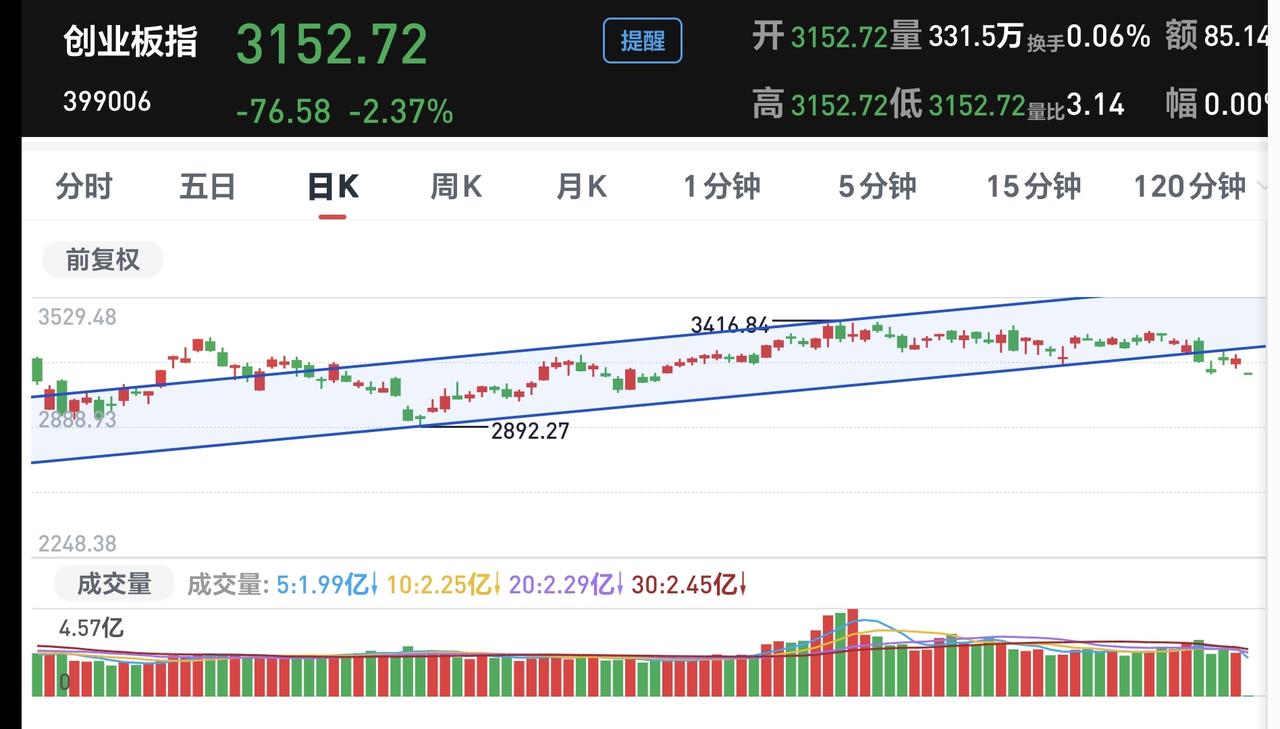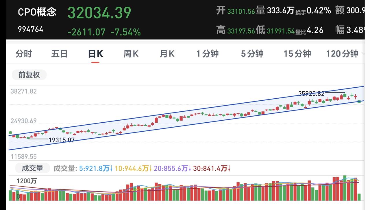 基金:不管是追高捞回筹码还是抄底捞回筹码,我们都会捞回我们前段时间止盈的筹码 今天市场在外围影响下低开,创业板指开盘下跌了2.37%,开于3152点,上证指数开盘下跌了0.62%,开于4098点。 看下面的截图2和3,这是上证指数日K线图和周K线图,今天开盘点位正好开在了日线级别上涨趋势线上,今天重点观察会不会跌破这条上涨趋势线,虽然最近一段时间指数在震荡,但还是在周线级别上涨通道中,而且距离上涨通道的下轨线比较远,所以,上证指数周线级别还是处于上涨趋势中,上证指数周线级别大方向向上。 看下面的截图4和5,这是创业板指日K线图和周K线图,上周指数已经跌破了日线级别上涨通道的下轨线,最近都是在这个上涨通道的下方震荡,但还是处于周线级别上涨通道中,所以,创业板指周线级别也是处于上涨趋势中,周线级别的大方向也是向上的。 开盘以后指数小幅度震荡向下,黄色线在蓝色线下方,但两条线之间的敞口并不是很大,两市累计成交5210亿相比于上周五同期放量了46%,这说明有大批资金在出逃,上涨900多家,下跌4400多家,下跌家数大幅度超过了上涨家数,涨停26家,跌停10家,这说明市场还没有形成过分恐慌,主力资金净流出132亿。 整个市场主力资金净流入最多的三个板块是:煤炭板块,红利板块,农林牧渔板块,主力资金净流出最多的三个板块是:高端制造板块,蓝筹策略板块,esg板块。 整个市场上涨幅度最大的三个板块是:煤炭板块,电力板块,农林牧渔板块,下跌幅度最大的三个板块是:通信板块,cpo板块,半导体板块。 持有的基金盘中估值全部都是下跌,亏损金额最小的三个板块是:AI应用板块,可控核聚变板块,军工板块,亏损金额最大的三个板块是:芯片半导体板块,证券板块,5G板块,估值整体亏损了16022元。 CPO板块现在盘中估值下跌了5.50%,是连续第二个交易日下跌,持有人数在所有板块当中排名第二位。 CPO板块今天下跌跌破了日线级别上涨通道的下轨线,这样的下跌有可能会改变这个板块日线级别的上涨趋势,短线持有的人需要注意风险,今天观察收盘的时候会不会跌破这个上涨通道的下轨线。 CPO板块连续两个交易日下跌,但并没有跌破周线级别上涨通道的下轨线,长线持有的人可以继续持有,周线级别上涨通道的下轨线,是长线持有者的持有条件。 半导体板块上周二的时候就已经跌破了日线级别上涨通道的下轨线,短线持有的人应该在那一天进行防守,想进场的人需要等待新的短线下跌趋势形成,到时候我会画出新的短线下跌通道,突破短线下跌通道上轨线的时候,就可以考虑要不要捞回止盈筹码。 最近半导体板块虽然在调整,但还是处于周线级别上涨通道中,最近的下跌并没有跌破周线级别上涨通道的下轨线。半导体板块周线级别还是处于上涨趋势中,半导体板块的大方向还是向上的,长线持有的人可以继续持有。 我们不猜测市场的涨跌,我们改变不了市场的涨跌,我们只能根据市场的实际涨跌情况来做出我们的操作策略,如果市场继续向上形成新的上涨趋势,我们需要纠错追高进场,如果市场继续向下形成新的下跌趋势,我们需要在下跌末期捞回止盈筹码,不管怎么样,我们都需要满仓跟随阶段性上涨,牛市里面满仓是硬道理,牛市里面满仓才是最重要的事情,牛市里面最大的风险是空仓,我们后面最大的任务就是捞回筹码,不管是追高捞回还是抄底捞回,都是要捞回筹码,到时候我会第一时间分享给大家。 花1秒钟点赞,花30秒钟评论,就是对我最大的支持,谢谢大家的支持。