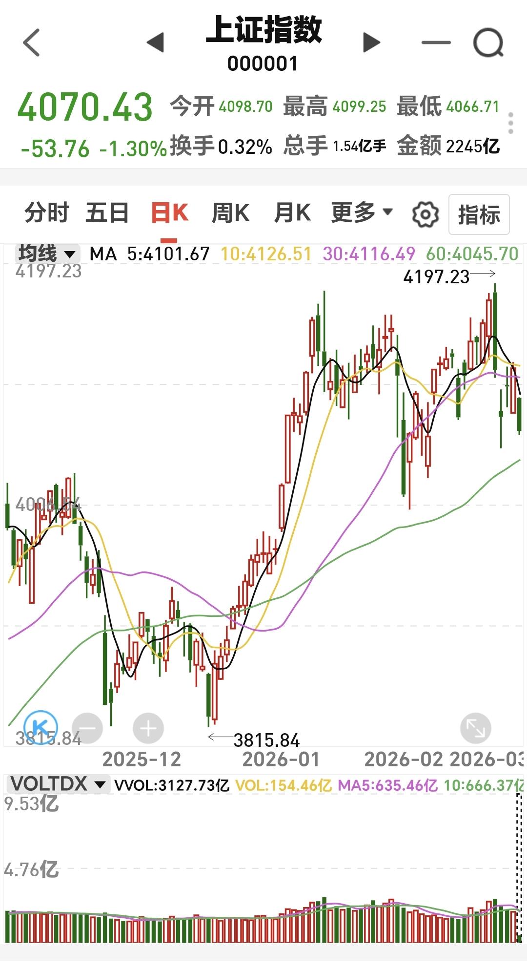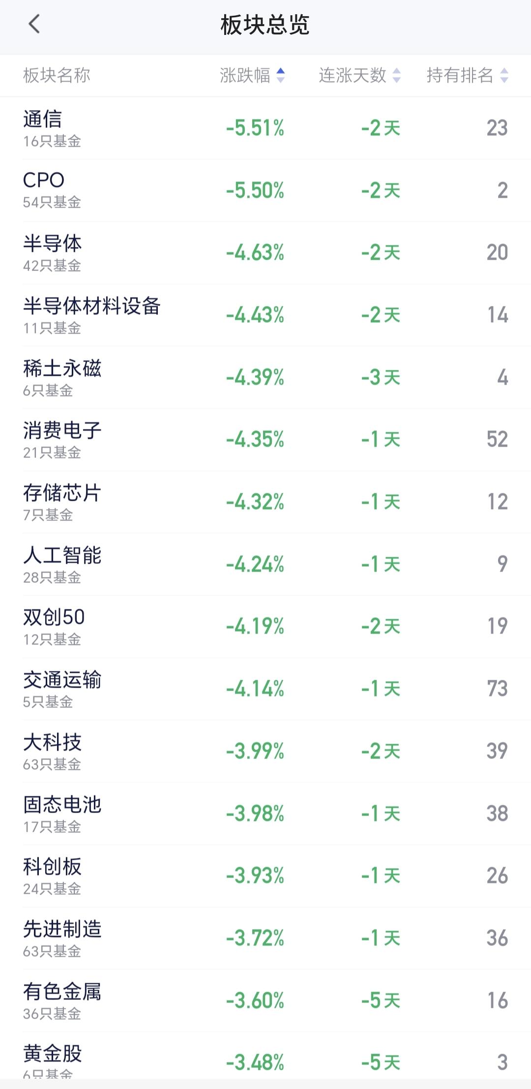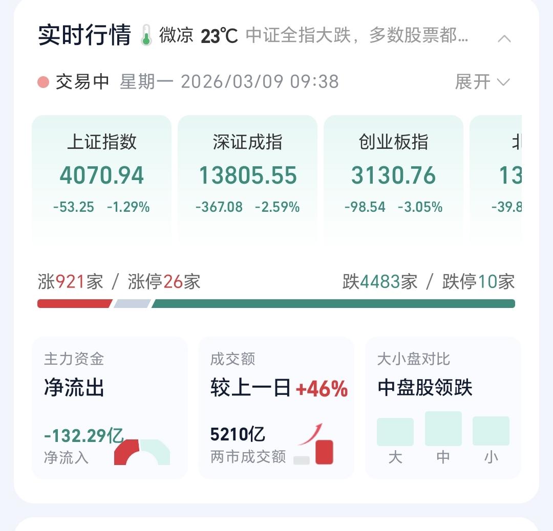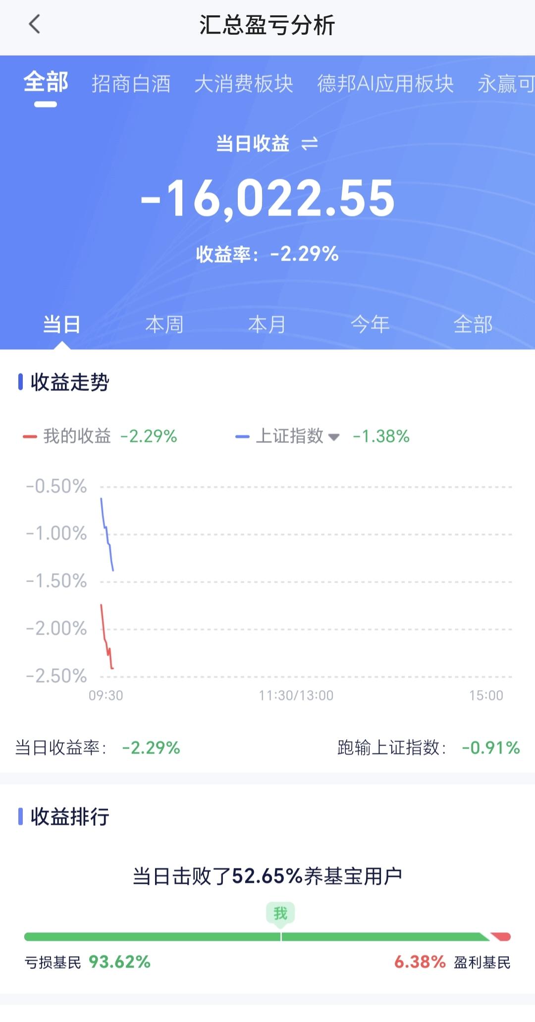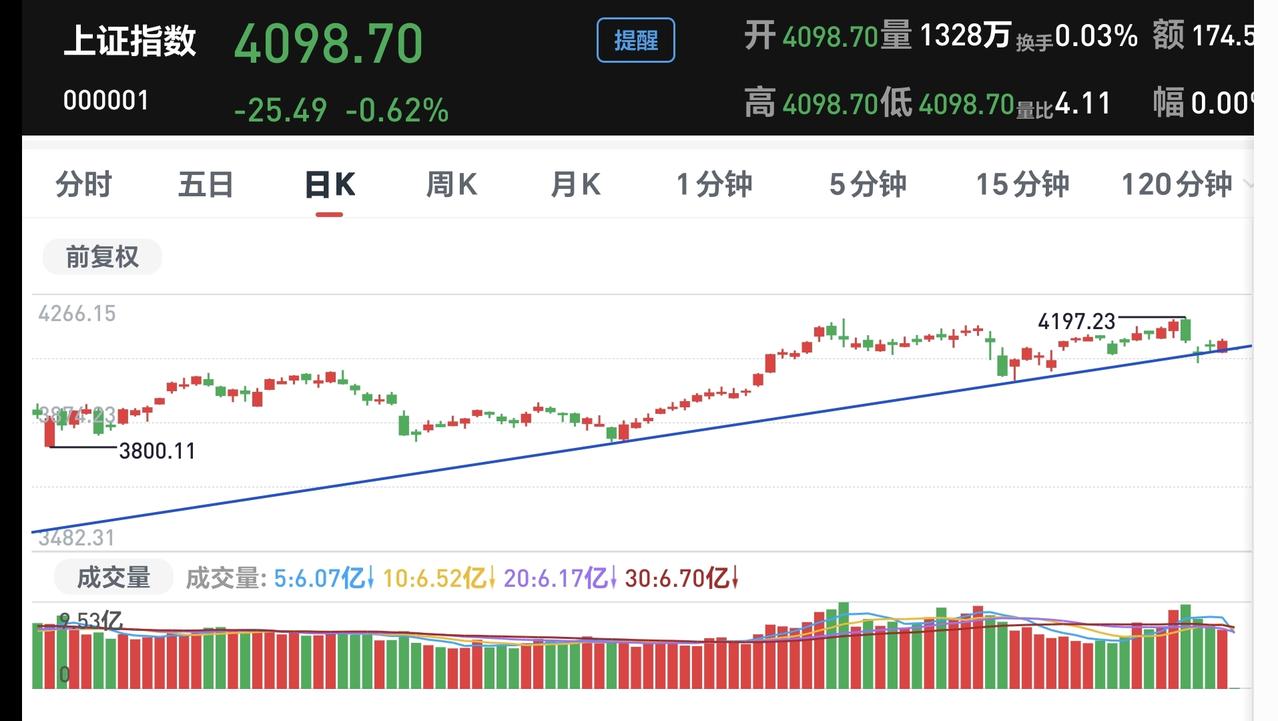 基金:不管是追高捞回筹码还是抄底捞回筹码,我们都会捞回我们前段时间止盈的筹码 今天市场在外围影响下低开,创业板指开盘下跌了2.37%,开于3152点,上证指数开盘下跌了0.62%,开于4098点。 看下面的截图2和3,这是上证指数日K线图和周K线图,今天开盘点位正好开在了日线级别上涨趋势线上,今天重点观察会不会跌破这条上涨趋势线,虽然最近一段时间指数在震荡,但还是在周线级别上涨通道中,而且距离上涨通道的下轨线比较远,所以,上证指数周线级别还是处于上涨趋势中,上证指数周线级别大方向向上。 看下面的截图4和5,这是创业板指日K线图和周K线图,上周指数已经跌破了日线级别上涨通道的下轨线,最近都是在这个上涨通道的下方震荡,但还是处于周线级别上涨通道中,所以,创业板指周线级别也是处于上涨趋势中,周线级别的大方向也是向上的。 开盘以后指数小幅度震荡向下,黄色线在蓝色线下方,但两条线之间的敞口并不是很大,两市累计成交5210亿相比于上周五同期放量了46%,这说明有大批资金在出逃,上涨900多家,下跌4400多家,下跌家数大幅度超过了上涨家数,涨停26家,跌停10家,这说明市场还没有形成过分恐慌,主力资金净流出132亿。 整个市场主力资金净流入最多的三个板块是:煤炭板块,红利板块,农林牧渔板块,主力资金净流出最多的三个板块是:高端制造板块,蓝筹策略板块,esg板块。 整个市场上涨幅度最大的三个板块是:煤炭板块,电力板块,农林牧渔板块,下跌幅度最大的三个板块是:通信板块,cpo板块,半导体板块。 持有的基金盘中估值全部都是下跌,亏损金额最小的三个板块是:AI应用板块,可控核聚变板块,军工板块,亏损金额最大的三个板块是:芯片半导体板块,证券板块,5G板块,估值整体亏损了16022元。 CPO板块现在盘中估值下跌了5.50%,是连续第二个交易日下跌,持有人数在所有板块当中排名第二位。 CPO板块今天下跌跌破了日线级别上涨通道的下轨线,这样的下跌有可能会改变这个板块日线级别的上涨趋势,短线持有的人需要注意风险,今天观察收盘的时候会不会跌破这个上涨通道的下轨线。 CPO板块连续两个交易日下跌,但并没有跌破周线级别上涨通道的下轨线,长线持有的人可以继续持有,周线级别上涨通道的下轨线,是长线持有者的持有条件。 半导体板块上周二的时候就已经跌破了日线级别上涨通道的下轨线,短线持有的人应该在那一天进行防守,想进场的人需要等待新的短线下跌趋势形成,到时候我会画出新的短线下跌通道,突破短线下跌通道上轨线的时候,就可以考虑要不要捞回止盈筹码。 最近半导体板块虽然在调整,但还是处于周线级别上涨通道中,最近的下跌并没有跌破周线级别上涨通道的下轨线。半导体板块周线级别还是处于上涨趋势中,半导体板块的大方向还是向上的,长线持有的人可以继续持有。 我们不猜测市场的涨跌,我们改变不了市场的涨跌,我们只能根据市场的实际涨跌情况来做出我们的操作策略,如果市场继续向上形成新的上涨趋势,我们需要纠错追高进场,如果市场继续向下形成新的下跌趋势,我们需要在下跌末期捞回止盈筹码,不管怎么样,我们都需要满仓跟随阶段性上涨,牛市里面满仓是硬道理,牛市里面满仓才是最重要的事情,牛市里面最大的风险是空仓,我们后面最大的任务就是捞回筹码,不管是追高捞回还是抄底捞回,都是要捞回筹码,到时候我会第一时间分享给大家。 花1秒钟点赞,花30秒钟评论,就是对我最大的支持,谢谢大家的支持。
