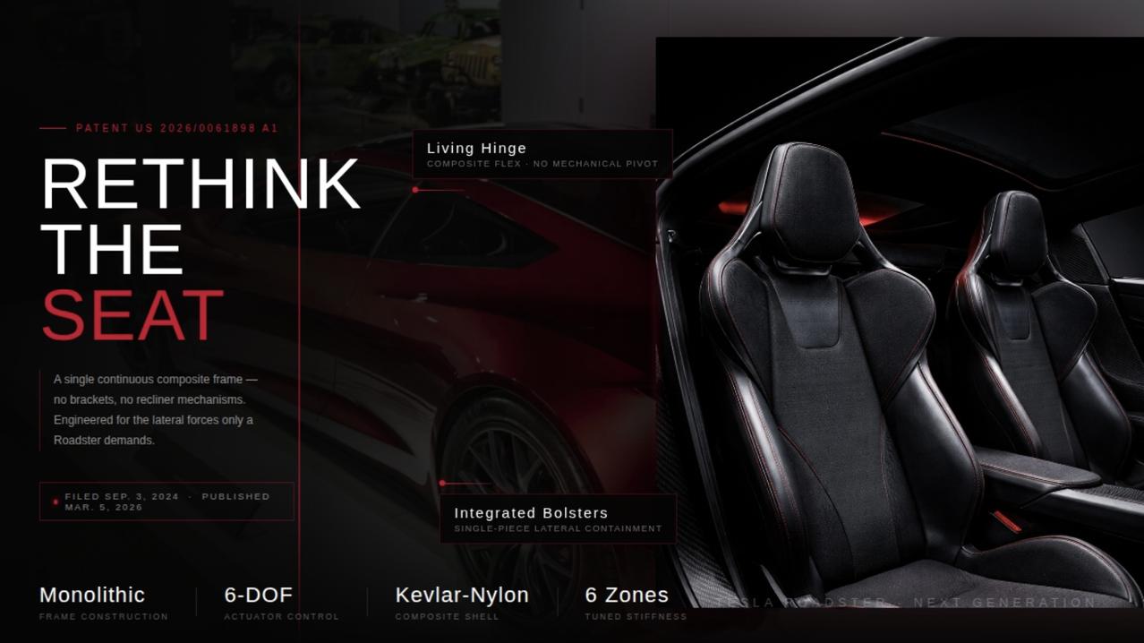 特斯拉最新座椅设计暗示下一代跑车或将亮相 特斯拉最新公布的一项专利表明万众期待的下一代Roadster即将正式亮相。 3月5日公布的专利描述了一种围绕单一连续复合材料框架构建的“车辆座椅系统”。这与传统汽车座椅由数十个金属支架、倾斜机构和铆钉组成的结构截然不同。特斯拉称之为整体式结构,座椅部分、靠背、头枕和侧垫均采用热成型工艺一体成型。 这一设计理念体现了特斯拉的一体式制造理念。这家率先采用大型铝铸件减少车身部件的公司,如今正将这一理念应用于车厢内部。更少的部件意味着更少的潜在故障点、更轻的重量以及更简洁的装配流程。 这项专利公布的时机值得推敲,马斯克曾公开表示,2026年4月1日会发布一款“令人难忘”的 Roadster设计,而就在上个月,特斯拉又提交了两项新的Roadster商标申请。【来自懂车帝车友圈】