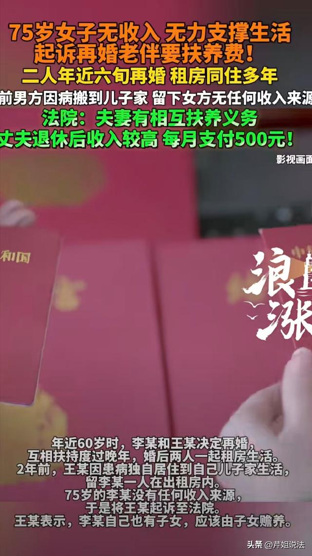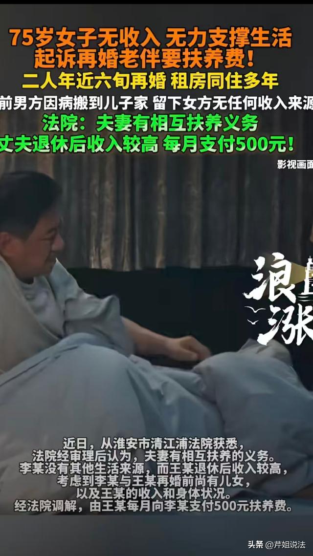 江苏淮安,75岁的李老太与王大爷是再婚家庭,两年前王大爷病了,儿子把他接到自己家住,李老太被弃养在出租屋,基本生计都成了问题,她想找老伴要点生活费,可王大爷却说:你有亲生儿女,我没义务养你! 今年75岁的李老太,是在年近60岁时候与王大爷再婚组建了家庭,婚前李老太有亲生儿女,王大爷也有亲生儿子。 两个为了减少各自儿女的负担,组建再婚家庭共同生活,并且还领取了结婚证。 原本一切都挺好的,王大爷退休后每个月能领不少退休金,完全能够负担李老太和王大爷的日常开销,老两口生活在出租屋,也不用麻烦各自子女照顾。 可是就在两年前,王大爷患上了重病,需要有人照料,而李老太年事已高,伺候的非常吃力,这时候王大爷的亲生儿子就把王大爷接回了自己家居住。 李老太没有跟去,一连两年时间,自己在出租屋生活,可是随着分居时间的延长,王大爷开始拒绝承担李老太日常生活花费。 李老太认为两人夫妻关系,已经生活了十几年而且王大爷退休后也有较高收入,虽然现在没住在一起,但是王大爷也应该承担自己的生活费用。 为此,李老太多次联系王大爷索要生活费,但是王大爷此时认为李老太有亲生儿子和女儿,李老太晚年生活需要赡养,应该由李老太的亲生儿女承担,不应该由王大爷负责。 李老太已经75岁,并没有收入来源,独自居住在出租屋内,的确是生计无法维持。不得已,李老太将王大爷起诉了,要求王大爷承担生活费用来维持基本生活。 审理中,王大爷依旧坚称,李老太有亲生的儿子女儿,赡养义务就该找她的儿子和女儿承担,自己没有义务供养李老太生活。 最终,经审理认为,合法夫妻有相互扶养的义务。王大爷有收入来源且收入较高,李老太没有收入来源且独自生活在出租屋,王大爷依法应该负担起李老太的扶养义务。由于李老太有亲生儿子和女儿,儿子女儿也有赡养老人的义务。 经过调解,双方达成一致协议,王大爷自调解生效之日起,每月向李老太支付扶养费 500 元。 很多人只知道抚养费与赡养费,很少有人知道抚养费。同时很多人都会有疑问:老人有亲生子女,再婚老伴有法定义务承担对方的生活费吗? 其实扶养这个概念,是根据《民法典》第1059条规定的:夫妻有相互扶养的义务。需要扶养的一方,在另一方不履行扶养义务时,有要求其给付扶养费的权利。 这条规定适用于所有合法夫妻,再婚夫妻与初婚夫妻享有完全同等的法律权利和义务,不会因再婚身份打任何折扣。 李老太与王大爷依法登记结婚,相伴15年,相互扶养的义务从领证之日起,就受法律严格保护。 其次,再婚家庭中,有子女赡养,老伴就无需担责,这种认知是完全错误的。 配偶的扶养义务,与子女的赡养义务,是两个相互独立的法律义务,二者不能相互替代,更不能相互抵消。 不能因为李老太有子女,就免除王大爷作为配偶的法定扶养义务。 最后,法院的调解结果完全符合法律规定。 王大爷有较高的收入,具备扶养能力,而李老太年事已高,丧失劳动能力,无任何生活来源,属于法律规定的需要扶养的情形,王大爷理应承担扶养义务。 在这里也要提醒所有再婚老人:再婚从来不是简单的搭伙过日子,领取结婚证,就要承担对应的法律责任与义务。 少年夫妻老来伴,既然选择了相伴晚年,就该守住良心、遵守法律,在对方需要时撑起遮风挡雨的伞。