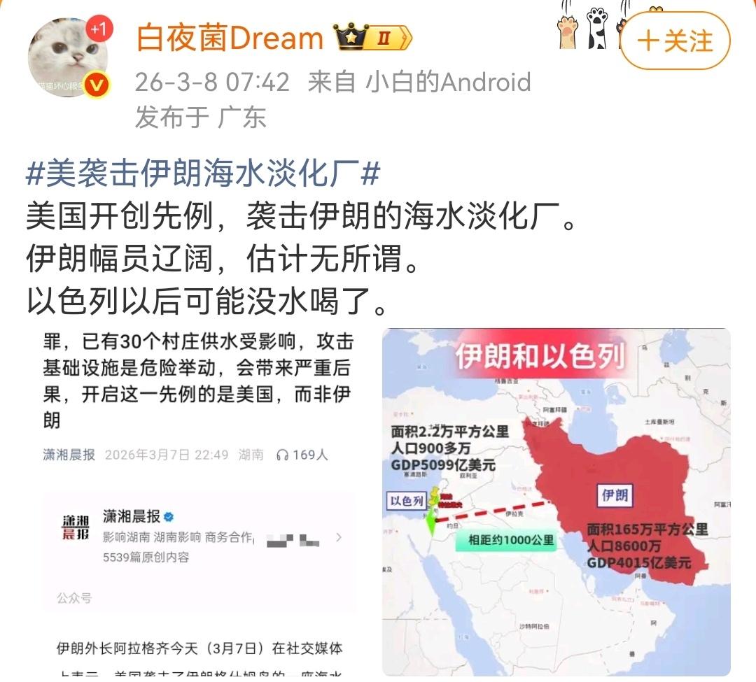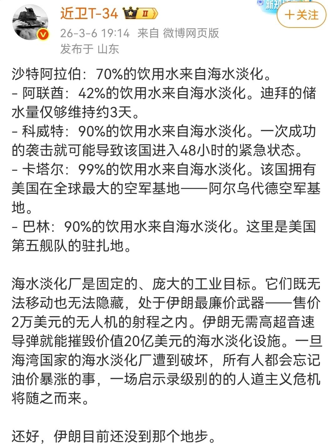中东很多国家的命门,海水淡化工厂。 (如图所示)中东的冲突大战愈演愈烈,不知道何时会缓和?中东很多国家处于沙漠地带,淡水是最重要的资源。其中沙特、科威特、卡塔尔、巴林等国家,对海水淡化工厂的依赖度极高,称得上是命门。这些海水淡化厂,目标大,非常容易遭到廉价无人机的攻击。一旦这些目标受到打击,就意味着中东战争的升级,交战双方要彻底不死不休了。