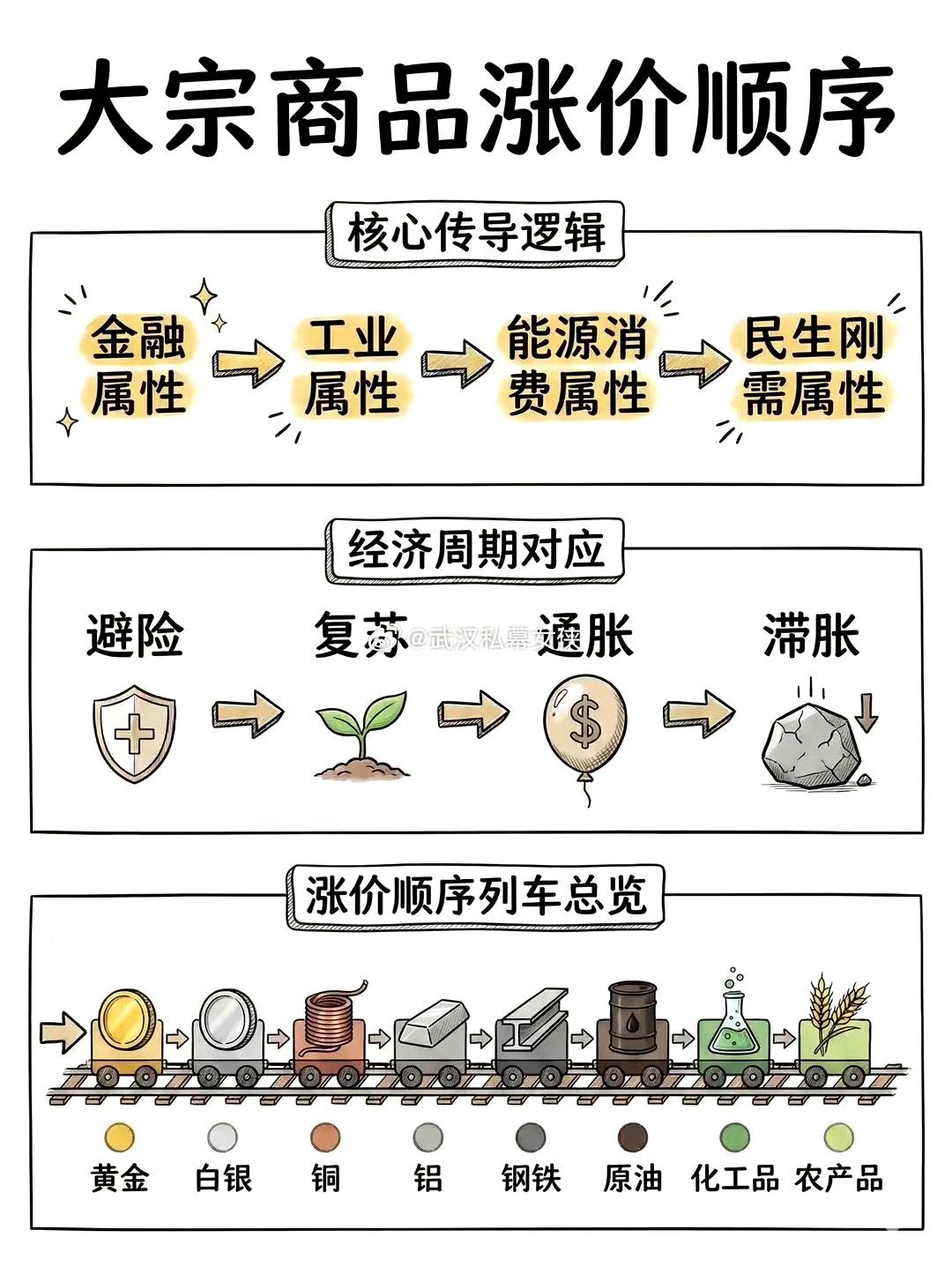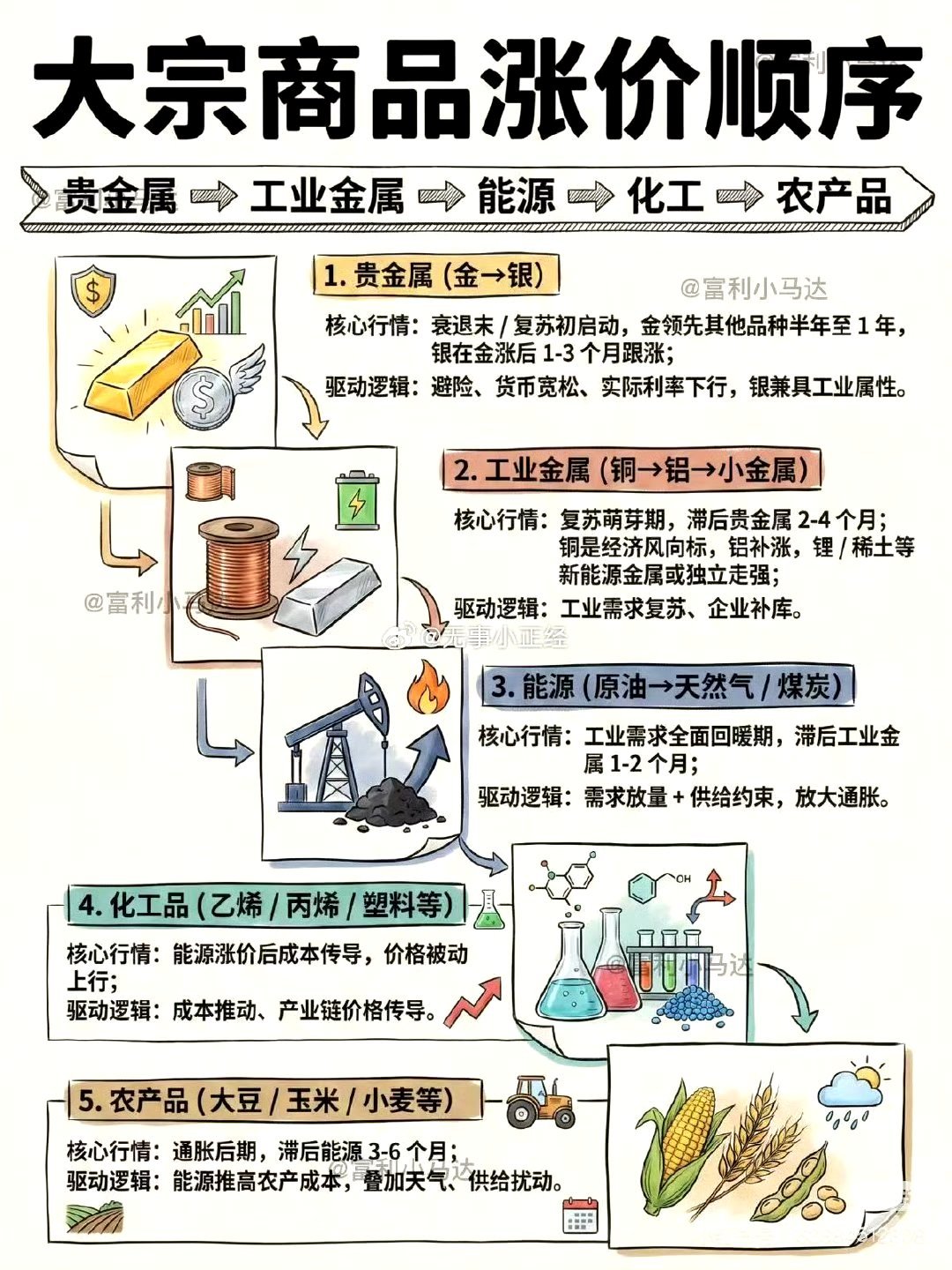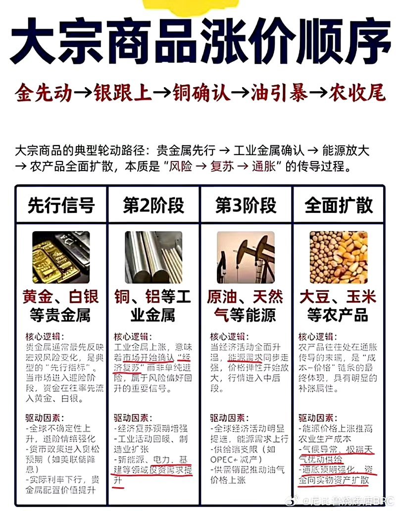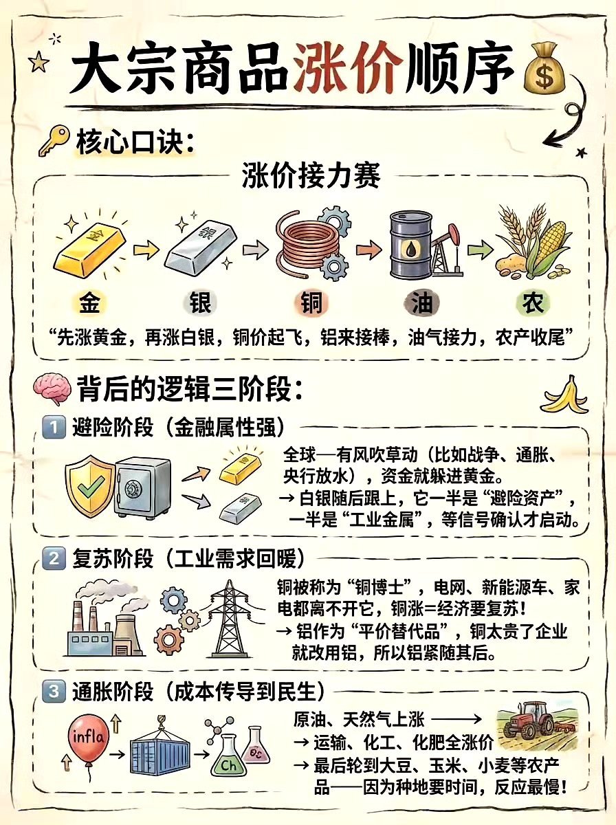 金先动→银跟上→铜确认→油引爆→农收尾本质就是一条:避险→复苏→通胀 的完整传导链。农产品都涨价了,民生成本高了,国家会控制物价。就会加息降低通胀,那时候牛市就结束了。这两年就见证了整个涨价顺序。股票期货