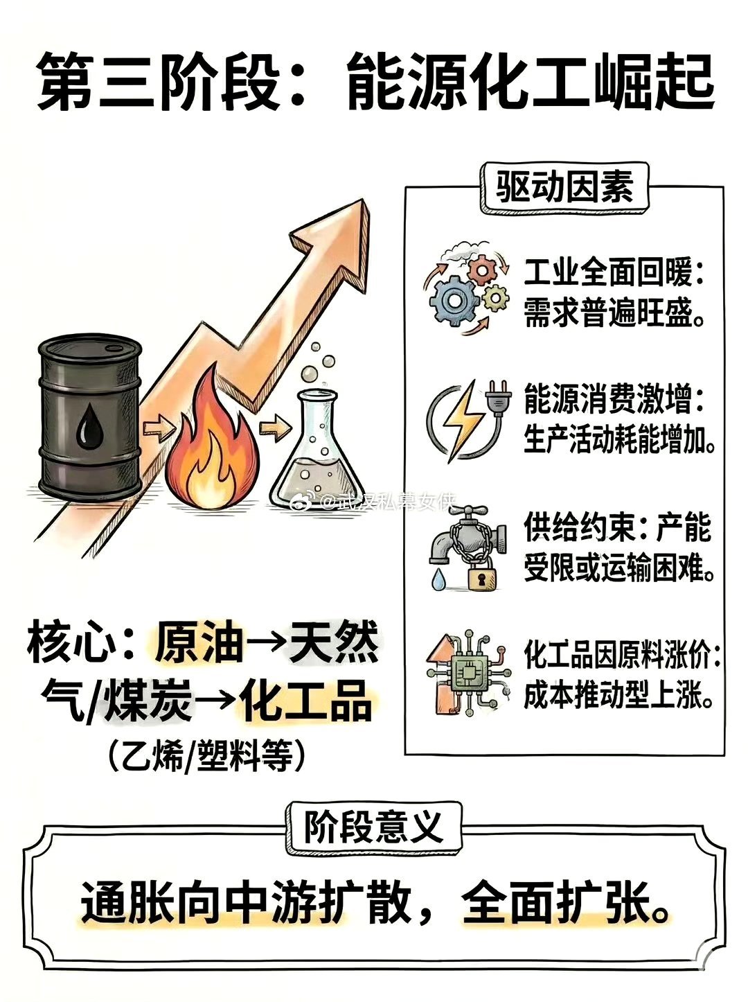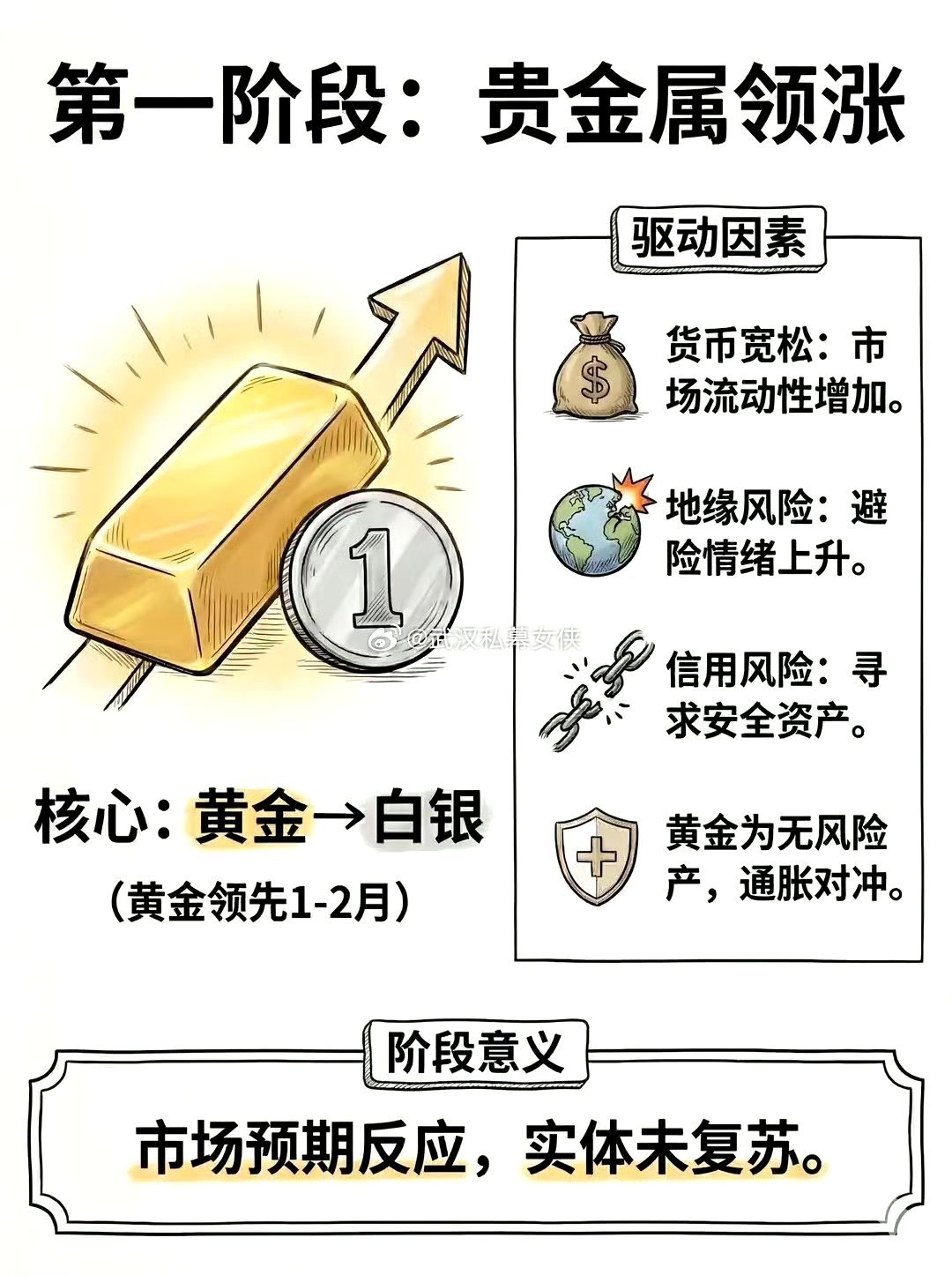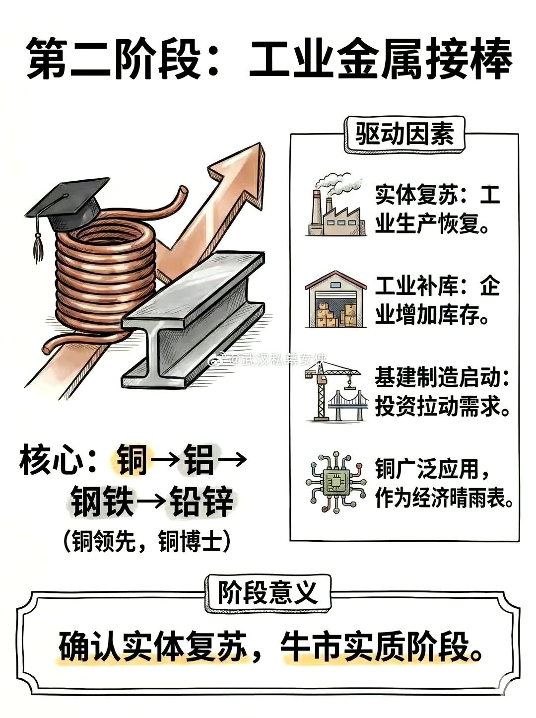 金先动→银跟上→铜确认→油引爆→农收尾本质就是一条:避险→复苏→通胀 的完整传导链。农产品都涨价了,民生成本高了,国家会控制物价。就会加息降低通胀,那时候牛市就结束了。这两年就见证了整个涨价顺序。股票期货