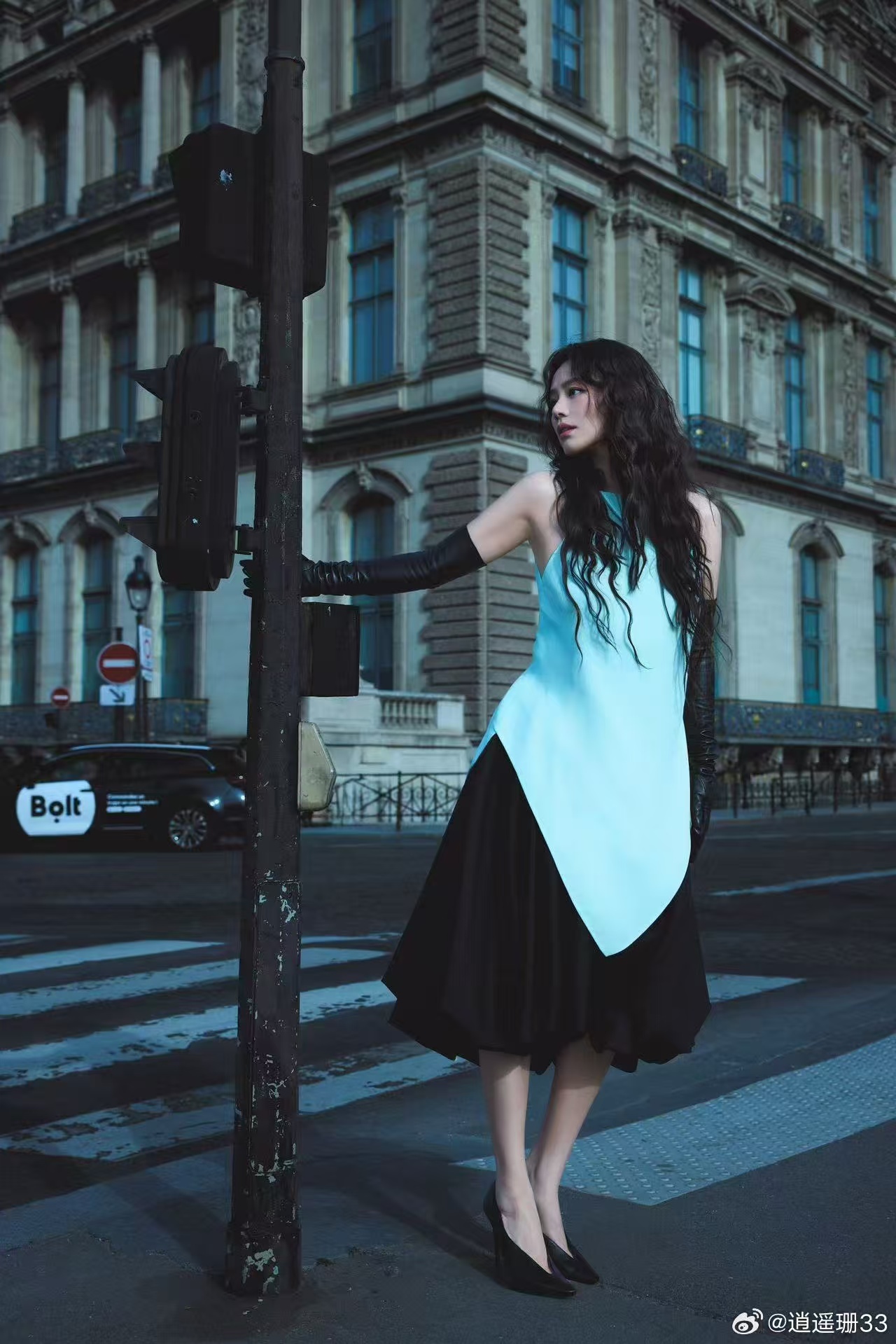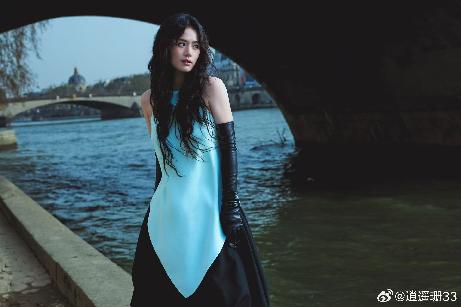 马思纯把撞色玩明白了妆容与服饰的色彩配合得十分默契,蓝眼影提亮整体气质,暖底妆柔