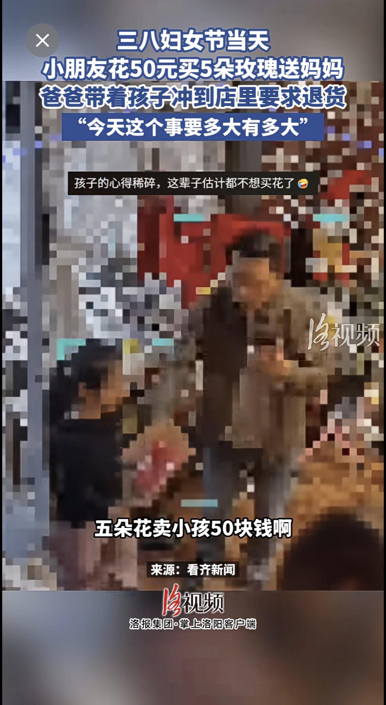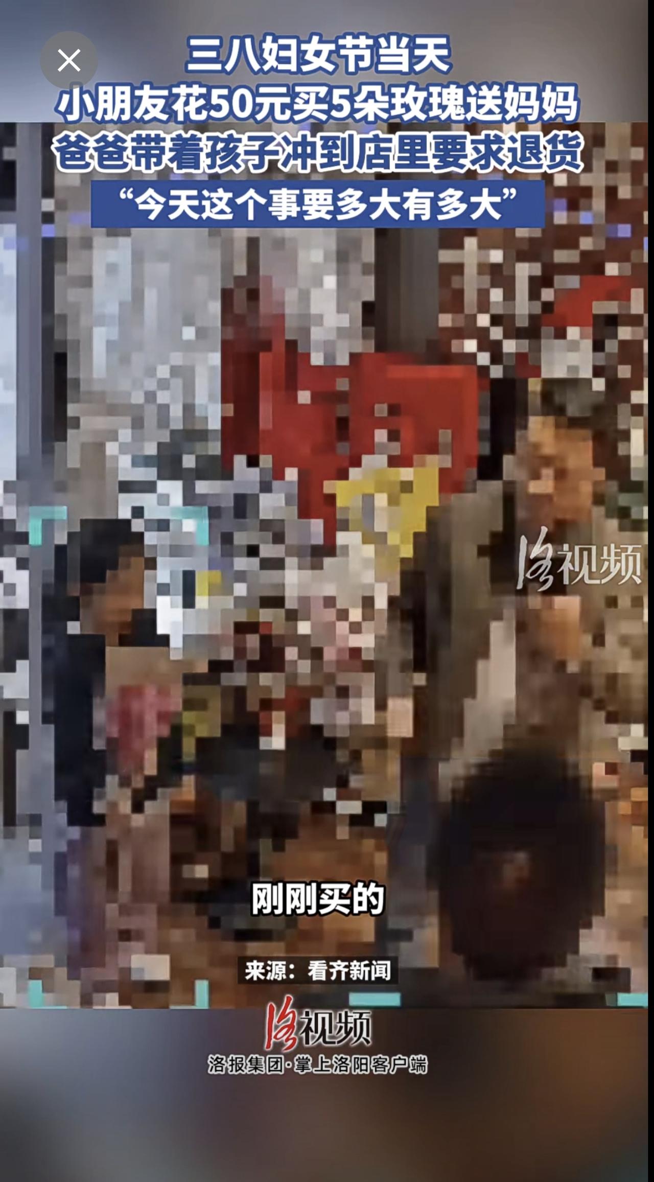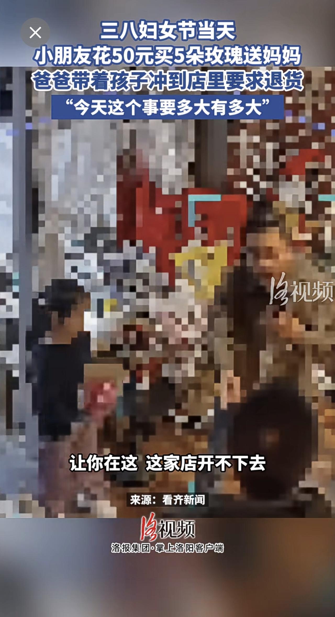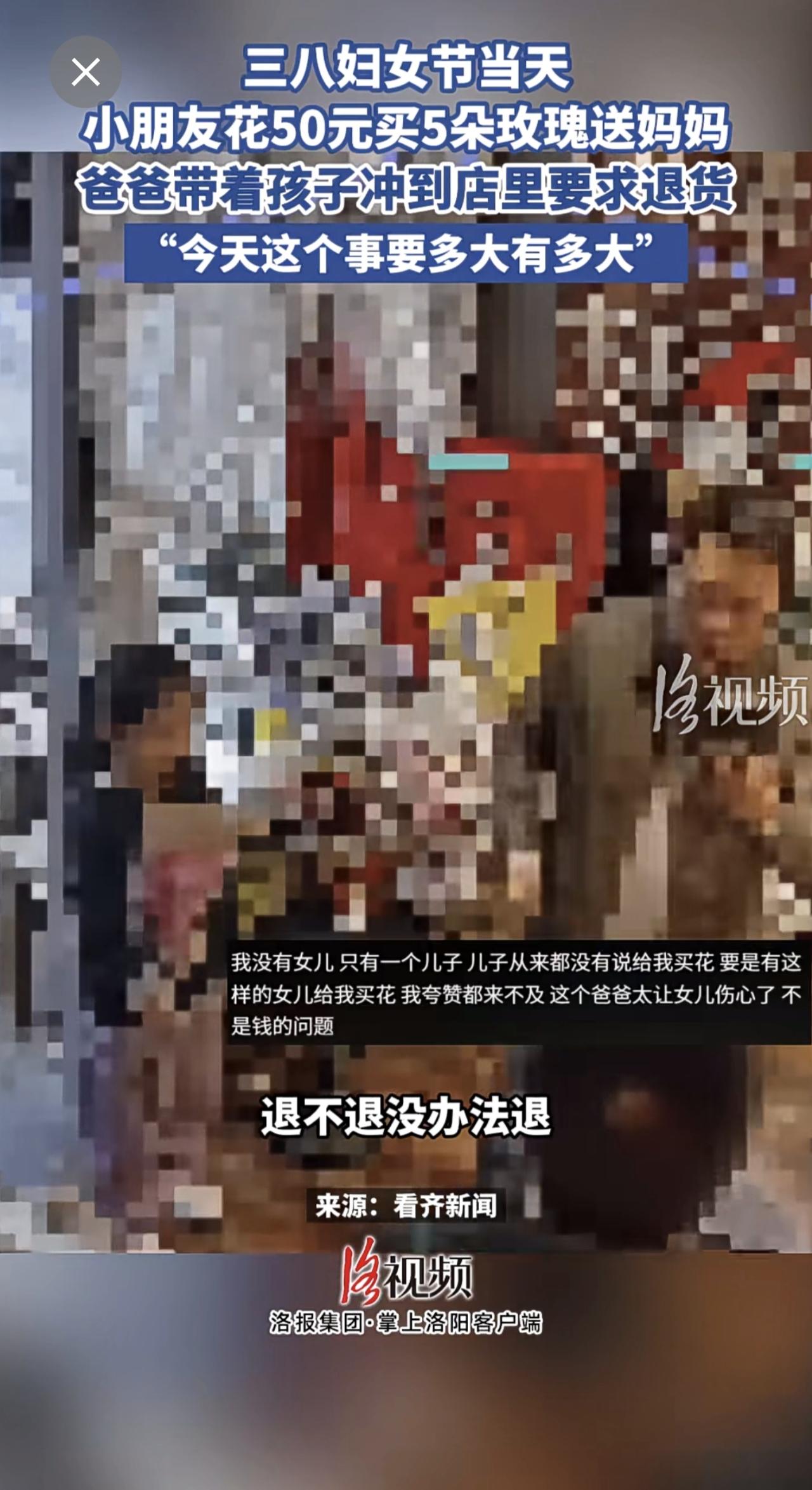 三八妇女节当天,小朋友花50元买5朵玫瑰送妈妈,爸爸带着孩子冲到店里要求退货。
