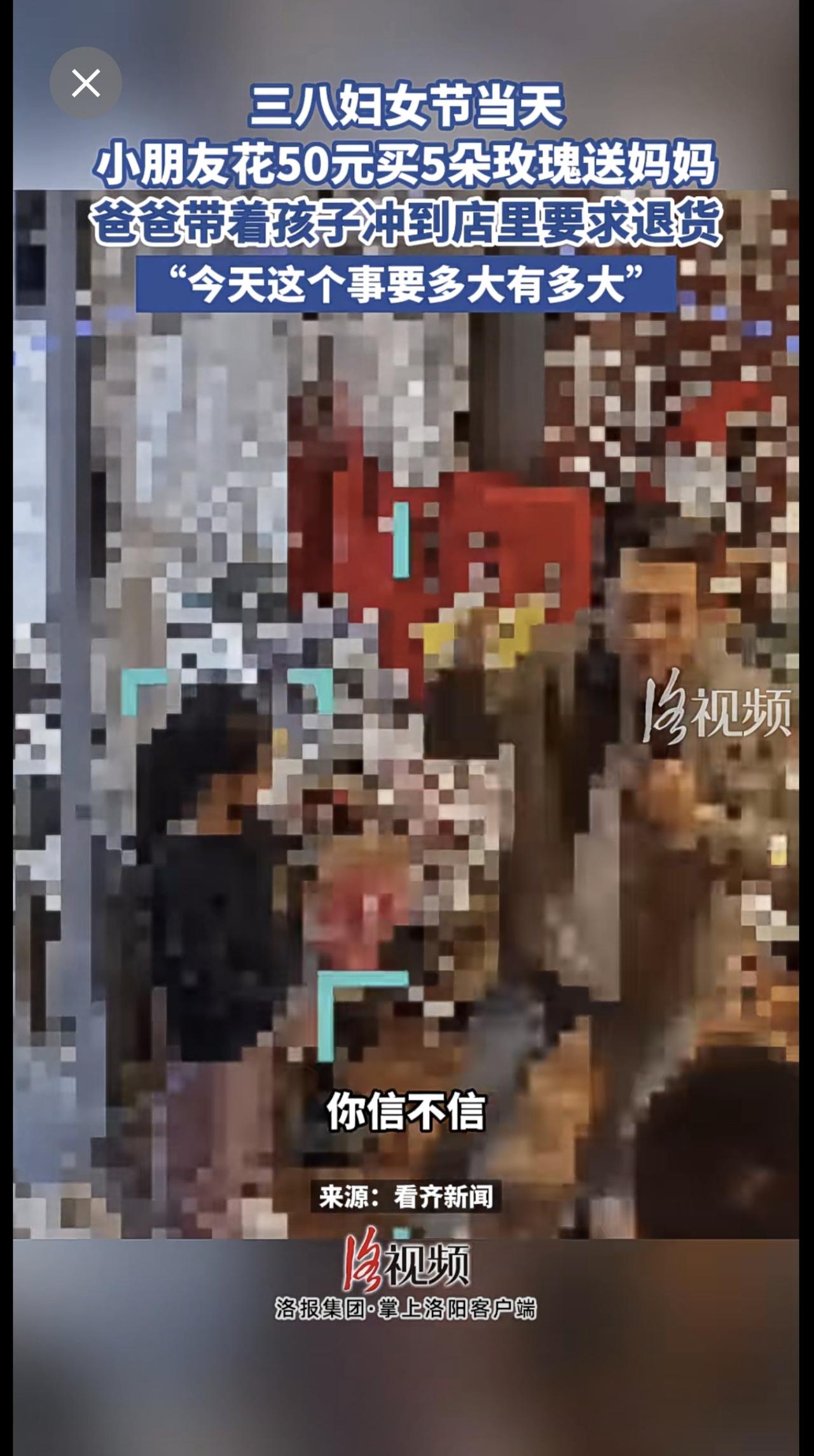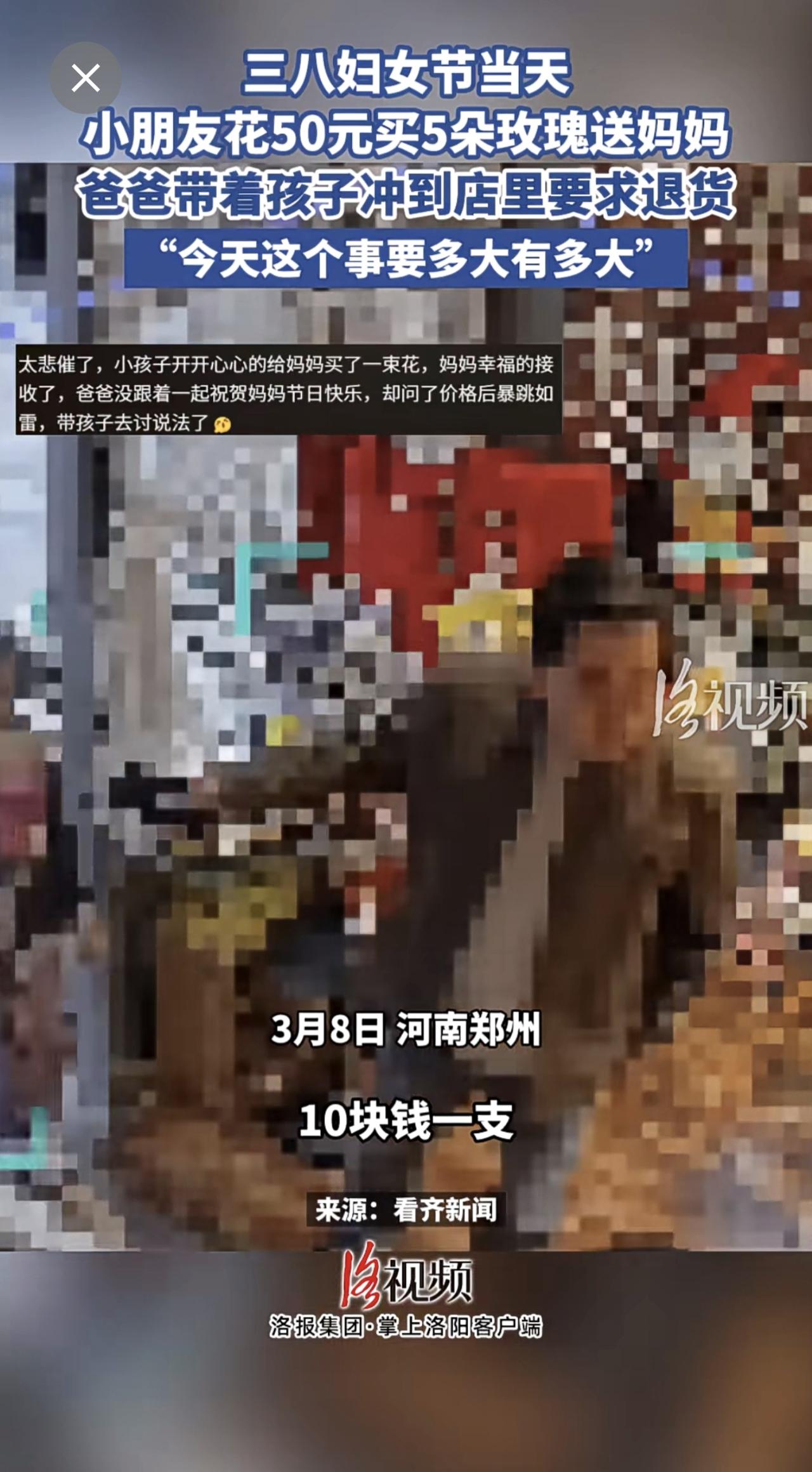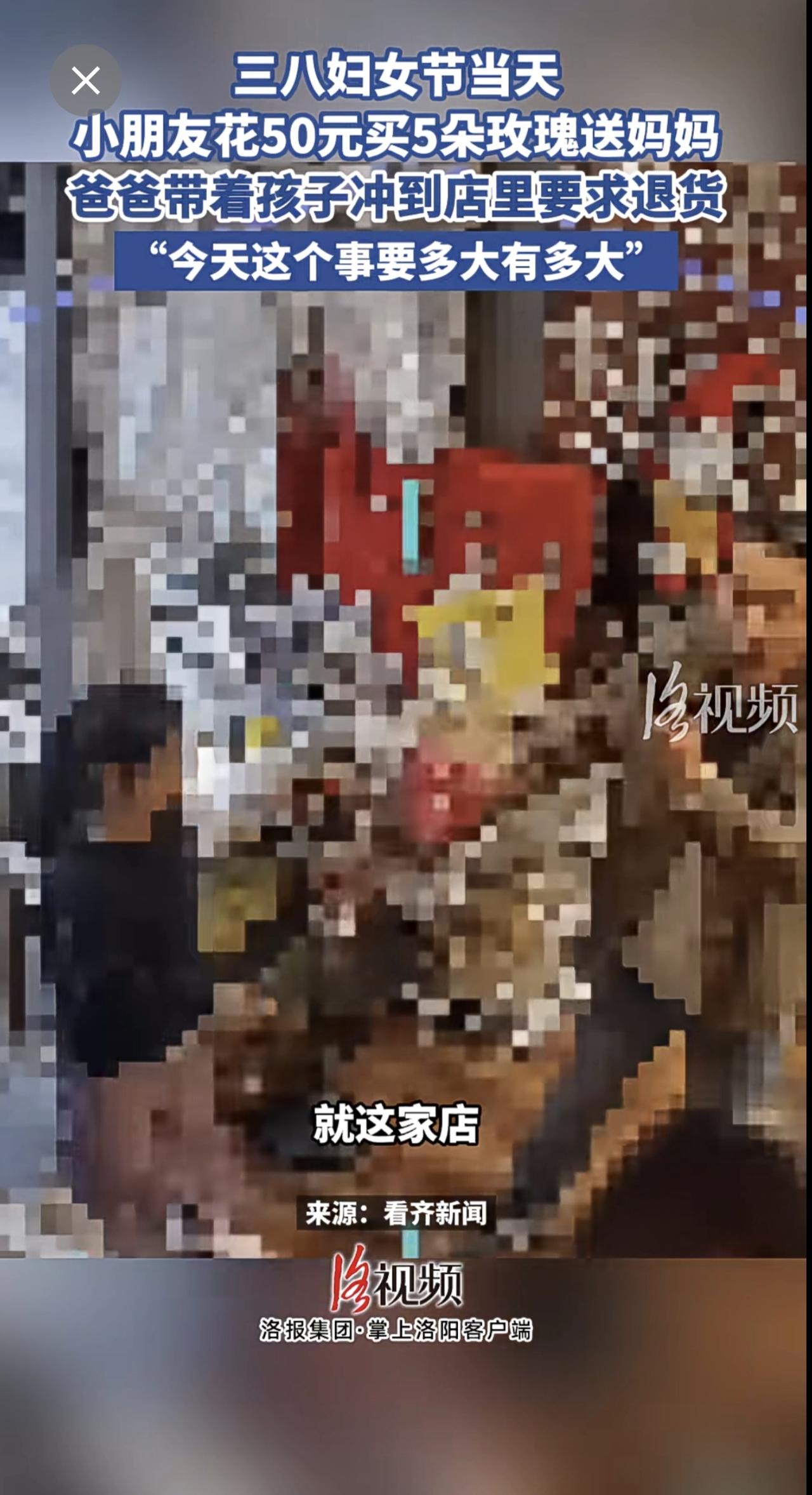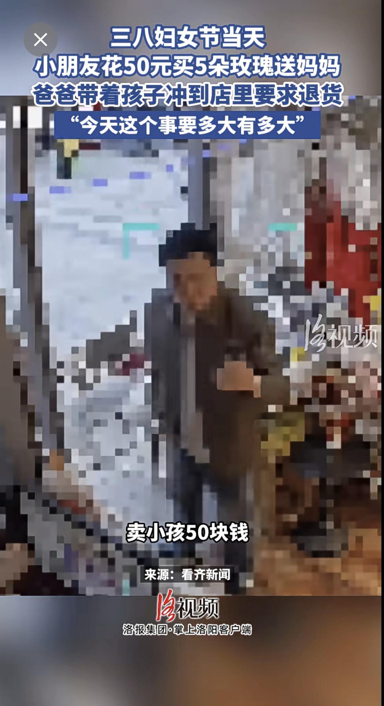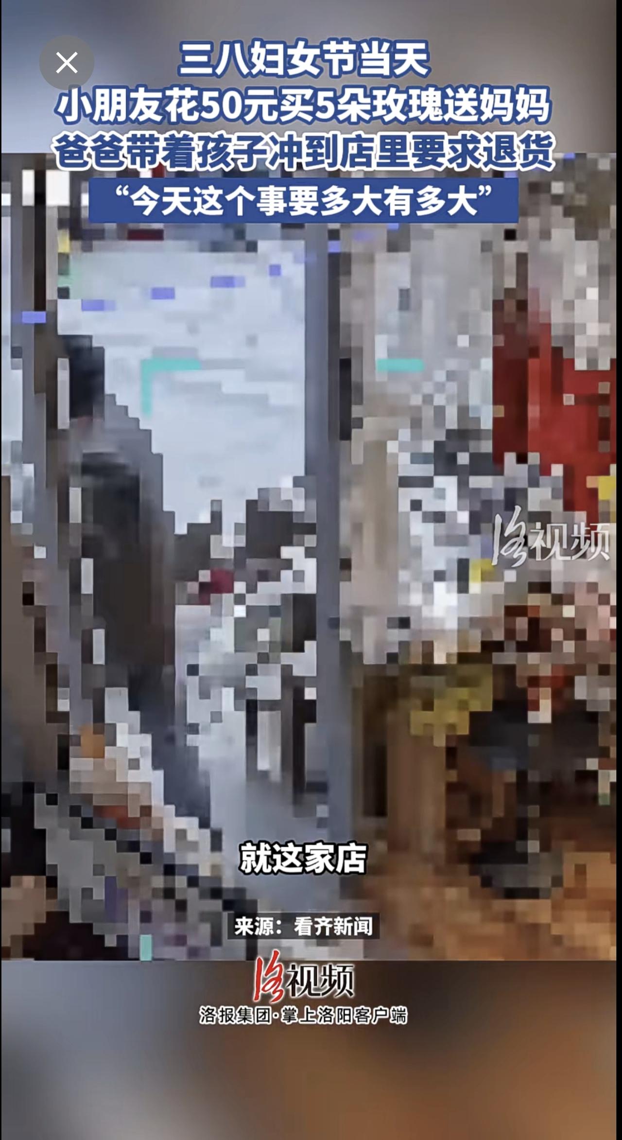 三八妇女节当天,小朋友花50元买5朵玫瑰送妈妈,爸爸带着孩子冲到店里要求退货。