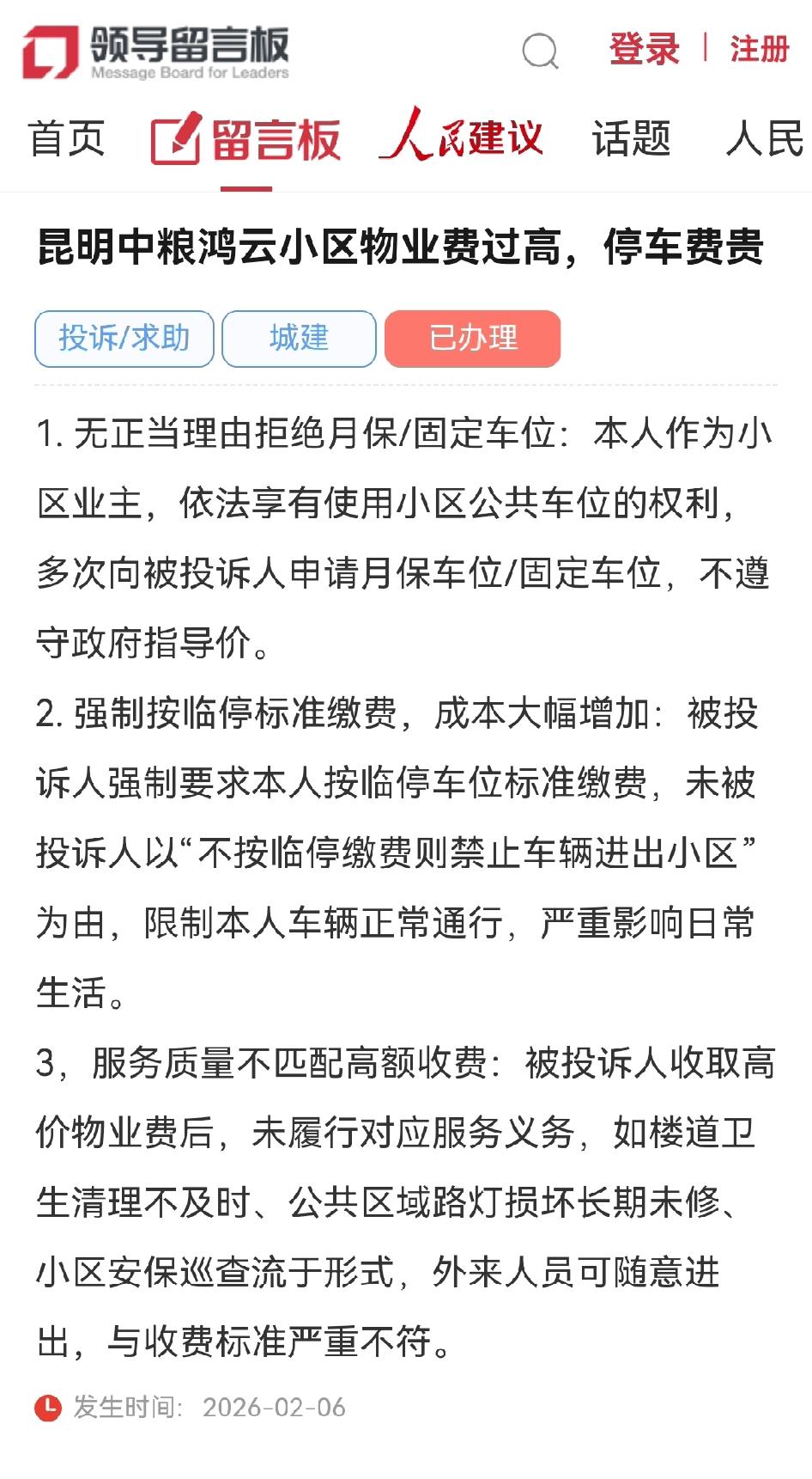 近日昆明网民在领导留言板给云南省委书记留言反映: 昆明中粮X云小区物业费过高,停车费贵 1. 无正当理由拒绝月保/固定车位:本人作为小区业主,依法享有使用小区公共车位的权利,多次向被投诉人申请月保车位/固定车位,不遵守政府指导价。 2. 强制按临停标准缴费,成本大幅增加:被投诉人强制要求本人按临停车位标准缴费,未被投诉人以“不按临停缴费则禁止车辆进出小区”为由,限制本人车辆正常通行,严重影响日常生活。 3,服务质量不匹配高额收费:被投诉人收取高价物业费后,未履行对应服务义务,如楼道卫生清理不及时、公共区域路灯损坏长期未修、小区安保巡查流于形式,外来人员可随意进出,与收费标准严重不符。 发生时间: 2026-02-06 2026-03-02 19:00 昆明市经开区规划建设局,昆明经开区阿拉街道办事处官方回复 网民同志:您好! 您通过人民网领导留言板的留言收悉,经经开区规划建设局、阿拉街道办事处调查处理,现将有关情况回复如下: 1.政府指导价格仅针对公共区域车位定价,未对产权车位进行定价。您反映的出租车位属产权车位,根据《民法典》第240条:“所有权人对自己的不动产或者动产,依法享有占有、使用、收益和处分的权利。” 2.该小区车位属产权车位,根据《民法典》第240条:“所有权人对自己的不动产或者动产,依法享有占有、使用、收益和处分的权利。” 3.物业根据物业服务合同进行服务,如存在履行义务不到位情况,业主可与物业企业协商收费问题或通过司法途径进行维权。 经阿拉街道办事处调查: 一、楼道卫生清理不及时问题 经与物业核实,小区每栋楼均有一名保洁人员负责打扫卫生,若发现楼道卫生脏乱,可第一时间与楼栋管家联系,若管家回复不及时可第一时间拨打物业24小时服务热线,物业在接到反馈后会第一时间进行处理。 二、公共区域路灯损坏长期未修问题 经与物业核实,小区为新交付小区,相关公共设施完善,物业在日常巡查过程中未发现路灯损坏,若业主发现路灯损坏,可第一时间与物业联系,物业会对损坏路灯进行更换维修。 三、小区安保巡查流于形式,外来人员可随意进出问题 经与物业核实,目前小区共有8名保安,后续会再招聘一名,加强小区安保工作,同时小区大门及楼栋均设有门禁系统,外卖、快递等外来人员均需登记后才能进入小区。 阿拉街道已将相关问题反馈至小区物业,并督促小区物业加强管理,及时处理小区业主问题,为小区业主创造一个良好的居住环境。 感谢您的理解与支持,顺祝身体健康、生活愉快!昆明物业纠纷 昆明物业小区 昆明收停车费 你是否支持取消物业费