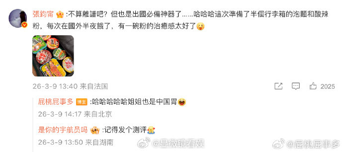 张钧甯去巴黎带了半行李箱泡面 姐姐这次出门行李箱里最“离谱”的必带物竟然是半行李箱泡面,笑死,姐姐果然也是中国胃。