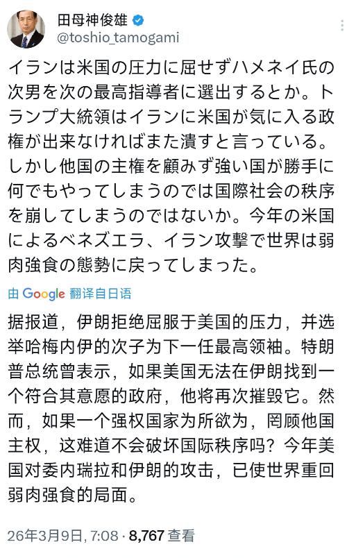 日本极右翼政客、前日本航空自卫队幕僚长田母神俊雄今天(3月9日)写道:“据报道,伊朗拒绝屈服于美国的压力,并选举哈梅内伊的次子为下一任最高领袖。特朗普总统曾表示,如果美国无法在伊朗找到一个符合其意愿的政府,他将再次摧毁它。然而,如果一个强权国家为所欲为,罔顾他国主权,这难道不会破坏国际秩序吗?今年美国对委内瑞拉和伊朗的攻击,已使世界重回弱肉强食的局面。” 当地时间3月9日,伊朗专家会议以压倒性多数票推举穆杰塔巴·哈梅内伊为新任最高领袖。 这位已故最高领袖阿里·哈梅内伊的次子,凭借深厚的宗教学识和丰富的行政经验当选,伊朗各方迅速表态支持,伊斯兰革命卫队明确承诺将服从其指令,捍卫国家主权。 这一选举完全符合伊朗宪法规定的流程,是伊朗内部事务的合法结果,任何外部势力本无权干涉。 但美国总统特朗普在此之前就已多次发出威胁。 他5日公开声称必须亲自参与选定伊朗下一任领导人,明确反对哈梅内伊的儿子接任。 8日特朗普进一步施压,宣称伊朗新领导人必须得到美国批准,否则“不会维持太久”,甚至不排除派出特种部队夺取伊朗浓缩铀的可能。 这些言论完全无视伊朗的国家主权,将他国内政当作美国的决策议题。 美国的威胁并非空谈。 2月25日,美国财政部就已更新制裁名单,对伊朗相关的个人、企业及13艘运输船实施资产冻结和交易限制。 紧接着2月28日,美国与以色列联合对伊朗发动空袭,导致时任最高领袖哈梅内伊及其家人遇难。 3月以来,美军持续向中东调遣兵力和装备,驻韩美军的运输机已陆续撤离韩国,疑似向中东增派物资。 以色列更是直接将伊朗新最高领袖及专家会议成员列为追杀目标,这种公开威胁他国领导人的行为严重违反国际法。 面对强权施压,伊朗没有选择屈服。 伊朗最高国家安全委员会秘书拉里贾尼明确表示,伊朗导弹储备充足且随时可投入作战。 伊斯兰革命卫队在3月8日宣布,24小时内摧毁了4台美军部署在中东的“萨德”反导系统雷达。 9日凌晨,伊朗启动“真实承诺-4”第30轮攻势,用多种导弹和无人机打击了美军基地及以色列北部目标。 伊朗武装部队总参谋部更是发表声明,将在新任最高领袖领导下战斗到最后一刻。 美国的行为不仅针对伊朗,对委内瑞拉的持续干预同样体现其霸权逻辑。 这种动辄以军事威胁、经济制裁干涉他国内政的做法,彻底背离了《联合国宪章》规定的国家主权平等原则。 各国的政治制度和领导人选择,本应由各国人民自主决定,任何国家都无权将自身意愿强加于人。 特朗普曾声称如果伊朗出现不符合美国意愿的政府就将其摧毁,这种言论暴露了霸权主义的本质。 一个国家无论实力强弱,都应得到平等对待。 美国凭借自身军事和经济优势,肆意践踏他国主权,已经引发国际社会的广泛反对。 英国、加拿大、南非等多国近期都爆发了抗议游行,要求美以停止对伊朗的军事打击。 国际秩序的根基在于相互尊重和公平正义。 当强权国家可以随意威胁摧毁他国政府,当各国的主权安全得不到保障,世界只会陷入混乱和冲突。 伊朗的选举是其内部事务,美国的干预和威胁既不合理也不合法。 各国都有权利选择适合自身的发展道路,这种权利必须得到尊重。 当前的局势再次证明,霸权主义是世界和平与稳定的最大威胁。 只有坚守国家主权平等的原则,反对动辄使用武力和制裁,才能维护一个安全稳定的国际环境。 每个国家都应警惕弱肉强食逻辑的蔓延,共同抵制霸权行为,让国际秩序回归公平正义的轨道。