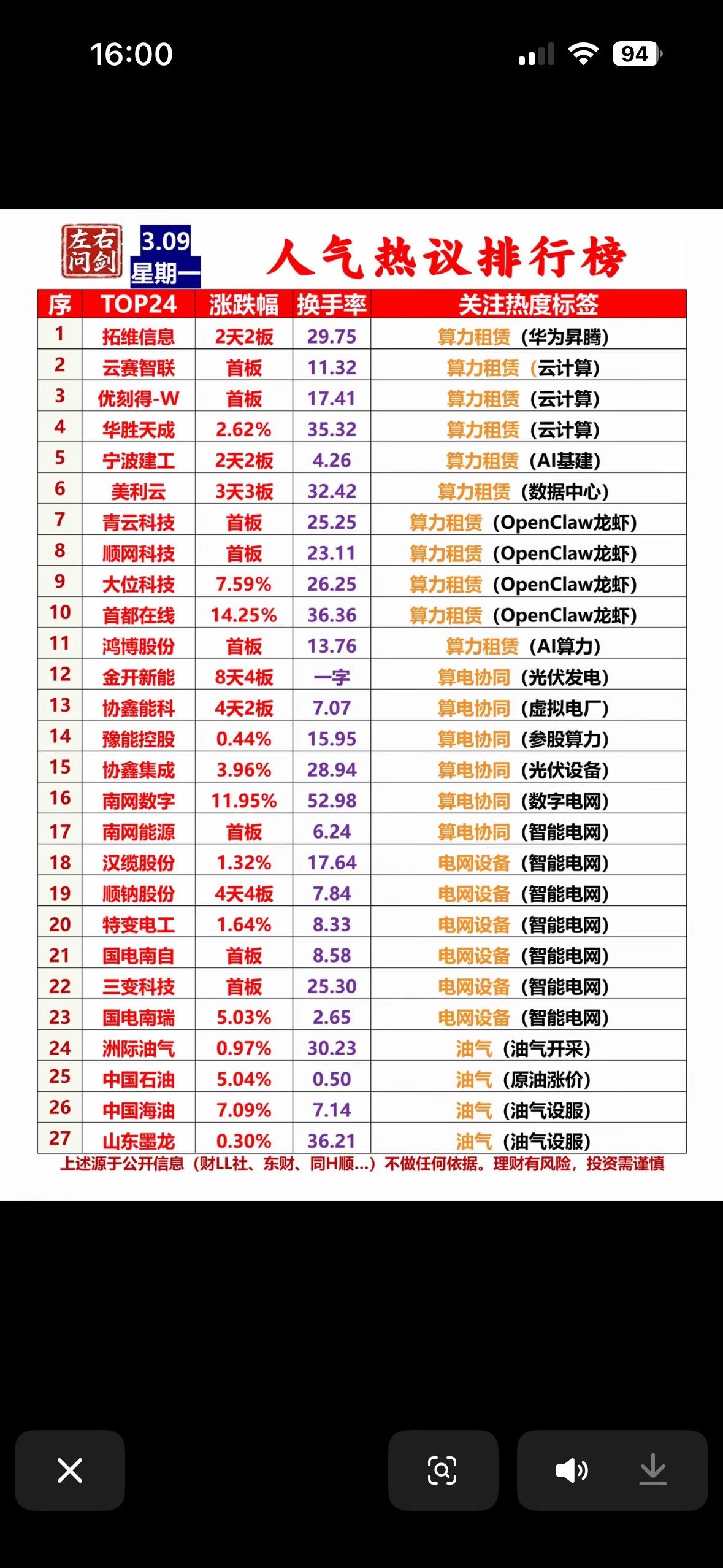 3月9日人气热议排行榜,带你领略股市风云! 3月9日的股市风云真是让人看得心跳加速!当日收盘,沪指跌1.13%至3256.39,深成指跌1.12%,创业板跌0.63%,涨跌比约1:8,北向净流出41.76亿,成交额还缩量了。 主线方面,油气能源和电力/算电协同逆势领涨,算力/半导体/机器人则全线走弱。在电力/算电协同这条最强主线上,顺钠股份4连板,是情绪龙头;汉缆股份3连板,资金抱团趋势加速;金开新能7天4板,处于人气榜前列。这一天的股市就像一场刺激的冒险,充满了变数和挑战。