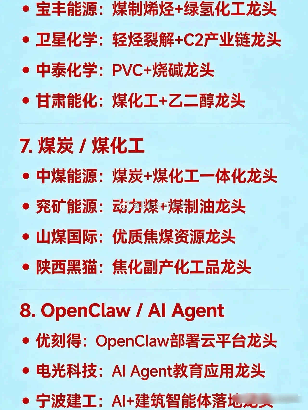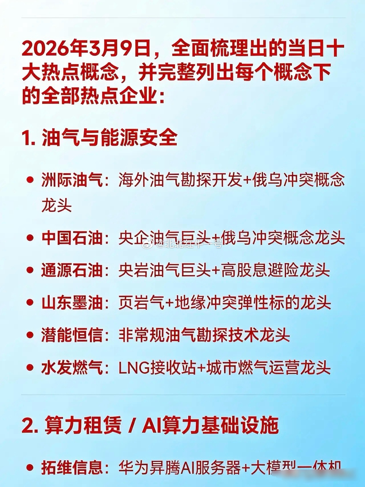 2026年3月9日,全面梳理出当日十大热点概念,并完整罗列每个概念下的所有热点企业:油气与能源安全洲际油气:海外油气勘探开发+俄乌冲突概念龙头中国石油:央企油气巨头+高股息避险龙头通源石油:页岩气+地缘冲突弹性标的龙头山东墨龙:油套管设备出口龙头潜能恒信:非常规油气勘探技术龙头水发燃气:LNG接收站+城市燃气运营龙头算力租赁 / AI算力基础设施拓维信息:华为昇腾AI服务器+大模型一体机龙头鸿博股份:英伟达合作+算力租赁运营龙头宏景科技:政务AI算力中心建设龙头优刻得:国产云+AI算力平台龙头云赛智联:国资云+算力调度平台龙头光伏新技术与太空光伏协鑫集成:钙钛矿/HJT电池+太空光伏组件龙头昱能科技:微型逆变器全球龙头德业股份:储能逆变器出口龙头锦浪科技:组串式逆变器龙头上能电气:大型地面电站逆变器龙头正泰电源:户用光储系统集成龙头算电协同 / 虚拟电厂 / 智慧能源豫能控股:抽水蓄能+算电协同转型龙头协鑫能科:移动能源+数据中心供电龙头金开新能:绿电直供数据中心龙头银星能源:风电+智能微网运营龙头韶能股份:生物质发电+区域综合能源服务龙头电网设备 / 特高压 / 柔性直流输电中国西电:特高压开关+柔性直流换流阀龙头汉缆股份:超高压电缆+海缆出口龙头国电南自:继电保护+智能变电站自动化龙头三变科技:变压器+电网设备出口龙头泽宇智能:配电网智能化改造龙头顺钠股份:智能配电变压器细分龙头化工品涨价链金牛化工:甲醇产能+价格弹性龙头赤天化:尿素+甲醇一体化龙头泸天化:合成氨+化肥龙头宝丰能源:煤制烯烃+绿氢化工龙头卫星化学:轻烃裂解+C2产业链龙头中泰化学:PVC+烧碱龙头甘肃能化:煤化工+乙二醇龙头煤炭 / 煤化工中煤能源:煤炭+煤化工一体化龙头兖矿能源:动力煤+煤制油龙头山煤国际:优质焦煤资源龙头陕西黑猫:焦化副产化工品龙头OpenClaw / AI Agent优刻得:OpenClaw部署云平台龙头电光科技:AI Agent教育应用龙头宁波建工:AI+建筑智能体落地龙头汉得信息:企业级Agent解决方案龙头北信源:AI终端安全+Agent管控龙头创新药 / 医药政策回暖万邦德:心脑血管创新药+业绩预增龙头海思科:中枢神经创新药研发龙头塞力医疗:IVD+AI诊断协同龙头商业航天 / 卫星互联网航天发展:电磁蓝军+低轨卫星通信龙头中国卫星:小卫星制造+遥感应用龙头天银机电:太空光学载荷部件龙头
