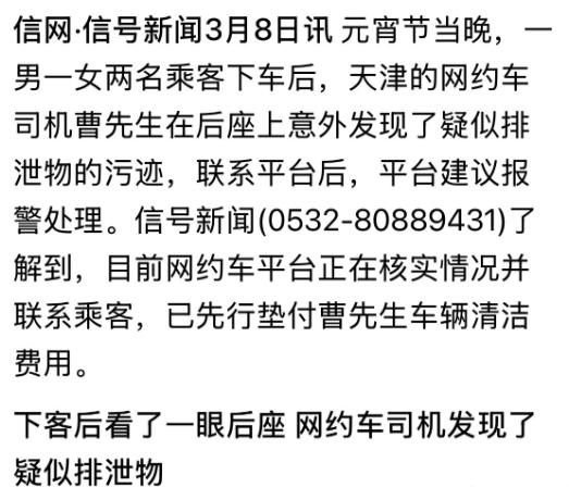 天津,男子跑网约车,一男一女下车后,他发现后座上突然多了几滩土黄色,糊状的东西,看起来就像人的排泄物,男子膈应坏了,拿湿巾擦了10分钟,又喷上除味剂,才勉强清理掉,可他心里还是不舒服,就反映给平台,希望能找到客人谈赔偿,可客服的回复却让他寒心。 元宵节那天下午,这位网约车司机和往常一样,在天津街头接单跑单,想着多跑几单,能多赚点家用。 下午三点多,他接到一个订单,乘客是一男一女,看起来二十多岁,上车后径直坐在了后排,全程没有过多交流,只是低头各自玩手机。 司机师傅按照导航路线平稳行驶,一路上没发现任何异常,也没闻到什么奇怪的味道,只当是普通的一趟订单。 十几分钟后,车辆到达目的地,两位乘客匆匆付了钱,打开车门就下了车,连一句谢谢都没说,脚步显得有些匆忙,当时司机师傅也没多想,只以为他们是赶时间,便准备接单前往下一个目的地。 就在他系好安全带,准备启动车辆的时候,眼角的余光无意间扫过后排,瞬间愣住了。后排座椅的坐垫上,赫然出现了几滩土黄色的糊状污渍,分布在两个座位之间,质地粘稠,凑近了还能闻到一股淡淡的异味,怎么看都像是人的排泄物。 司机师傅当场就膈应坏了,赶紧推开车门下车,跑到后排仔细查看,越看越恶心,胃里一阵翻江倒海。 他跑网约车这么多年,什么样的乘客都遇到过,吃东西弄脏座椅、不小心打翻饮料的情况时有发生,但这样的情况,还是第一次遇到。 他来不及多想,赶紧从车载储物格里拿出备用的湿巾,蹲在车旁一点点擦拭污渍。污渍很粘稠,粘在座椅上很难清理,他反复擦拭,换了一张又一张湿巾,手指都擦得发僵,整整花了10分钟,才把可见的污渍擦干净。 可仅仅擦干净污渍还不够,车内的异味越来越明显,要是不处理,下一位乘客上车肯定会投诉。他又拿出车载除味剂,对着后排座椅、车厢角落反复喷洒,喷了足足三遍,又开窗通风好几分钟,异味才勉强淡了一些,但还是能隐约闻到。 清理完这一切,司机师傅的心情糟到了极点,不仅耽误了接单的时间,还浪费了一包湿巾和大半瓶除味剂,更让他难受的是,一想到后座曾经有那样的污渍,就浑身不自在,连坐进驾驶座都觉得膈应。 他琢磨着,这件事是那两位乘客造成的,他们理应承担相应的责任,赔偿自己的损失,至少要补偿湿巾、除味剂的费用,以及自己耽误接单的误工费。 于是,他打开网约车平台,找到客服,详细说明了事情的经过,还拍了座椅污渍的照片和清理后的视频作为证据,希望客服能帮忙联系到那两位乘客,协商赔偿事宜。 他耐心等待着客服的回复,心里还抱着一丝期待,想着平台会公正处理,帮自己讨回公道。可他等了半个多小时,客服才给出回复,语气平淡,没有丝毫歉意,只说无法提供乘客的个人信息,也无法强制乘客进行赔偿,让他自行协商解决。 司机师傅瞬间就寒心了,他反复跟客服说明,自己根本联系不到乘客,要是平台不帮忙,这件事就只能不了了之,自己的损失也没人承担。 可客服始终重复着同样的话,没有任何解决问题的诚意,甚至暗示他,这种情况属于乘客个人行为,平台也无能为力。 后来,他又尝试多次联系平台客服,可得到的回复始终一样,没有任何进展。他也明白,没有乘客的个人信息,自己根本无法维权,只能默默承受这份损失,把车内彻底清洁一遍后,硬着头皮继续接单。 对于网约车司机来说,车子就是他们的饭碗,精心维护车辆,既是为了乘客的体验,也是为了能顺利接单。可遇到这样不文明的乘客,再加上平台的冷漠应对,让司机师傅的辛苦付出,变得一文不值。 对此,你们有什么看法,欢迎评论留言~