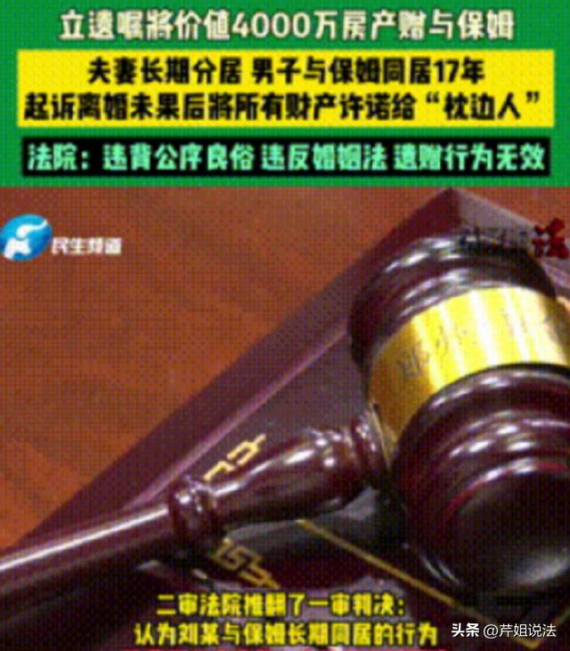深圳,一男子跟保姆好上了,俩人还跑到外面同居了17年。保姆一直撺掇男子离婚,但是原配妻子坚决不肯离婚。男子无奈只能起诉判离,但是遭到相关部门拒绝。男子又想办法立下遗嘱,把300平方的房子、4000万的财产全都赠与保姆。就在打离婚官司期间,男子离开人世,保姆就拿出遗嘱准备继承男子的财产。但是,妻子不同意,保姆则准备上诉争夺财产。 当保姆上诉后,没想到相关部门的判决让她大跌眼镜,做了人家17年的第三者,最后就只能灰溜溜跑路。 (本案例取材于:河南民生频道) 婚外的恋情,最终会换来怎样的代价呢?放心,法律都结算的明明白白。 一男子刘某竟然爱上了来家做保姆的杨某,当年杨某只有38岁,年轻、会照顾人、还很体贴。 刘某经常暗地里跟杨某有来往,两个人就这样好上了。刘某甚至还背着妻子陈某,直接就跟杨某在家里的房间里滚床单。 就这样,两个人有了很不正确的关系。被原配妻子陈某知道后,这两个人也不知悔改,甚至还扬言,准备私奔,要搬出去居住。 刘某在外面找了房子,带着保姆杨某,二人过上了没羞没臊的生活,两个人甚至还非法同居长达17年。 要说这17年内,保姆杨某真的是没少闹心,一直撺掇着刘某赶紧跟妻子离婚。 但是每次只要提到离婚,都会被妻子陈某严词拒绝。妻子坚守阵地,一直守护着二人之间的合法关系。 可是,丈夫的心早就飞走了,这个家庭也被杨某给破坏了,要说气,妻子是真的气。但是,她留守婚姻,就是为了争一口气。 而丈夫跟保姆那边,完全没有放弃,仍然在坚持着。 丈夫刘某一直心心念念的要给保姆一个名分,于是就发起了离婚诉讼,第一次上诉后,被相关部门驳回。 驳回之后,刘某为了给保姆杨某留个后路,回来就写下了遗嘱,要把名下300平的房子、以及4000万的财产,全都赠与保姆杨某。 看到这份遗嘱的时候,杨某可开心了,她感觉,做第三者这么多年,没白费。 之后刘某则继续上诉,这一次相关判离了,但是原配妻子陈某坚持不答应,提出了上诉,因此也就没有最终判决。 婚姻还没有结束,但是刘某却倒下了。 一切来的就是这么突然,刘某突发疾病离世,他跟陈某仍然是合法的夫妻。 但是保姆杨某却带着遗嘱上门了,要求原配陈某将财产分给她。 原配当初就拒绝,并且抛下一句话:有本事你去上诉。 没想到这个杨某还真的不要脸,果然就上诉了。那么,相关部门会判定,这个遗嘱可以生效吗?保姆可以把财产都卷走吗? 终审判决,让大家都大跌眼镜。 刘某跟保姆杨某的长期同居行为,违反婚姻法的规定——禁止有配偶者跟他人同居。 另外,这俩人的行为违背公序良俗,违背夫妻的忠实义务。 在夫妻婚姻关系存续中,刘某没有征得原配妻子的同意,当方面处分大额财产,准备立遗嘱留给杨某,此举已经侵犯了配偶的财产处理权。 最后判决:刘某的遗嘱全部无效,300平的房子、4000万的财产,全都归原配妻子陈某以及其子女继承。 看来,保姆杨某还是笑的太早了,原配才是那个可以笑到最后的人。 在婚姻存续期间,男子长期跟保姆同居,还立遗嘱试图把夫妻共同财产留给保姆(第三者)继承。这个遗嘱是否可以生效呢? 这个遗嘱通常不会生效。 根据《民典法》第8条规定,民事主体从事民事活动,不得违反法律,不得违背公序良俗。《民典法》第1153条规定,处分夫妻共同财产的,一方不得擅自处分全部财产。 法律有明确规定,在婚姻存续期间,丈夫单方面将夫妻共同财产赠与长期共同居住的保姆,即便遗嘱的形式合法,但是内容违背了《民典法》中的公序良俗原则,因此无效。 刘某跟杨某本身行为就不合法,立下的遗嘱也会因为违反公序良俗和侵犯配偶对共同财产的平等处理权,会被判定无效。 婚姻忠诚,这并非一句空话,婚外的恋情,伤害原配、伤害家人、破坏家庭、更加无法得到法律的庇护。 违背法律跟道德的财产约定,最终也只是镜花水月一场空。 对于本案,您怎么看呢?
