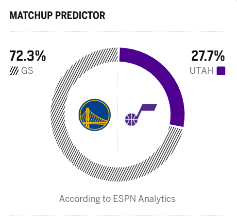 ESPN预测明日比赛:勇士胜率高达72.3%,爵士胜率27.7%