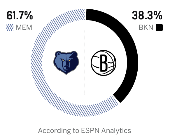 ESPN预测灰熊vs篮网:灰熊胜率61.7%,篮网胜率38.3%