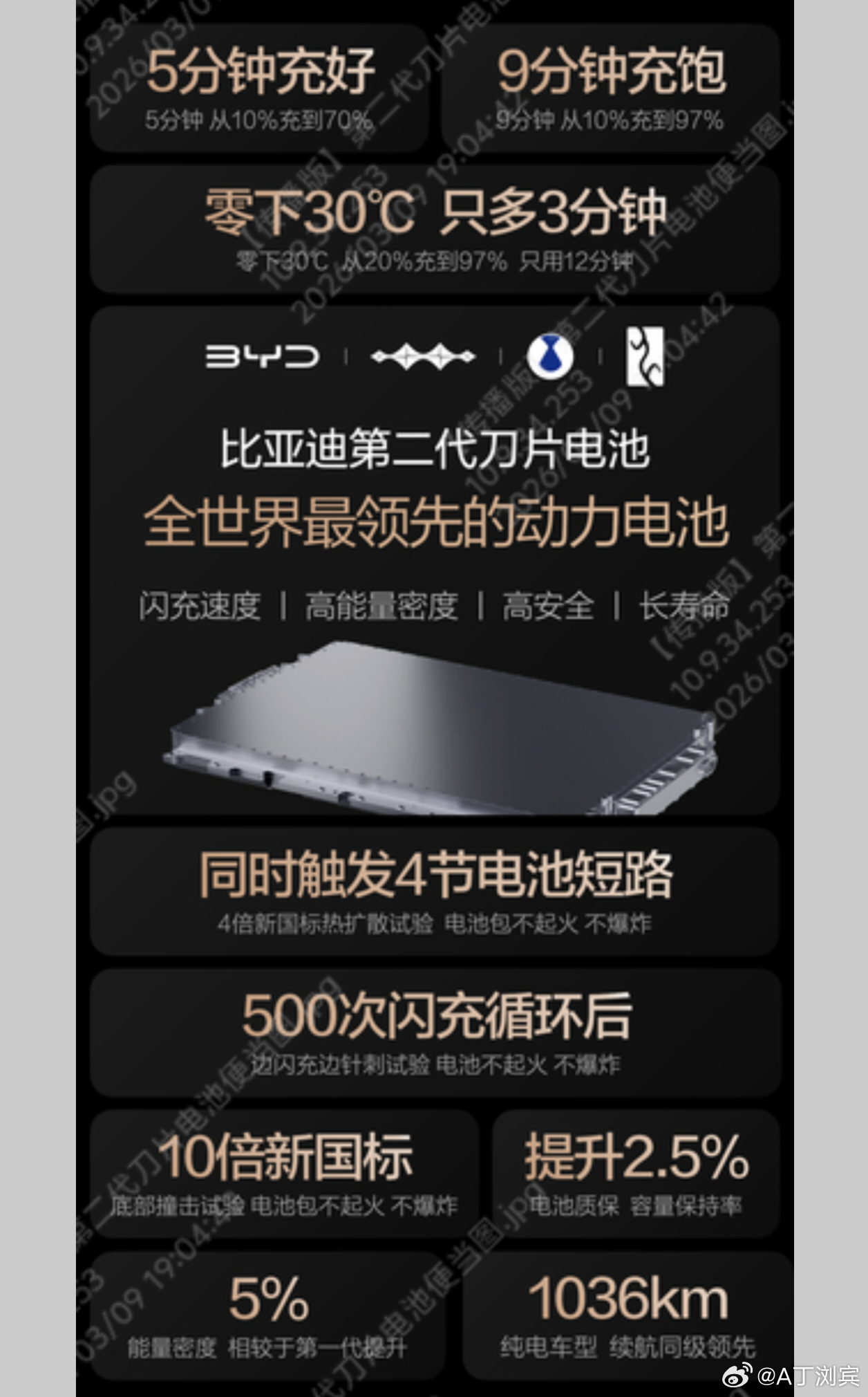 六年磨一刀,比亚迪第二代刀片电池来了比亚迪汽车资讯硬核闪充技术树立行业新标杆新能源车 2026年3月5日,比亚迪重磅发布第二代刀片电池,硬核闪充技术树立行业新标杆,攻克充电慢、低温充电难痛点。常温5分钟充好、9分钟充饱;-30℃低温仅多3分钟,兼具高能量密度、长寿命与高安全。依托锂离子高速通道与全温域智能热管理,闪充少产热、快散热,兼顾快充与耐用。质保加码,容量保持率提升2.5%,低于77.5%免费包换,电芯终身保修。通过500次闪充循环后边闪充边针刺、4电芯热扩散、10倍国标底部撞击等超严苛测试,全生命周期安全稳定。技术已搭载于腾势Z9GT、仰望U7、方程豹、王朝/海洋网等多品牌车型,以全链技术实力重新定义全球领先动力电池。 无锡