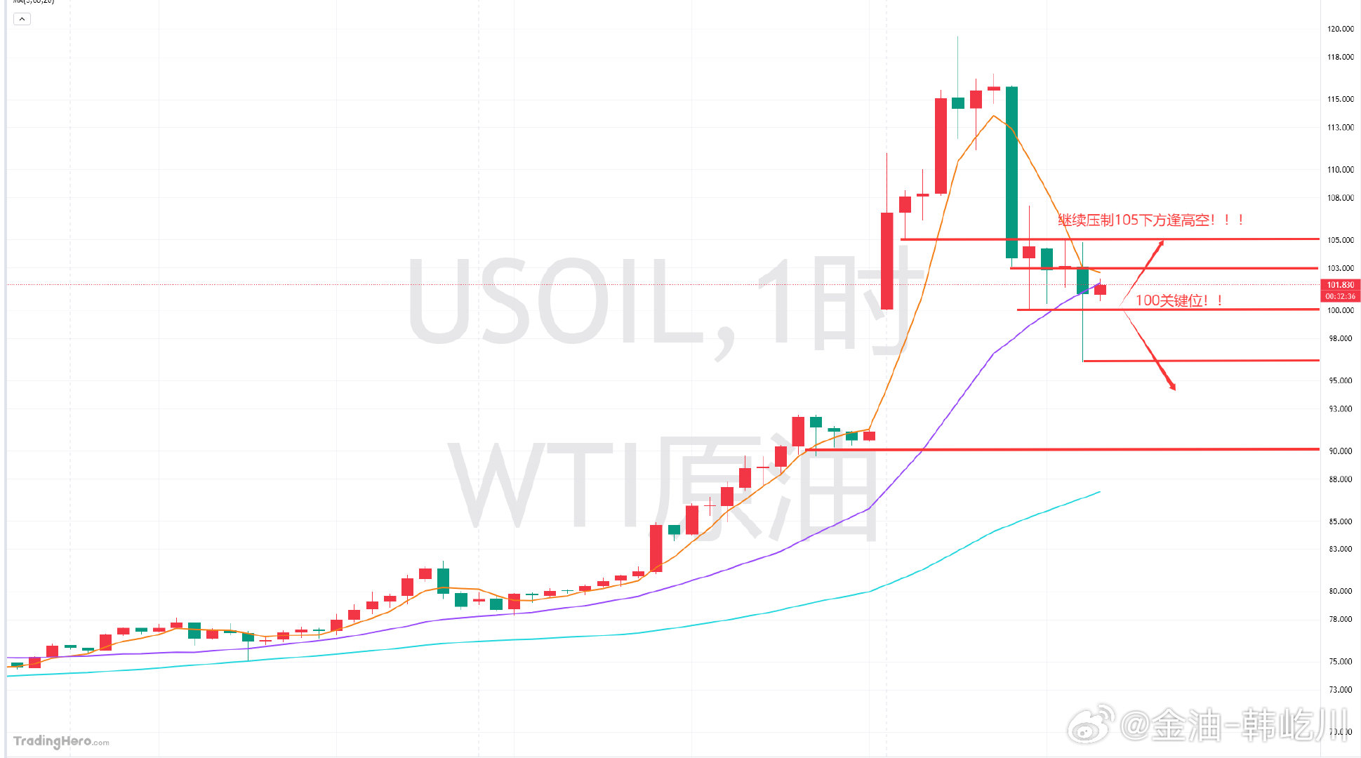 原油目前100美元是多空分水岭,整体还是偏强的,但需警惕回调风险,上方重点关注105关键压力位,短时压力在103附近!逢高空,没到位置先等待,下方目标看100,稳住转多!今日主要还是围绕100美元关口进行,以及今日收线情况下的100美元关口得失!!原油 黄金