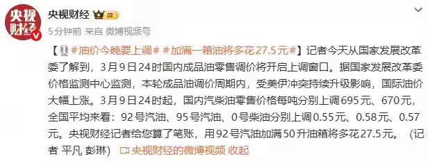 3月9日24时,国内油价迎来大幅上调!汽油每吨上调695元,柴油每吨上调670元。92号汽油每升涨0.55元,95号涨0.58元。算算账,50升的油箱加满一箱92号,要比之前多花27.5元。此次上涨主要受国际油价波动影响,车主出行成本再添压力,下一轮调价窗口将在3月23日开启。