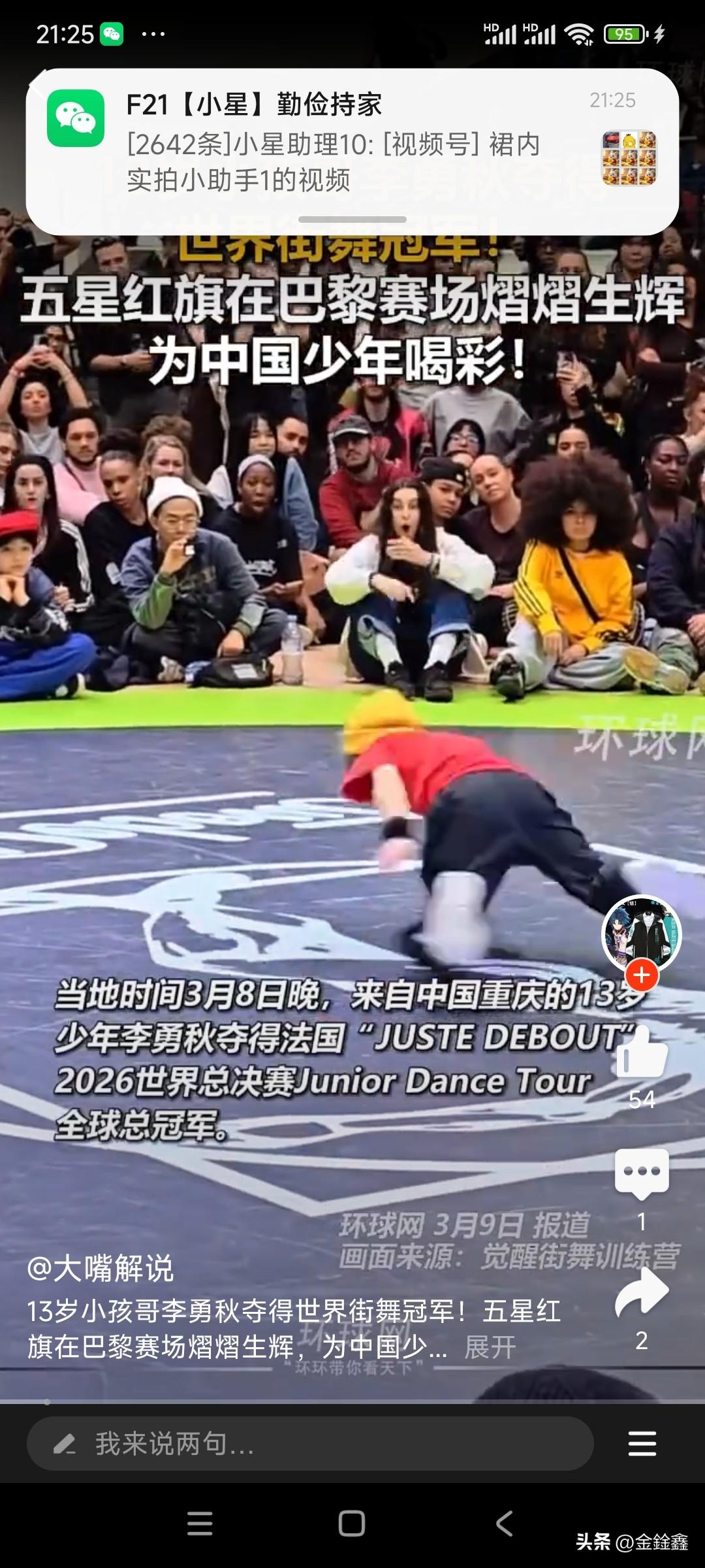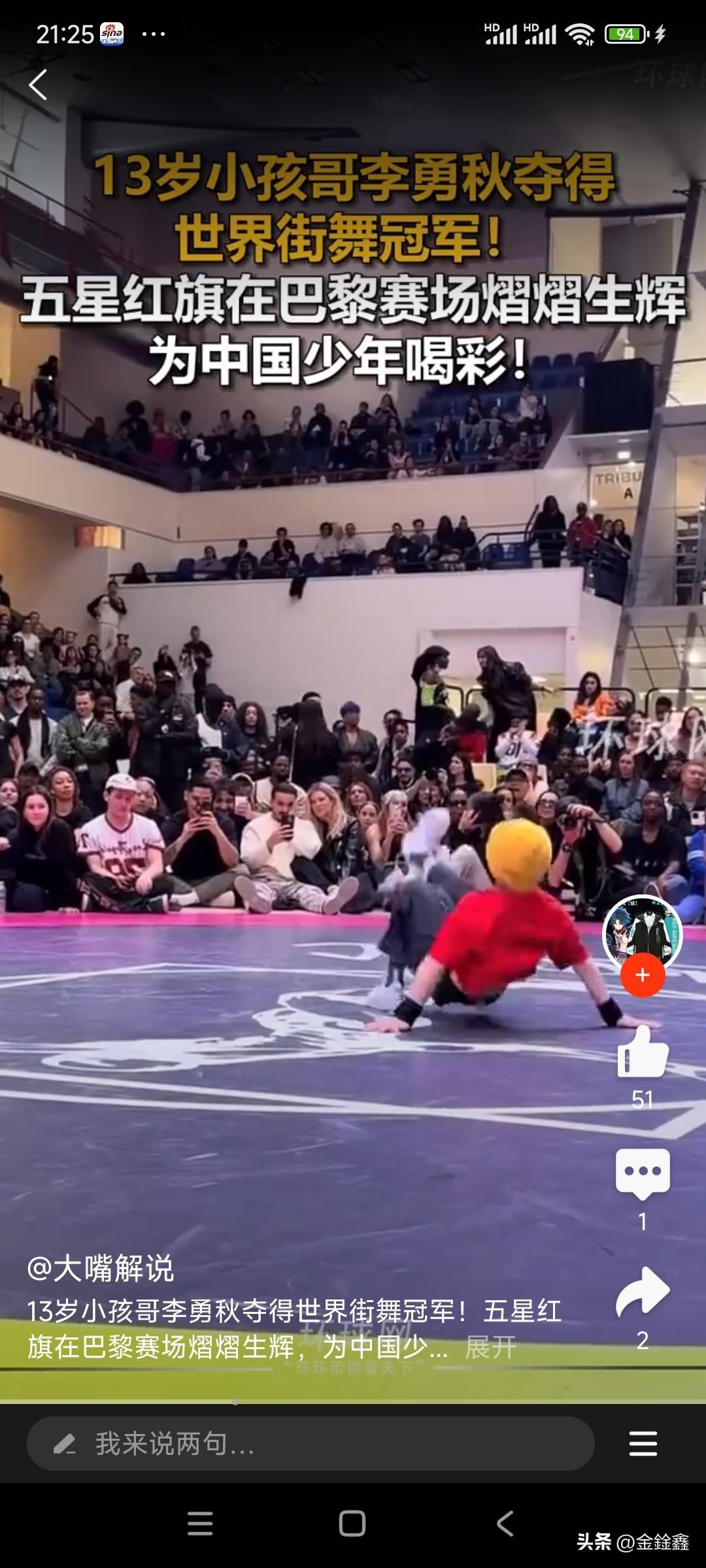 红衣少年震惊巴黎!13岁“小孩哥”李勇秋,用中国功夫跳街舞夺冠! “这是魔法般的身体控制!”3月8日,在法国“JUSTE DEBOUT”世界街舞总决赛的璀璨舞台上,13岁的重庆少年李勇秋身着红衣,以一套融合中华武术的霹雳舞编排,力克群雄,一举夺魁!当评委高举满分牌,全场观众起立欢呼时,这个身高不足1米6的中国少年,用实力让世界见证了东方力量的崛起。 李勇秋的夺冠,绝非偶然。从5岁街头偶遇街舞表演,到如今站上世界之巅,他每周训练5到6天,寒暑假更是全天泡在舞房。为了将李小龙的发力方式融入舞步,他反复打磨动作,膝盖淤青是家常便饭。决赛中,他以一个融合醉拳身法的连续地面旋转收尾,头部倒立定格瞬间如雕塑般凌厉,彻底征服了挑剔的法国评委。 这不仅是李勇秋个人的胜利,更是中国街舞厚积薄发的缩影。近年来,中国选手在世界青少年街舞赛事中获奖数量激增,他们将太极、少林棍法等传统元素融入现代街舞,用独特的中国美学表达,颠覆了世界对亚洲街舞的认知。 信息来源:今日头条、中华网、澎湃新闻