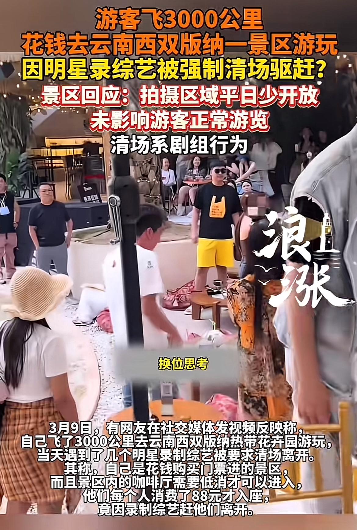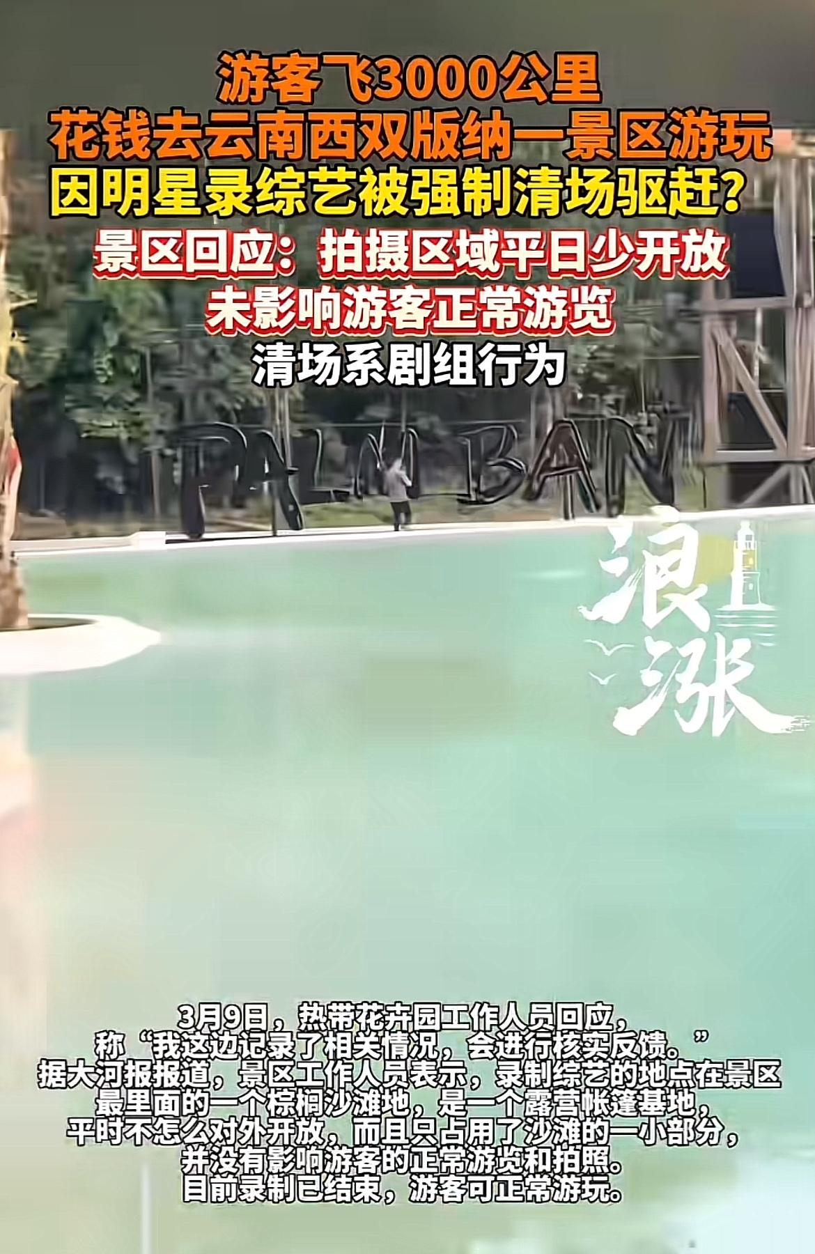 3月9日,云南西双版纳热带花卉园可热闹了。有游客飞3000公里来游玩,花门票钱入园,还在咖啡厅低消88元入座,却因明星录制综艺被要求清场。游客觉得很憋屈,认为景区要清场就该提前告知。 景区工作人员回应,录制地点在最里面的棕榈沙滩露营基地,平时很少开放,只占了沙滩五分之一,不影响游客正常游览和拍照。现在录制结束,游客能正常游玩了。但这事儿也引发了争议,有人觉得景区清场侵犯游客权益。出去玩遇到这事儿,换谁都闹心,景区以后可得多考虑游客感受啊。