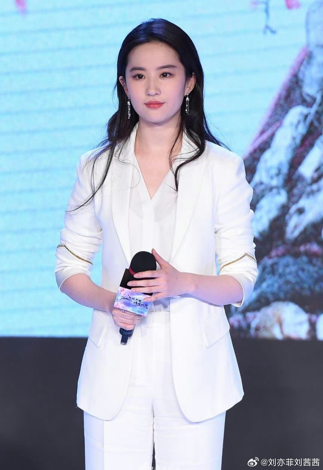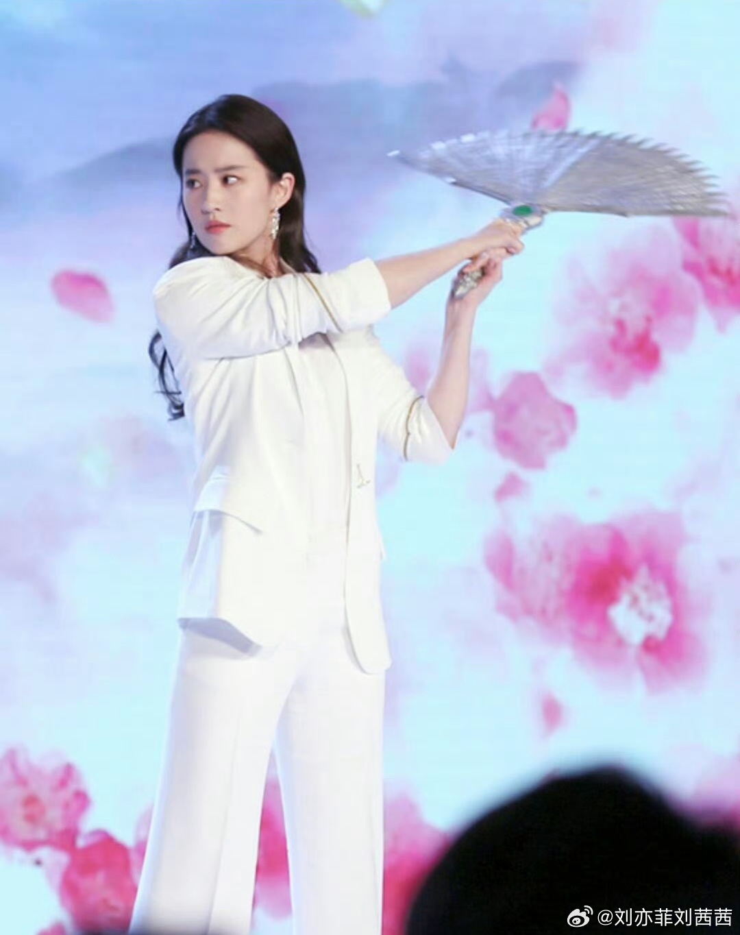在影视宣传活动的舞台上,背景是梦幻的桃花与山水投影,刘亦菲手持话筒从容发言,又执扇摆出飒爽姿态,仿佛在现代与古典之间自由切换。