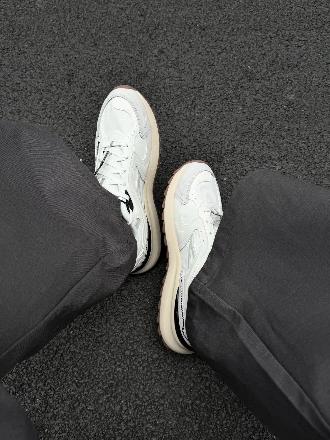 第一眼就被这个干净的配色戳中,奶白+米白的层次很高级,完全不单调。鞋身用了不同质感的拼接,鞋面是那种软软的反毛皮,光滑的合成革和细腻的织物交织,每一块的过渡都处理得很细腻,摸起来很有分量。侧面的锯齿缝线是点睛之笔,黑色线条在白鞋上特别利落,复古感一下就出来了,这种细节,真的只有拿在手里才能体会到。