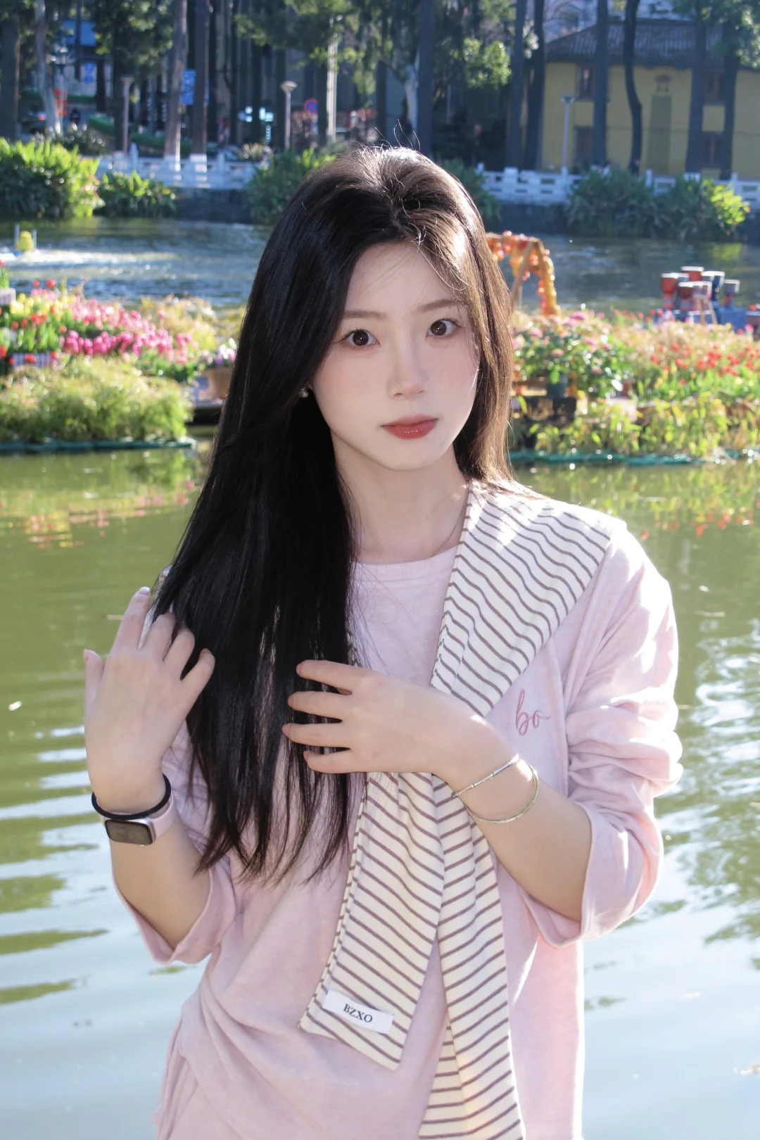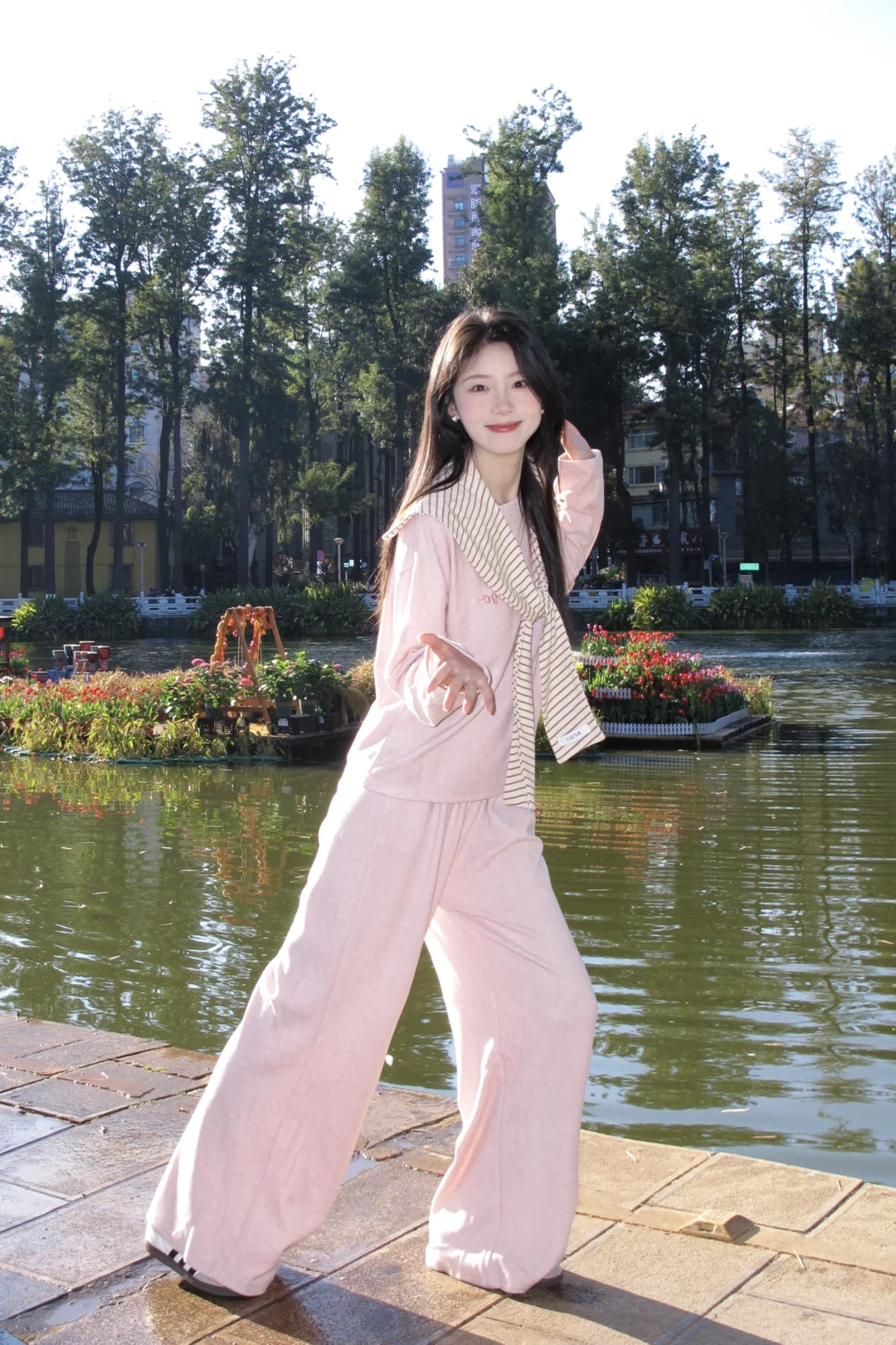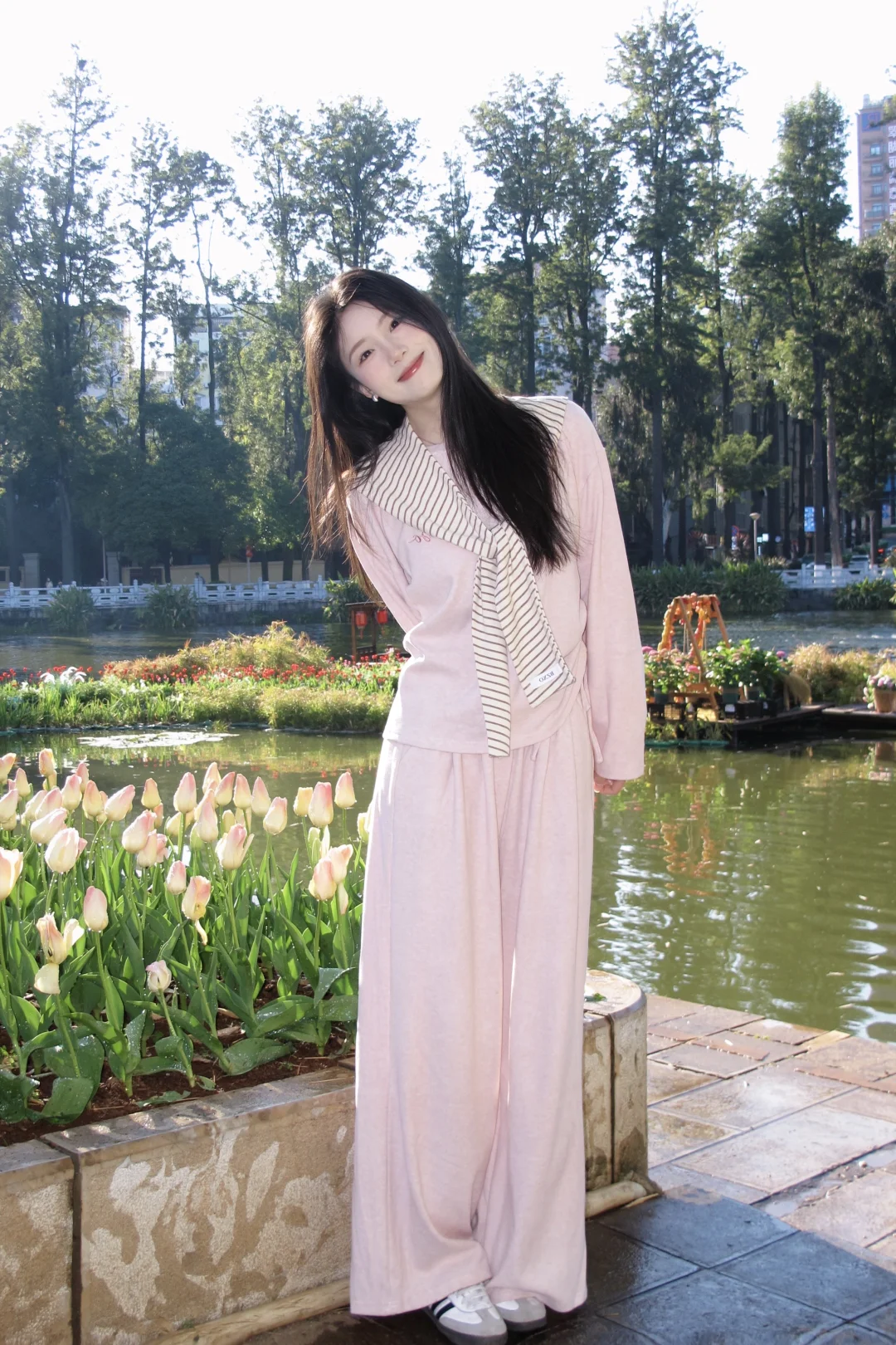 温柔粉穿搭,湖边漫步,静享美好时光