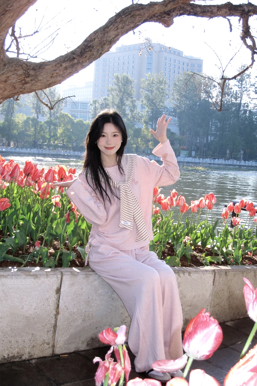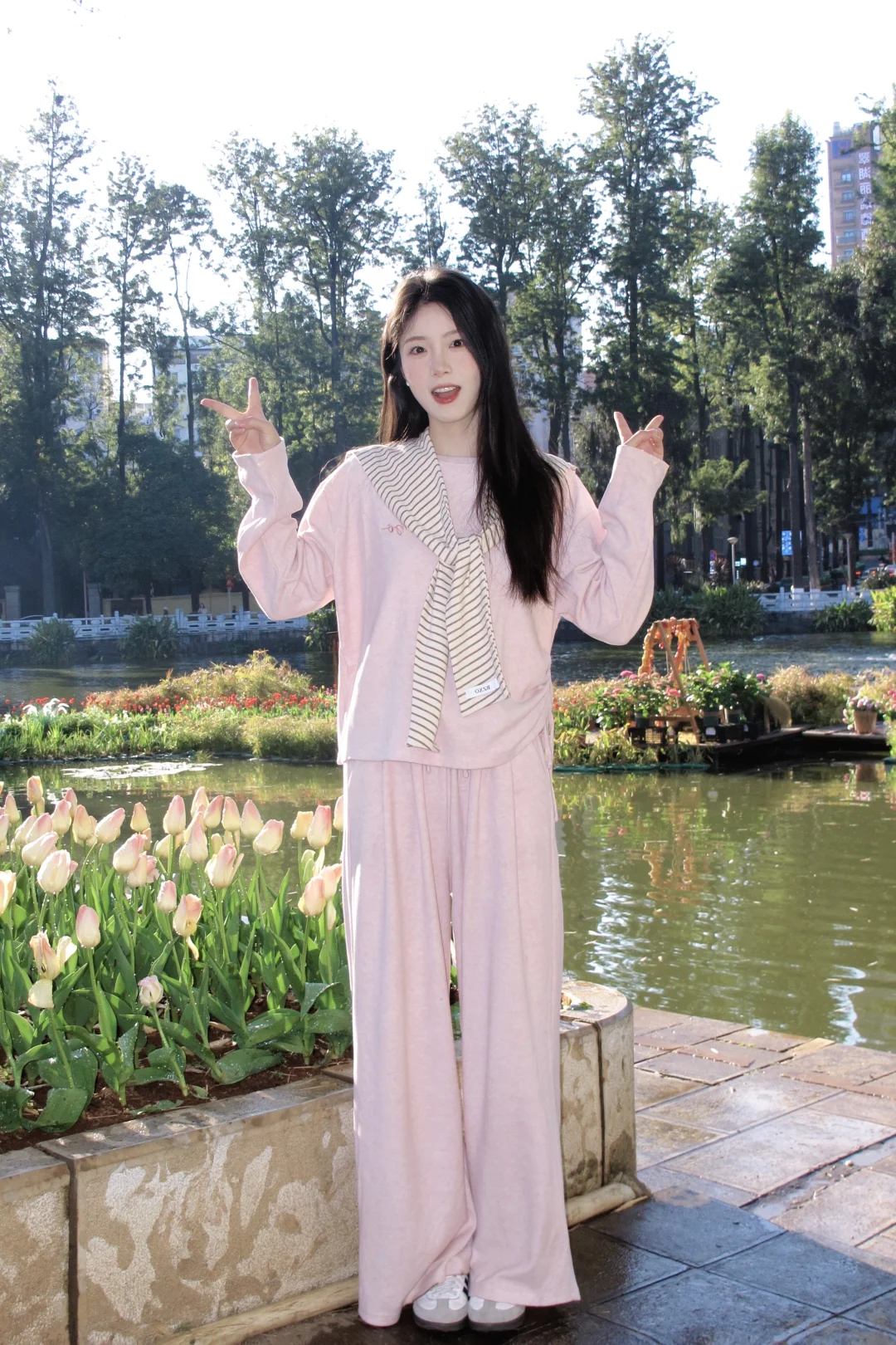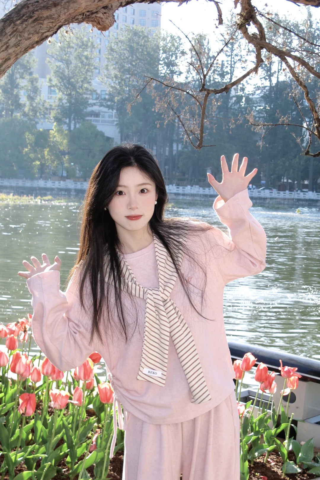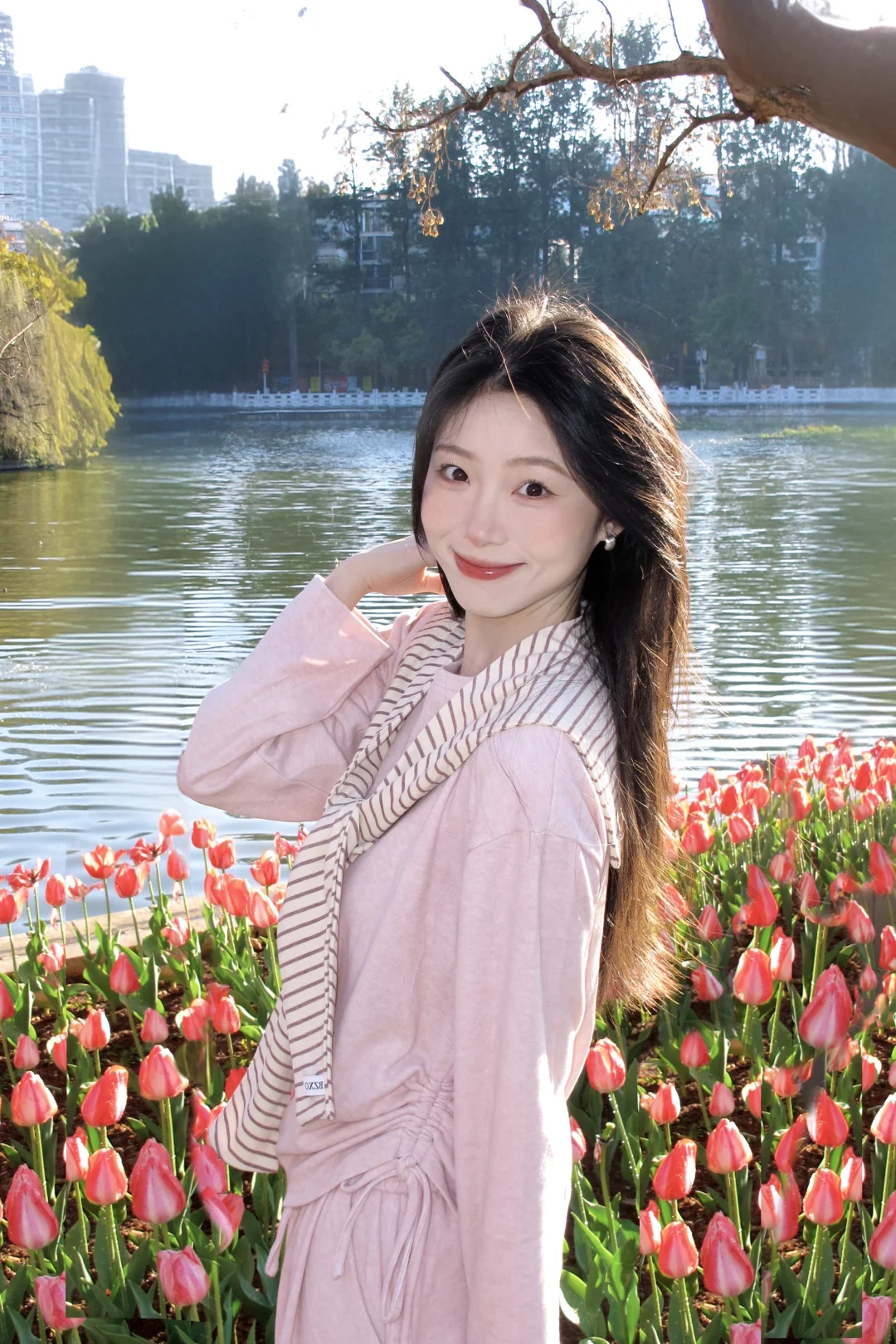 温柔粉穿搭,湖边漫步,静享美好时光