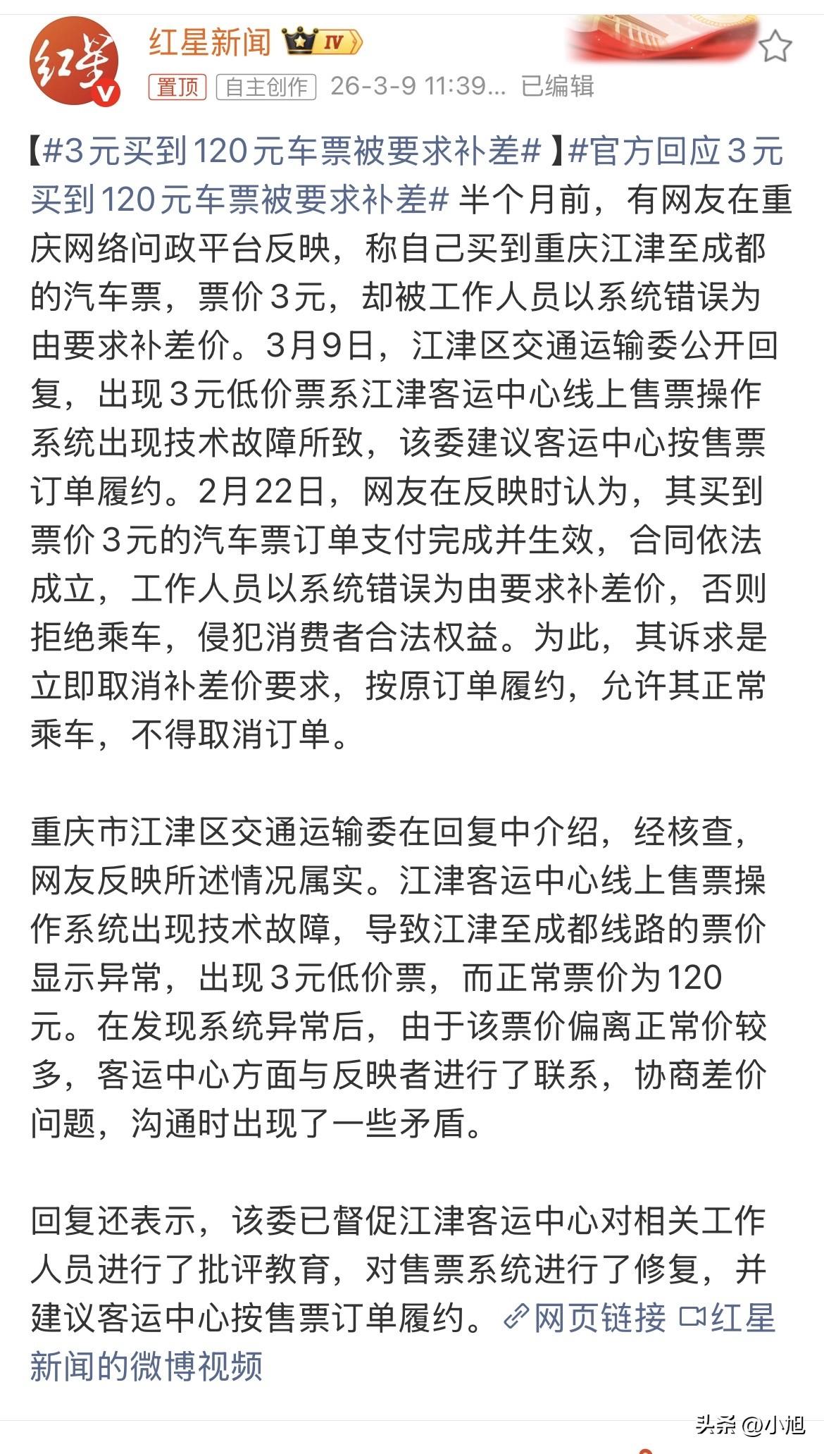 3块钱,从重庆江津到成都,全程两百多公里。这个价格别说油钱,连高速过路费的零头都不够。但有人确实买到了,手机支付,订单生成,截图留证,一切看起来都那么正规。 客运站的人后来找上门,说系统出错了,这票不能算数。 乘客当场就懵了。手机上白纸黑字付完款的票,凭什么你说不算就不算?又不是我把价格改错的。 双方就这么杠上了。 这事儿表面上看是钱的事儿,其实背后藏着两个完全不同的世界。 在乘客眼里,这是个再简单不过的交易。打开APP,看到价格,点击购买,支付成功。这套动作他做过几百次,从来没出过问题。手机屏幕上的“支付成功”四个字,在他心里就等于“这事儿成了”。 可客运站那边,看到的是另一番景象。 工作人员心里明镜似的,江津到成都,大巴跑一趟,油钱、过路费、司机工资、车辆折旧,七七八八加起来,成本摆在那儿。120块钱是正常价,3块钱连个盒饭都买不了,怎么可能拉你两百多公里? 这种心理拉锯,在无数个生活角落里都在上演。 超市标错价格,顾客抢着买单;加油站油价标错,车主排成长队;网站优惠券设置错误,一夜之间被薅秃了羊毛。每次出事,商家都想往回找补,消费者都想捡这个便宜。 谁对谁错? 法律其实说得挺明白。《民法典》第491条摆在那儿,订单支付成功合同就成立。《电子商务法》第49条也写了,经营者不能拿系统错误当借口。消费者权益保护法第10条更直接,公平交易权不能侵犯。 条条款款,清清楚楚。 可现实中,没几个人会当场翻法条。工作人员站在那儿,脑子里想的是:这人明知道票价不对还买,这不就是想占便宜吗? 乘客想的是:你系统出的错,凭什么让我买单? 两种想法撞在一起,谁也说服不了谁。 这事儿闹到问政平台,等官方给个说法。 半个月后,江津区交通运输委的人出来说话了。先查,确实是系统故障。再说,建议客运中心按订单履约。 这句话分量不轻。 官方没有和稀泥,没有说“双方各让一步”,而是直接把板子拍在了企业身上。系统是你客运站的,故障是你出的,出了问题你自己扛,别让消费者吃亏。 有个细节值得琢磨。官方回复里提到,客运站发现问题后,其实主动联系过这位乘客,想协商补差价的事儿,只是沟通的时候闹了矛盾。 也就是说,不是没沟通,是没沟通成。 为什么没沟通成?因为从一开始,双方的位置就不对等。客运站拿着“你占便宜”的道德大棒,乘客抱着“我依法办事”的法律盾牌,谁也攻不破谁。 这种对抗,在很多消费纠纷里都能看到。 现在结果出来了,官方站消费者这边。有人说这是给企业上了一课,系统维护不上心,出了事儿想甩锅,没门儿。也有人觉得这乘客就是运气好,碰上官方较真儿,不然这3块钱早就打水漂了。 但这事儿往深里想,其实不只是钱的问题。 这是一个关于规则意识的故事。电子订单不是一张废纸,支付成功不是一句空话。当越来越多的事情搬到线上,当手机屏幕成了我们和世界打交道的主要窗口,屏幕上那些“确认”“支付”“完成”的按钮,不应该只是一个形式。 它们背后,是契约,是信用,是一个社会运转的底层逻辑。 有人可能会说,不就一百多块钱吗,至于闹这么大? 至于。 因为今天可以是3块钱的车票,明天就可以是300块钱的机票,后天就可以是3000块钱的酒店订单。每一次“系统故障”,都在试探规则的边界。每一次“协商解决”,都在定义什么是公平。 官方这次的表态,把边界画清楚了。企业的问题企业扛,别让消费者当冤大头。 这对普通人来说,是个好消息。以后碰上类似的事儿,至少知道往哪儿说理。 江津客运中心那边,系统已经修好了,工作人员挨了批评,票还得让人家上车。这一课,上得值。 就是不知道,那位乘客后来坐那趟车的时候,心里是什么滋味。是捡了便宜的窃喜,还是维权重任在肩的庄严? 换你碰上这事儿,你是补那一百多块钱,还是跟客运站杠到底?