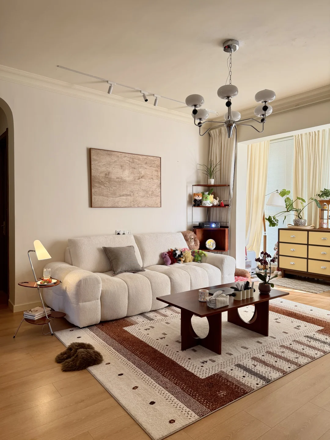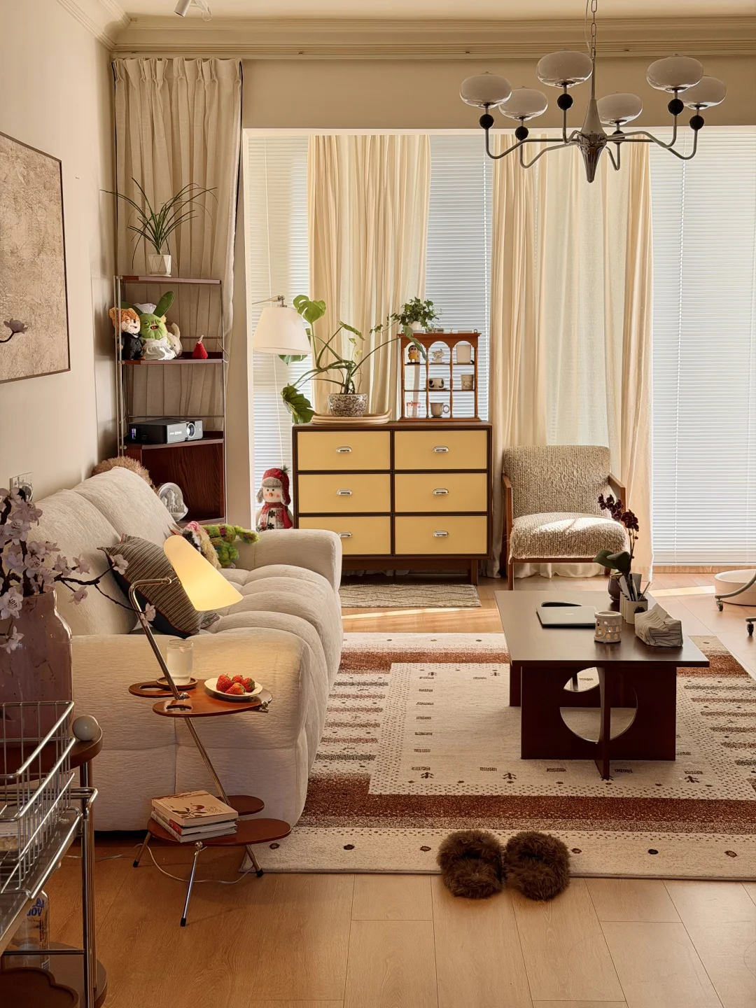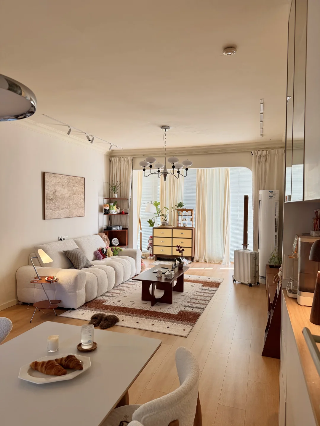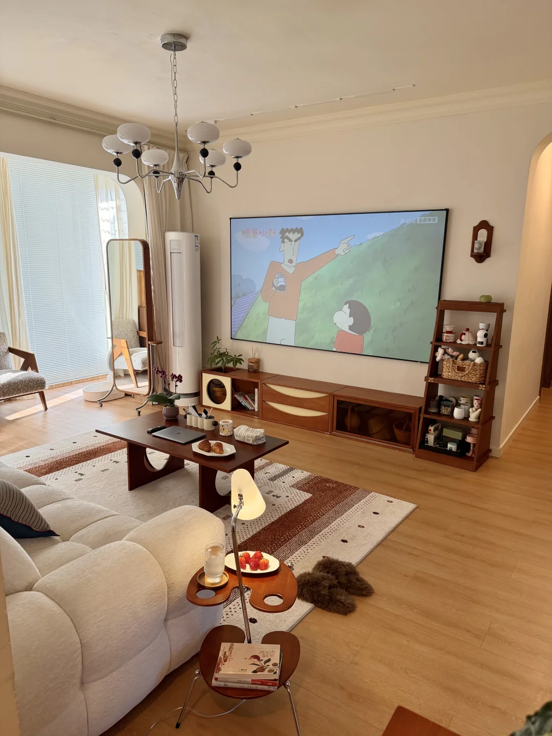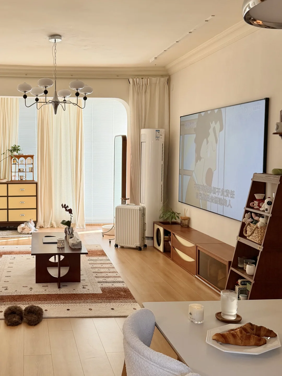 我家是自己改造的100平温馨偏中古的小家 不拆不砸,在原来的地砖上铺了木地板 封了窗,拆了落地窗,客厅连接了阳台,整体更通透显大。 没有吊顶,加装了射灯➕主灯 没有做电视背景墙,上墙的幕布更显得客厅宽阔些 墙面都是通刷的浅色漆,家具都是木质家具,樱桃木色,原木色都有 家里也添置了好几盆绿植🪴,春天了绿植们都有了新长的嫩芽🌱,让家里也增添了一丝春意 家不管大小,只要温馨住着舒适那便是极好的!