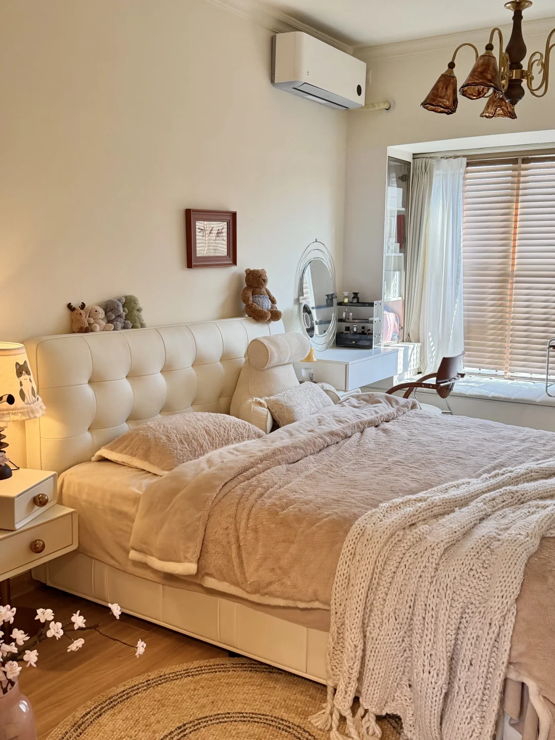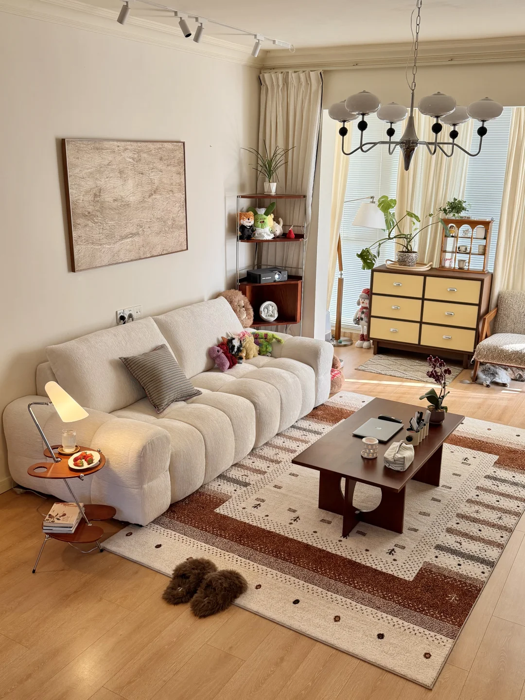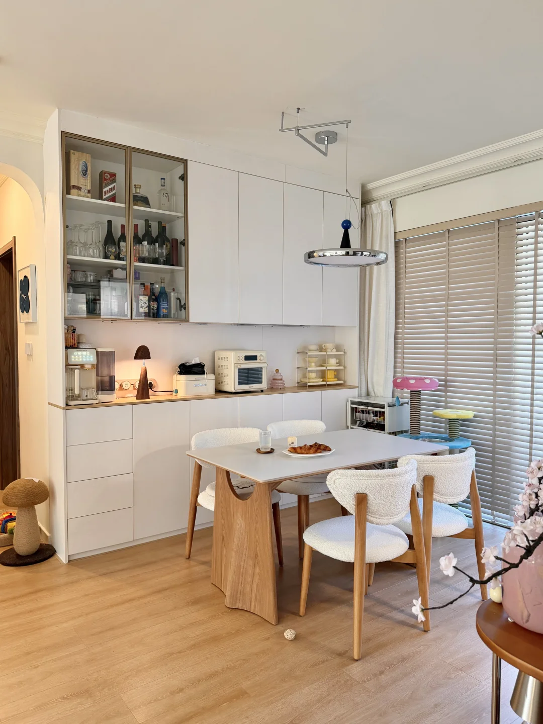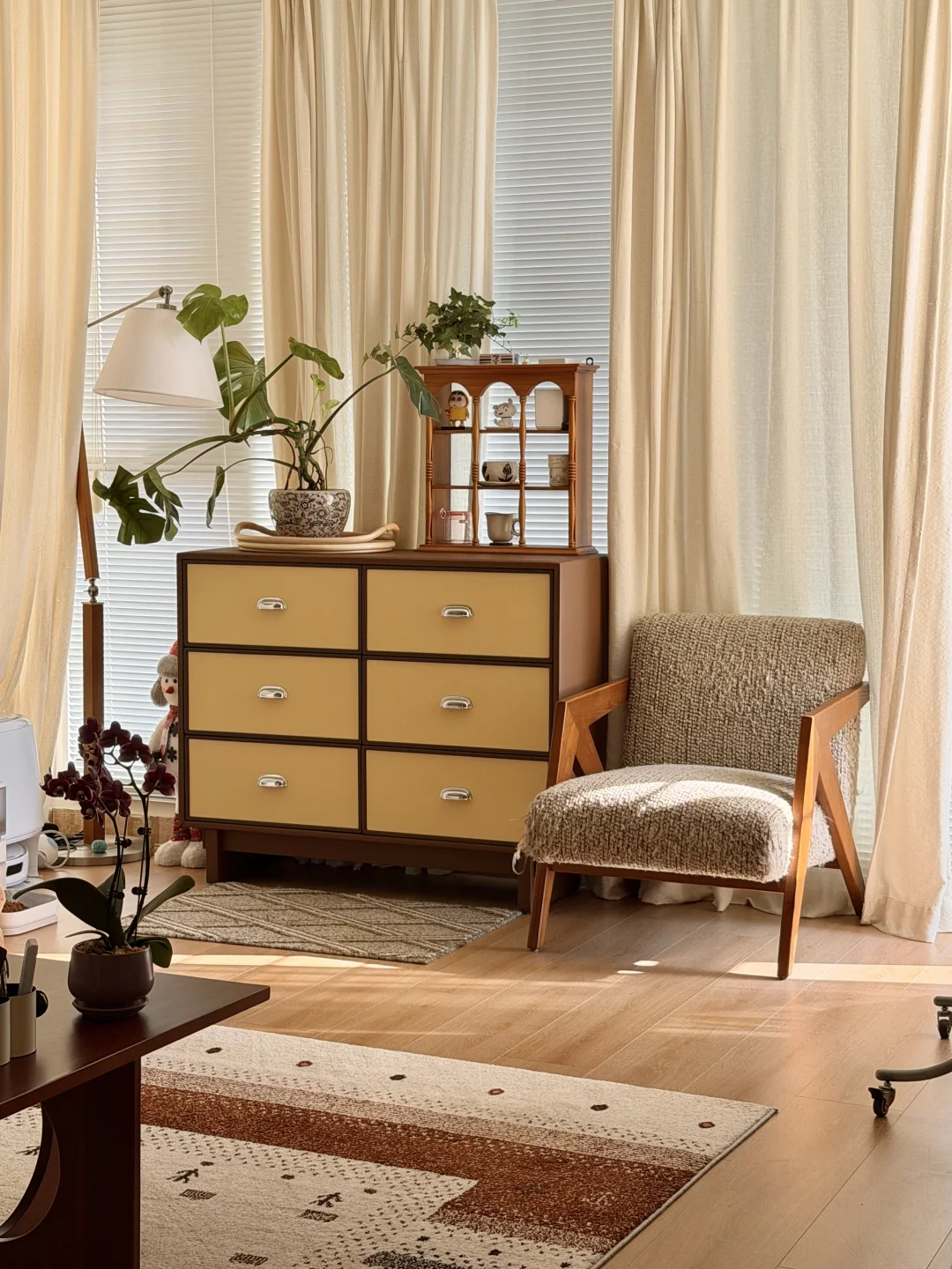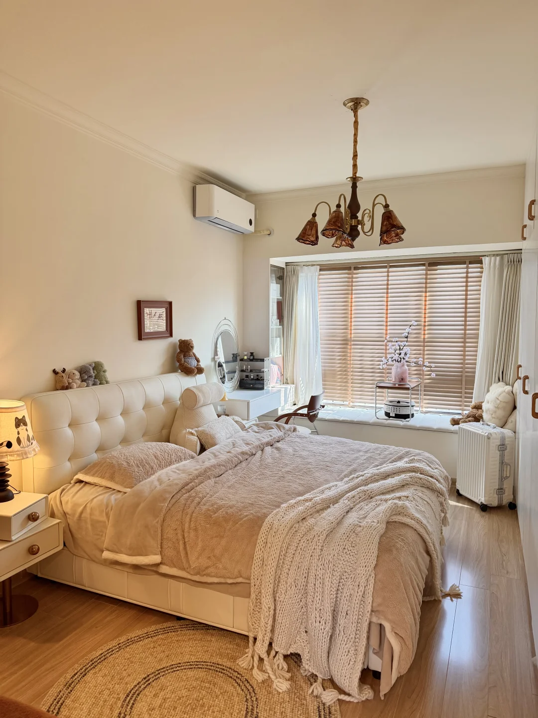 我家是自己改造的100平温馨偏中古的小家 不拆不砸,在原来的地砖上铺了木地板 封了窗,拆了落地窗,客厅连接了阳台,整体更通透显大。 没有吊顶,加装了射灯➕主灯 没有做电视背景墙,上墙的幕布更显得客厅宽阔些 墙面都是通刷的浅色漆,家具都是木质家具,樱桃木色,原木色都有 家里也添置了好几盆绿植🪴,春天了绿植们都有了新长的嫩芽🌱,让家里也增添了一丝春意 家不管大小,只要温馨住着舒适那便是极好的!