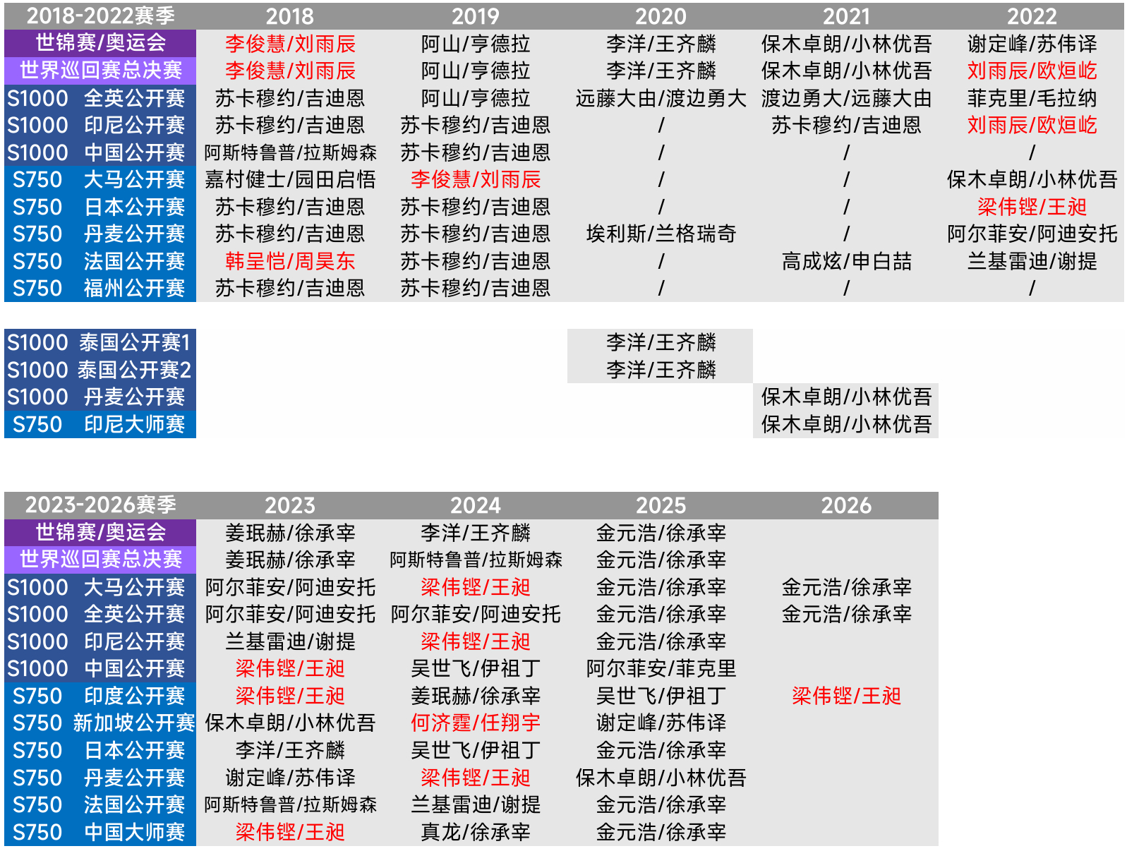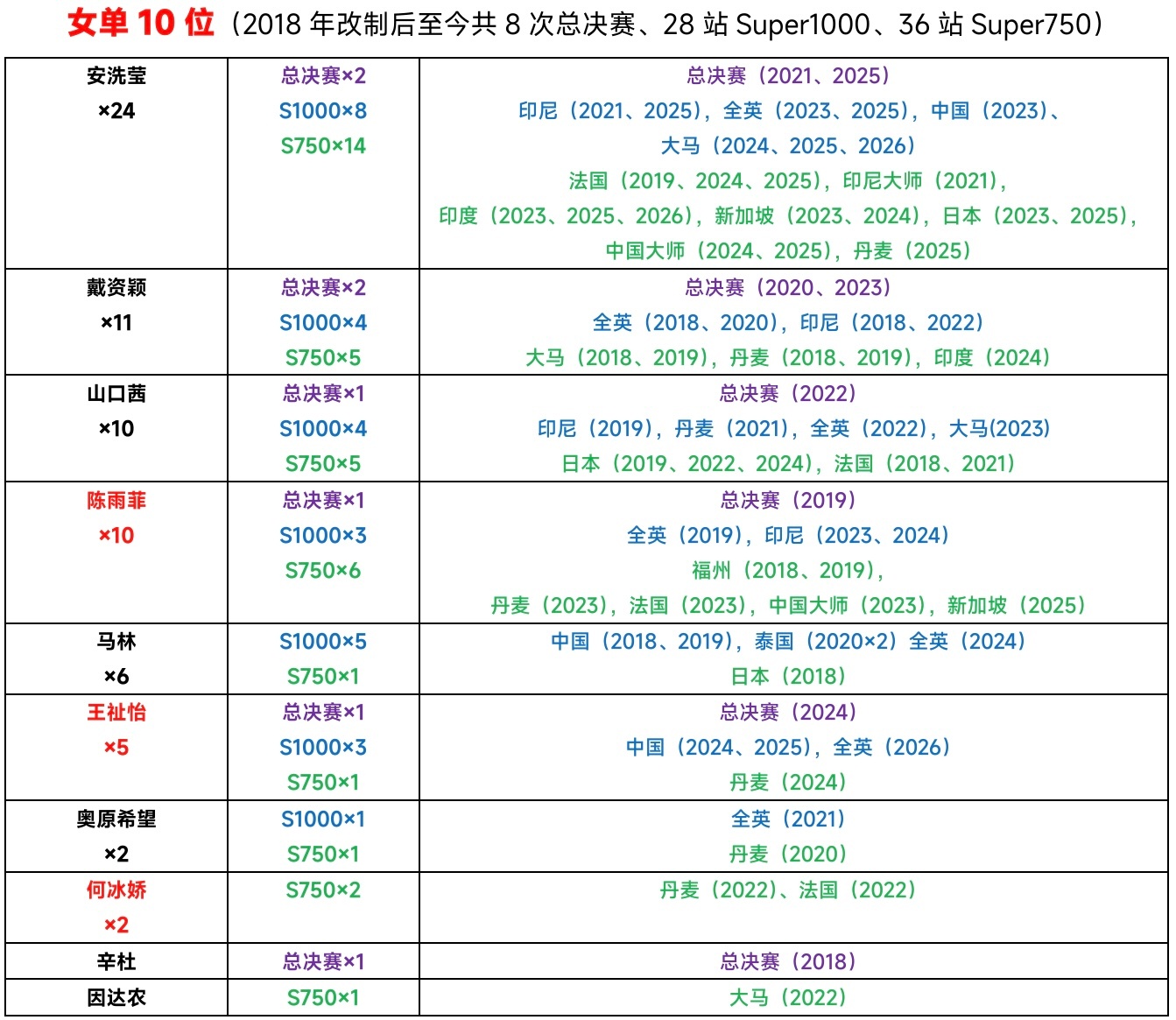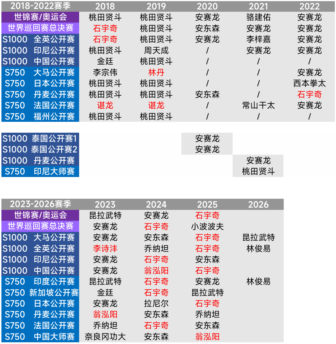 【2018年改制为世界巡回赛后的高级别巡回赛(含总决赛)冠军分布】截至2026全英羽毛球公开赛 结束