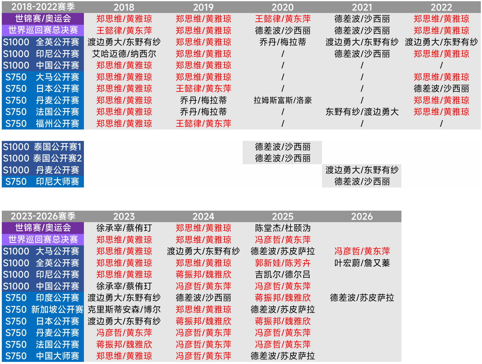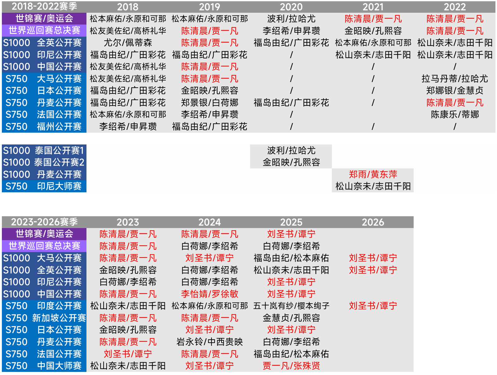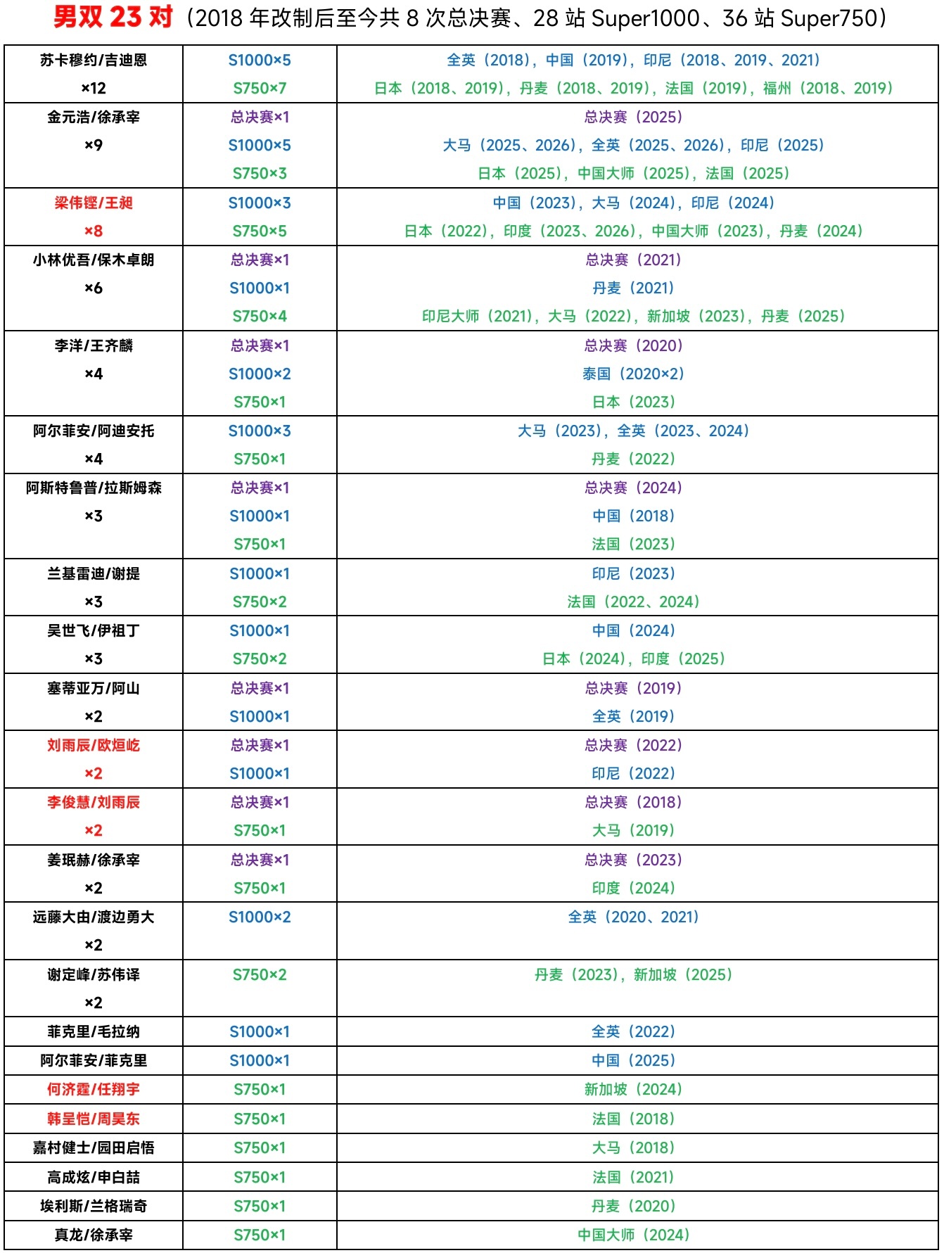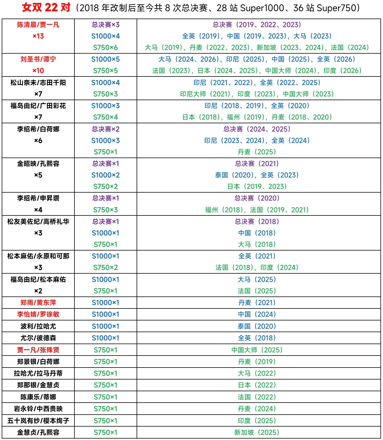 【2018年改制为世界巡回赛后的高级别巡回赛(含总决赛)冠军分布】截至2026全英羽毛球公开赛 结束