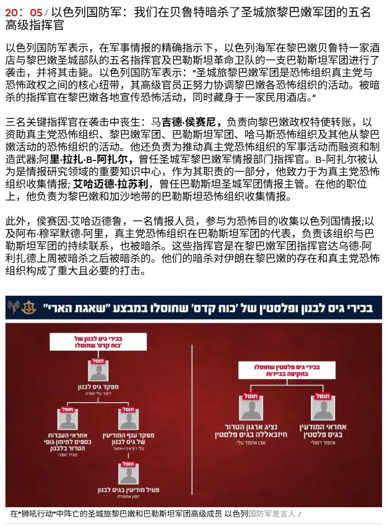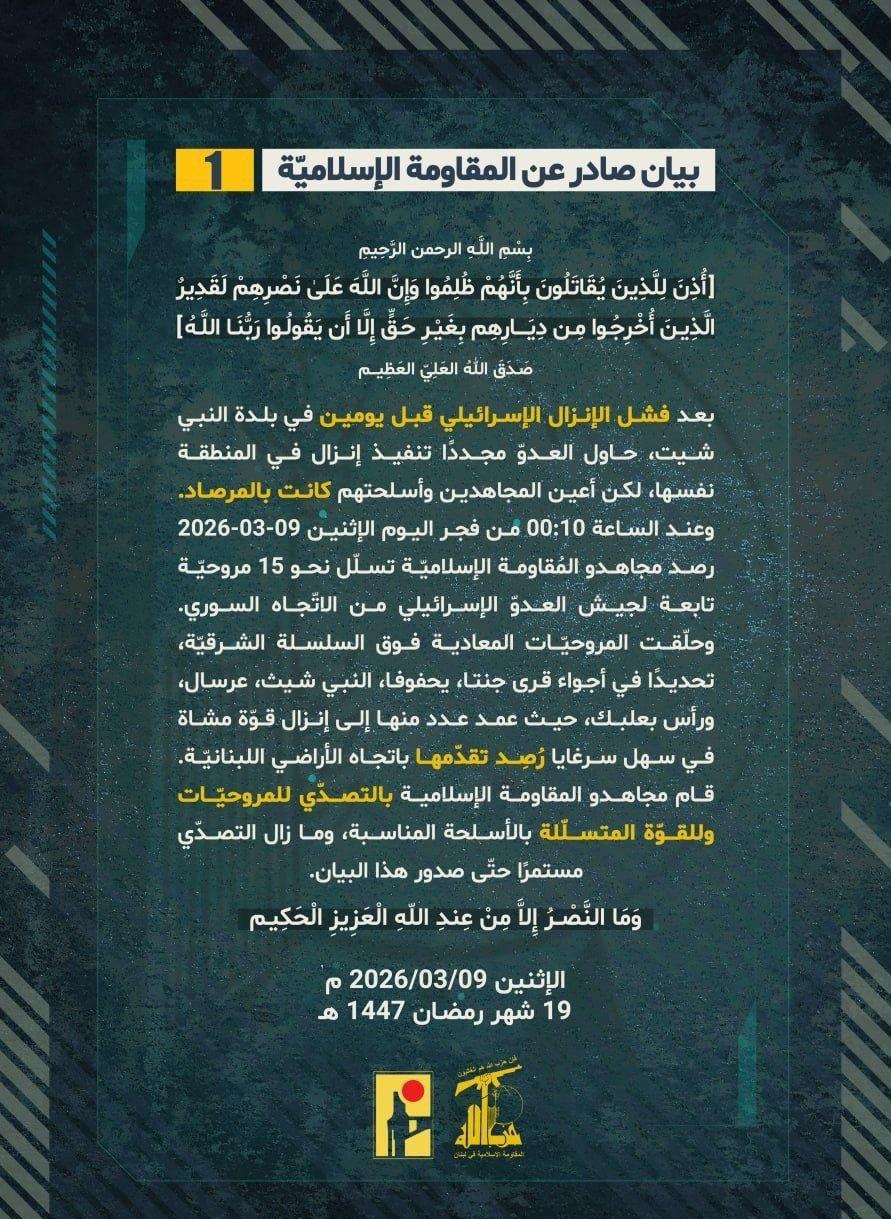 以色列空袭了黎巴嫩境内的巴勒斯坦人难民营“艾因·希勒韦”营地,造成2名黎巴嫩政府军士兵和3名平民死亡。 ​​​ 以色列军队在黎以边境集结的重武器。 ​​​ 以色列国防军:我们在贝鲁特暗杀了圣城旅黎巴嫩军团的五名高级指挥官 据伊拉克媒体报道,以色列国防军的突击队今天夜里在贝卡谷地纳比什特附近再次尝试机降行动,又被真主党武装发现,真主党武装人员随即向来袭部队开火。 据多家黎巴嫩媒体报道,交火中一架以色列直升机被击中,随后坠毁于沙拉地区。 伊拉克媒体将此次冲突描述为拉德万武装与以色列军队在贝卡地区持续交战的一部分,而Al-Mayadeen援引消息人士的话称,这架直升机是在冲突中受损的。 黎巴嫩真主党发布声明,确认其部队正在与今天再次试图大举机降的IDF部队激战中: 3月9日,黎巴嫩真主党发布声明称其部队再次与试图实施机降的以色列国防军部队发生激战: “两天前,以色列在纳比希特镇的机降行动失败后,敌人(以色列)再次试图在同一地区登陆,但圣战者们(黎巴嫩真主党武装)的眼睛和武器时刻保持警惕,严阵以待。 2026年3月9日星期一凌晨0点10分,伊斯兰抵抗运动的圣战者们(黎巴嫩真主党武装)发现约15架以色列敌军直升机从叙利亚方向渗透。敌方直升机飞越东部山脉,尤其是在詹塔、亚赫富夫、纳比希特、阿尔萨勒和拉斯巴勒贝克等村庄上空。其中一些直升机随后在萨尔加亚平原降落了一支步兵部队,该部队向黎巴嫩领土推进的行动被发现。伊斯兰抵抗组织的圣战者(黎巴嫩真主党武装)使用相应的武器与直升机和渗透部队交火,截至本声明发布时,战斗行动仍在继续。 2026年3月9日,星期一” 黎巴嫩“真主党”新发布的作战视频,使用反坦克导弹击中了以色列北部边境巴拉特穆斯塔德军事基地里的步兵目标。 黎巴嫩“真主党”昨天总计宣布了18次军事行动。 ​​​ 以色列空袭黎巴嫩首都贝鲁特,目标是什叶派的银行大楼。 ​​​ 黎巴嫩卫生部报告称,以色列空袭黎巴嫩南部城镇泰尔代巴和朱瓦亚,造成两名医护人员死亡,另有多人受伤。 ​​​ 黎巴嫩议会宣布在两年内暂停选举。 ​​​ 以色列第15新闻频道消息称,以军北方司令部正准备引进第162师在黎巴嫩境内作战。 ​​​ 以色列军方发布了拦截黎巴嫩无人机以及打击疑似火箭弹发射器的视频。 ​​​
