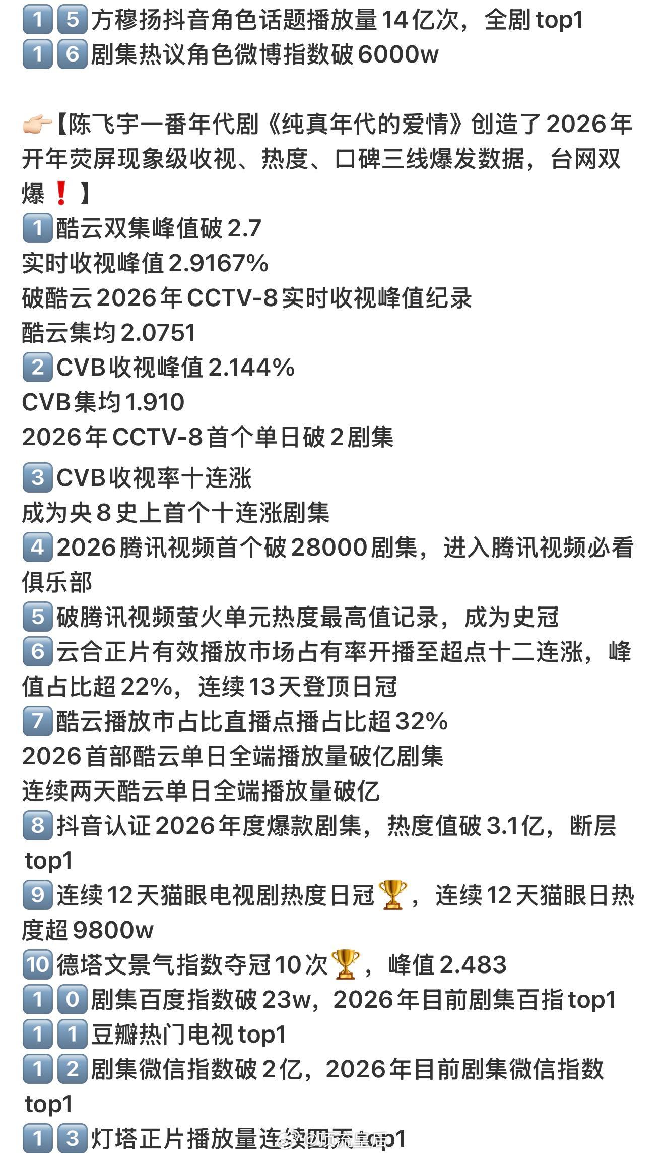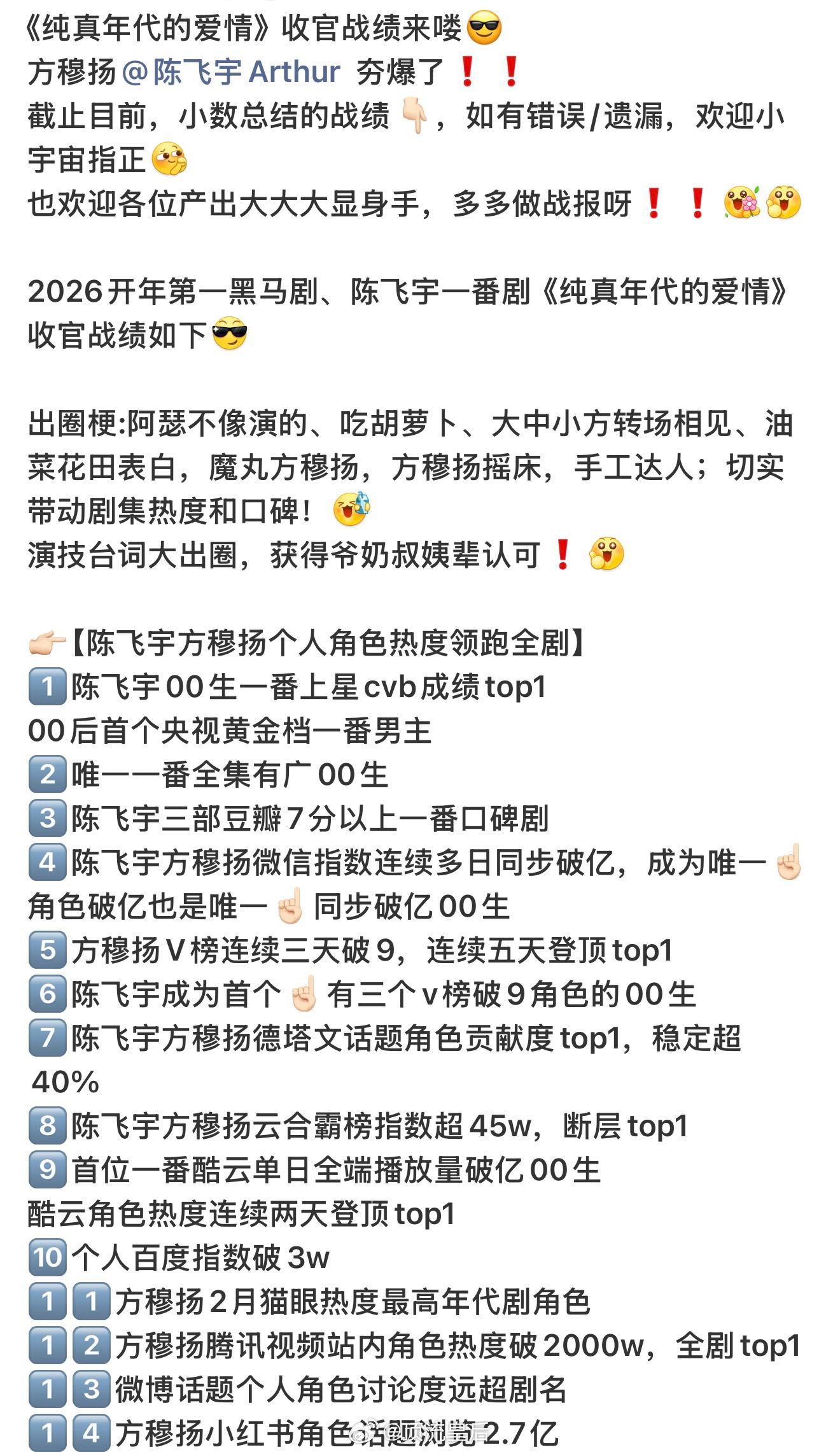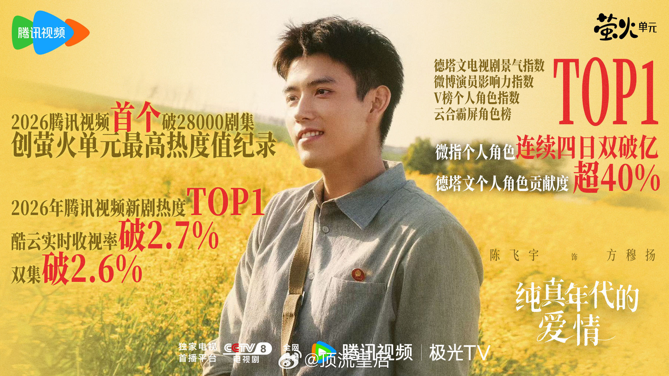 作为00后首个央视黄金档一番男主,陈飞宇油菜花田表白、魔丸方穆扬等名场面出圈,斩获爷奶叔姨辈认可,既扛得起央八收视大旗,又能引爆年轻社交平台。26开年陈飞宇诠释什么是真正的新生代扛剧能力!