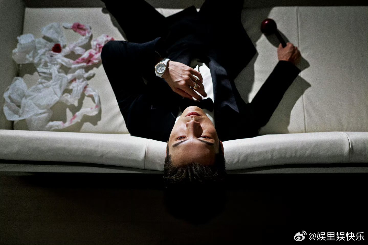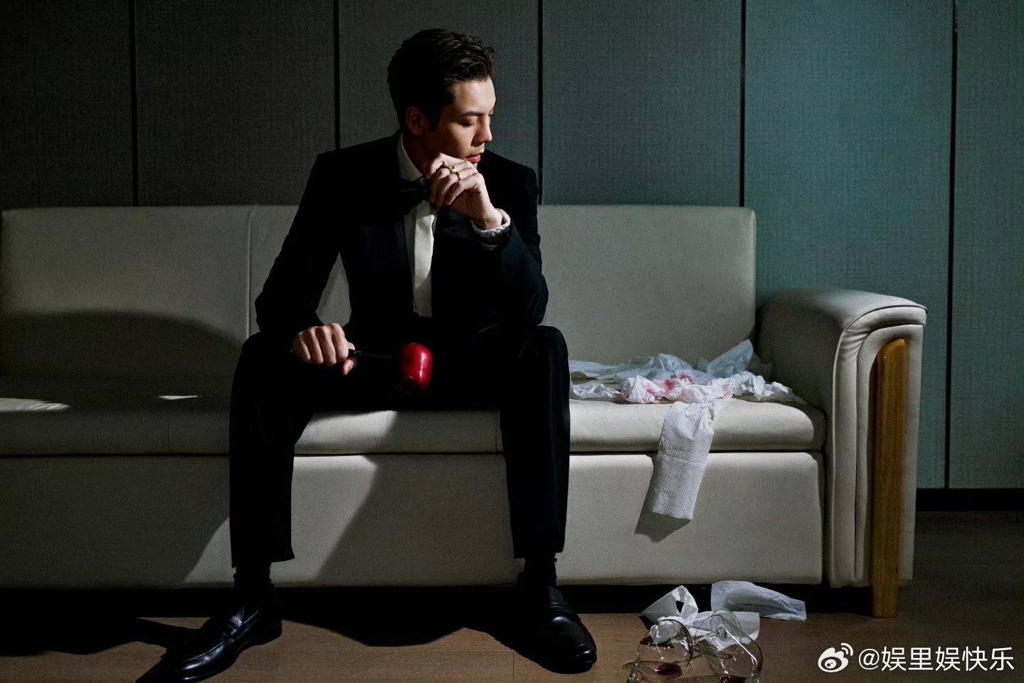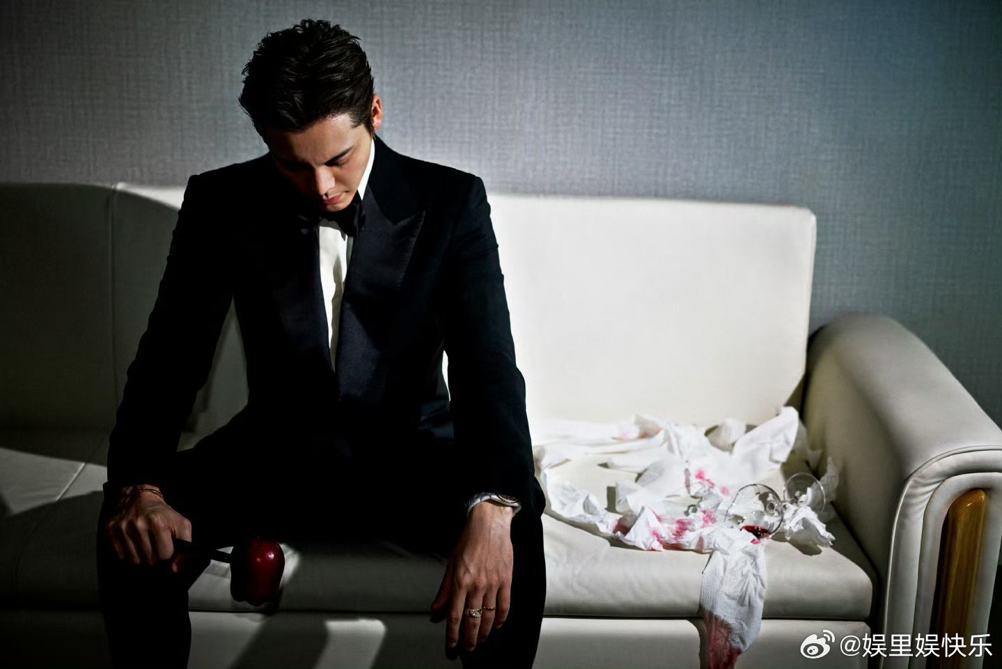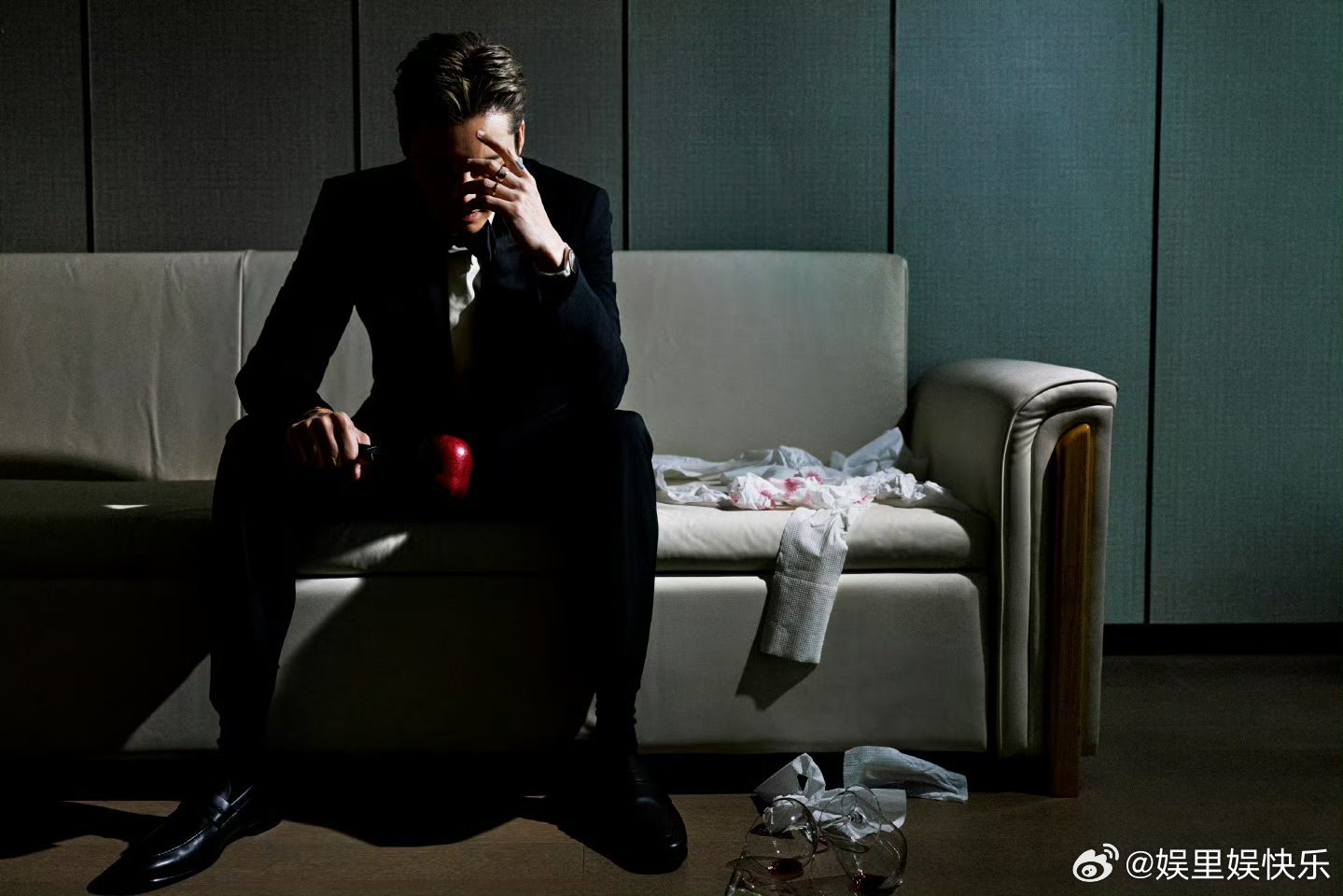 陈伟霆黑西装帅成啥了陈伟霆这张脸就该演霸总 陈伟霆黑西装造型张力拉满,光影勾勒出冷冽轮廓,半明半暗间尽显偏执疯批感,破碎苹果与倾洒红酒衬得氛围感十足,这脸演霸总简直天选