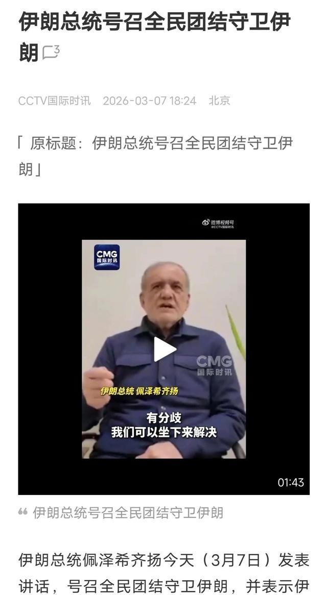 伊朗总统佩泽希齐扬发布声明,3月7日,中东战事进入第8天,伊朗总统佩泽希齐扬今天下午突然发布预录影片,就过去几天的攻击行为“向邻国致歉”,并声称:领导阶层已下令除非遇袭,否则不得攻击邻国。这话一出,整个国际舆论都炸了。很多人第一反应就是:伊朗这是扛不住了?打不过美以,认怂了? 3月7日当天,中东冲突打到第八天,伊朗本土多处军事目标被美以空军反复轰炸。佩泽希齐扬通过国家电视台播出预录讲话,直接向过去几天受到伊朗导弹或无人机波及的邻国道歉。他说明这些打击目标主要是美国在海湾国家的军事基地,比如卡塔尔乌代德空军基地、巴林第五舰队总部、沙特和科威特境内的美军设施。这些基地是美以战机起飞和导弹发射的主要平台,伊朗的反击不可避免会造成附带影响。他强调伊朗没有把邻国当成敌人,真正针对的是利用这些国家领土的外部势力。他宣布伊朗临时领导委员会6日开会决定,从现在起武装部队不再主动攻击邻国,除非邻国境内先有针对伊朗的袭击行动,这个命令已经下达到全军。他同时呼吁邻国一起维护地区和平,遵守国际法和人道原则,还警告某些武装团体不要当帝国主义的工具,跟美国和以色列走不会有好结果。讲话刚放出来没多久,卡塔尔就报告拦截到伊朗导弹,巴林和阿联酋等地也出现防空警报,国际媒体和社交平台瞬间炸锅。很多人直接解读成伊朗顶不住压力了,开始服软认怂。 但这个道歉其实不是简单投降。伊朗之前攻击邻国领土上的目标,核心原因就是这些地方被美国当成对付伊朗的前沿阵地。美军在中东部署了大量基地,从巴林到卡塔尔再到沙特、科威特、伊拉克、约旦,到处都有美军战机、导弹和后勤点。这些国家名义上是主权国家,但军事上很多时候身不由己,美国想用谁的地盘打谁就用谁的地盘,伊朗挨打后反击自然只能瞄准这些基地。历史上2020年苏莱曼尼在巴格达机场被美军无人机干掉,当时伊朗报复也是打伊拉克境内的美军基地,伊拉克夹在中间两头受气。这次情况类似,海湾国家被美国当肉盾,伊朗导弹过去难免伤及无辜。佩泽希齐扬这段话等于把球踢给邻国:我们不想跟你们过不去,你们别让美国用你们的地盘打我们,我们就不动你们。这不是认怂,而是给邻国一个台阶,也等于公开点明美国的玩法——把中东国家当棋子,让它们互相消耗,美国坐收渔利。 佩泽希齐扬的表态暴露了伊朗当前处境:一方面要避免把海湾国家全推到对立面,另一方面又不能在美以面前示弱。他拒绝无条件投降的说法很明确,说那是对方带进坟墓的幻想。整个事件的核心在于,美国在中东的布局靠的就是分裂和代理人战争,一旦邻国真听伊朗的把美军基地关掉或者限制使用,美国的控制力就崩了。但现实是这些国家很难下决心摆脱美国,因为经济、军售、安全承诺都绑在一起。佩泽希齐扬这段话把美国的霸权逻辑摊开给大家看,但能不能改变局面,还得看海湾国家会不会醒过来。短期看,战争还在继续,伊朗坚持打下去,不接受屈辱条件。