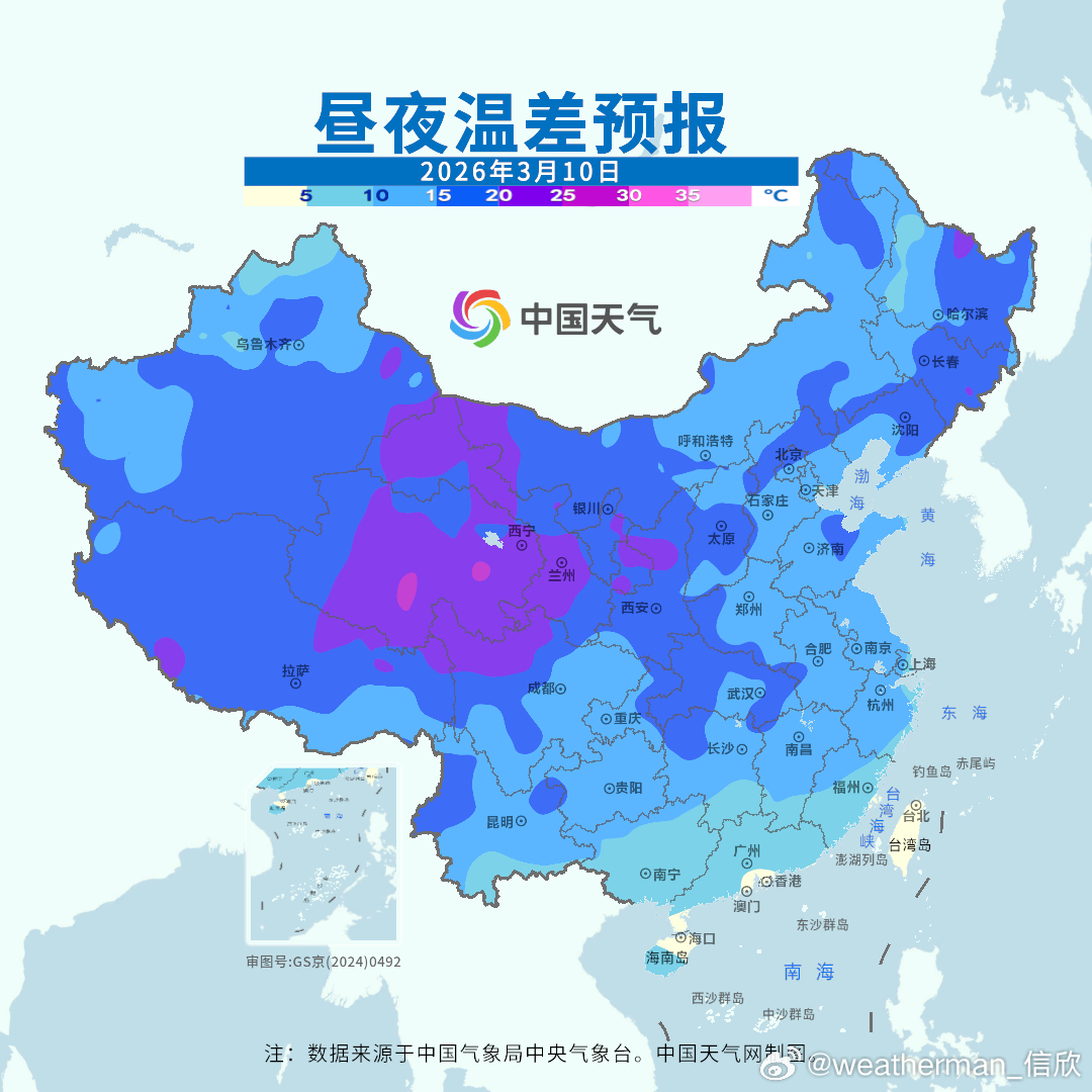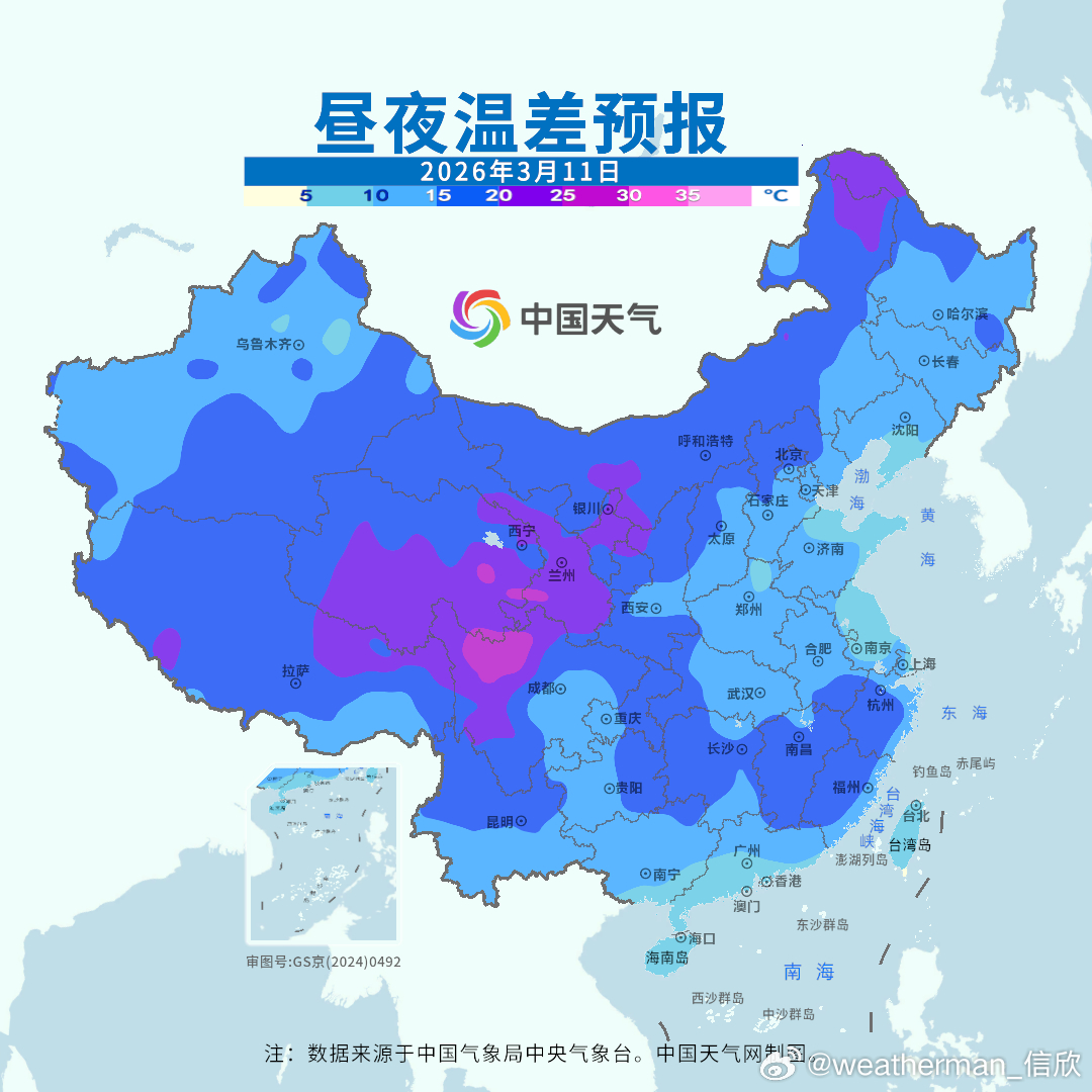 【昼夜温差加大&冷空气蓄势待发】明天早晨南方很多地方气温还会小幅下降,对应弱冷空气南下和夜间晴空辐射降温,但白天晴空光照加热使得南方多地气温明显回升。因此昼夜温差加大。后天白天比早晨升温更多,南方昼夜温差继续加大,多地会超过10℃甚至15℃。