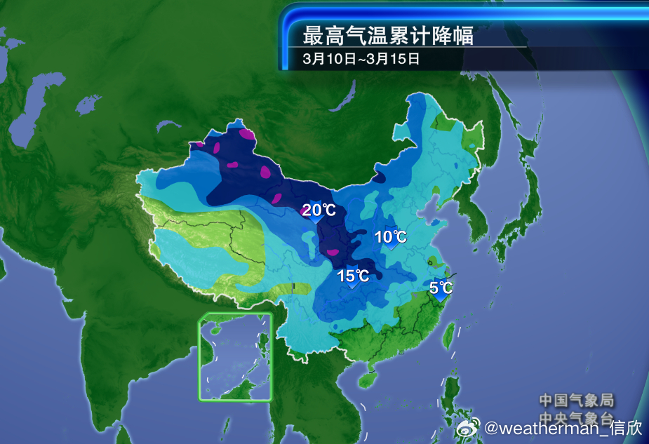 之后冷空气主体不断东移,缓慢扩散南下,12-14日强降温会自西向东波及北方多地,而且14-15日降温向南可以推进到长江流域。总体来看,冷空气南下动力不足,西北地区降温前升温显著,也更靠近冷空气源头,因此将是未来降温过程中,降幅最大区域。